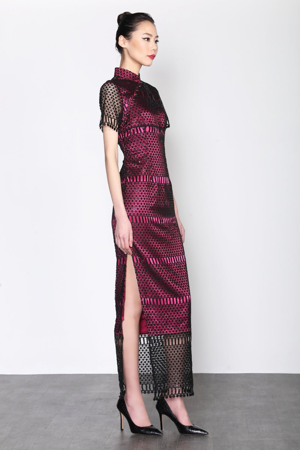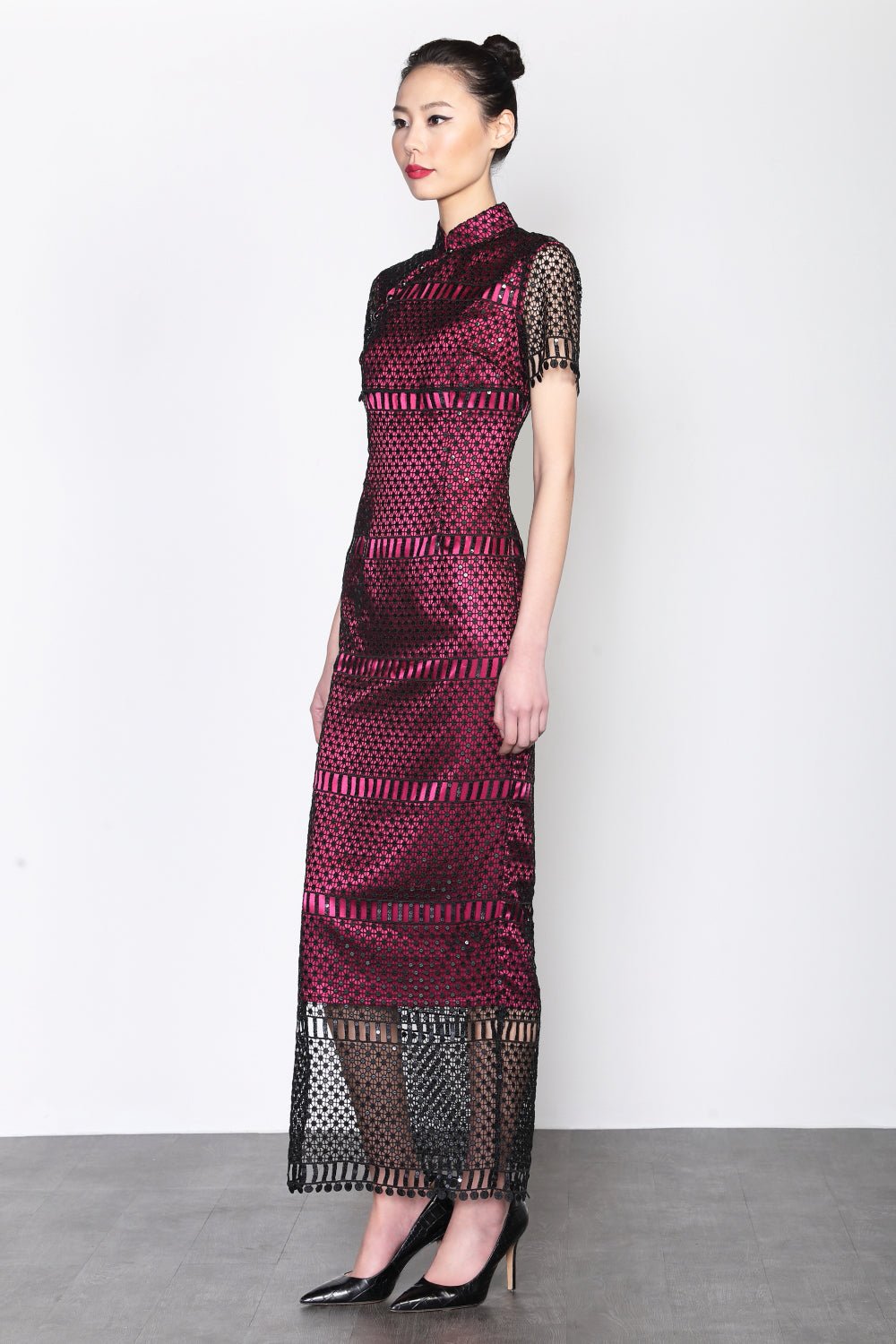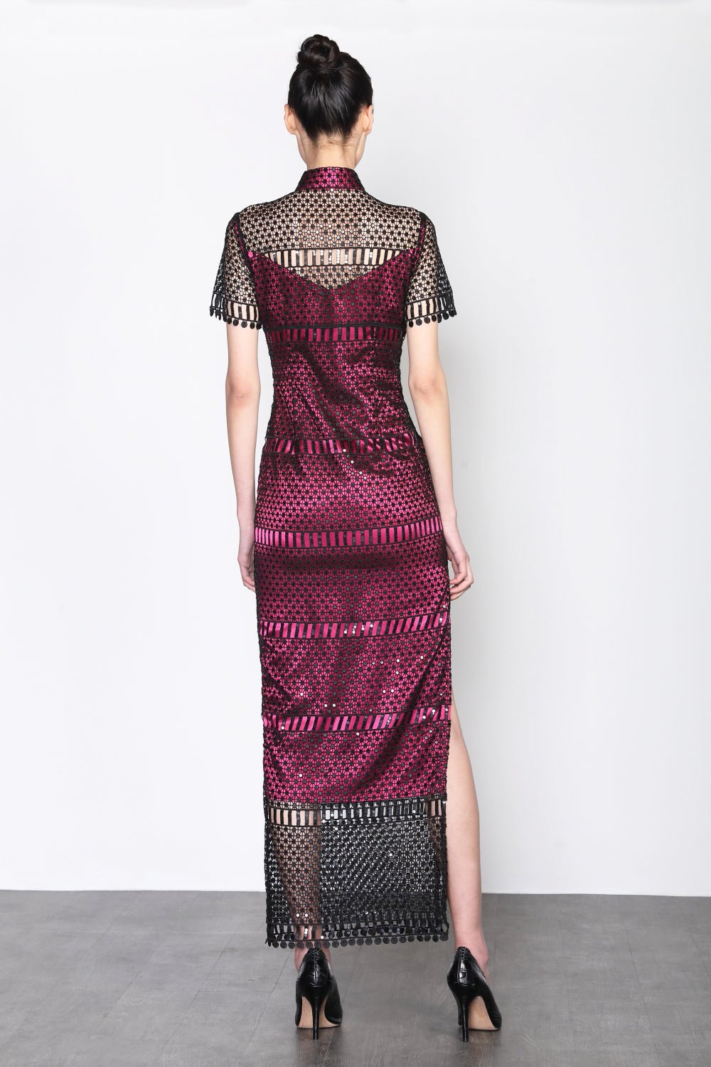 這款短袖長旗袍飾有黑色亮片蕾絲 .搭配撞色桑葚緞襯裡。正面飾有金屬紐扣 .更添亮點。