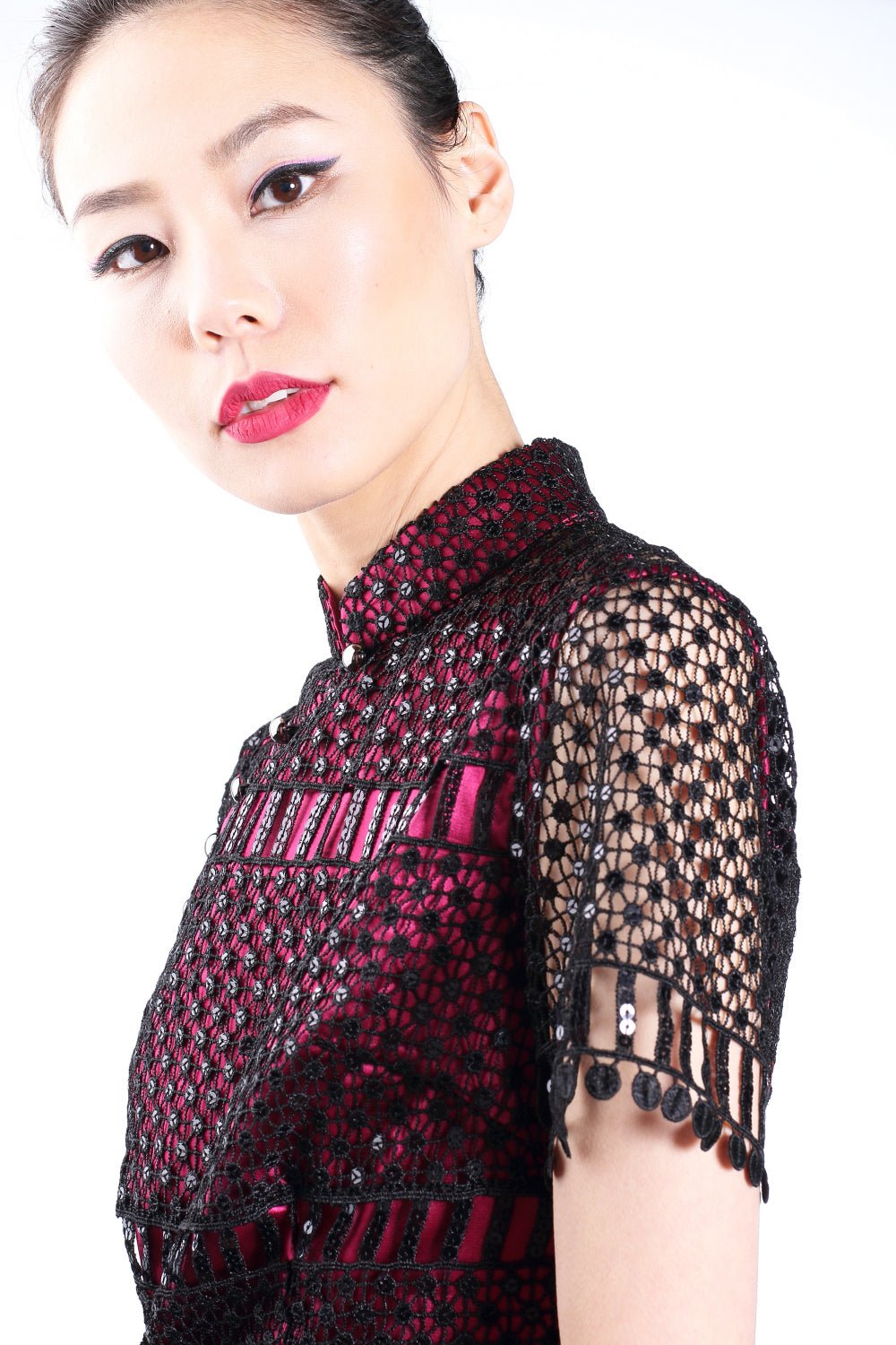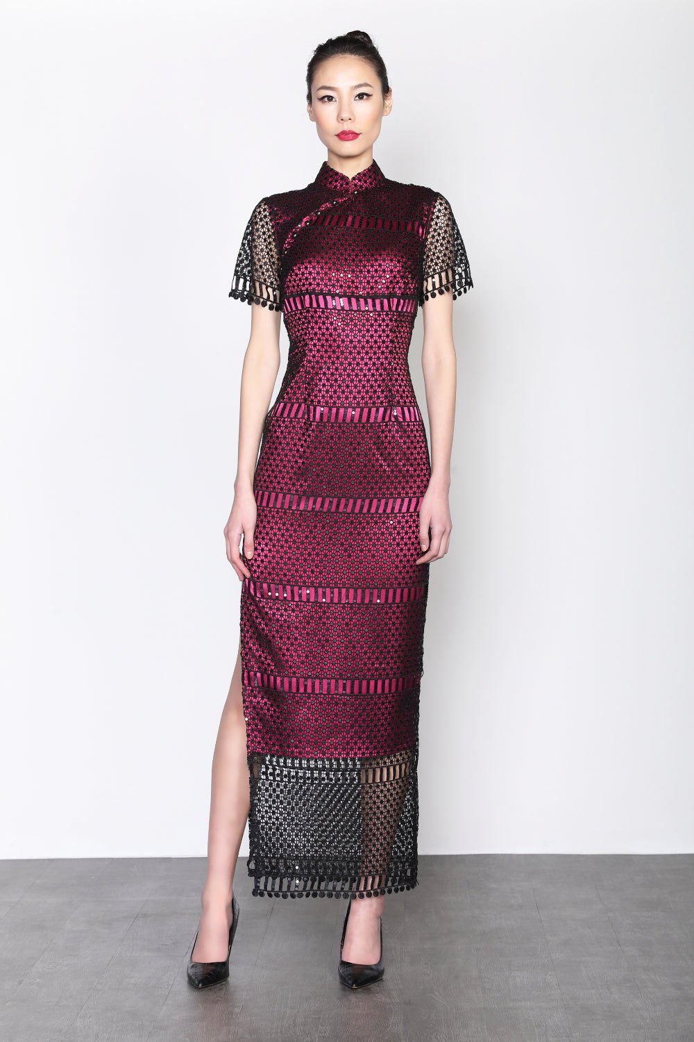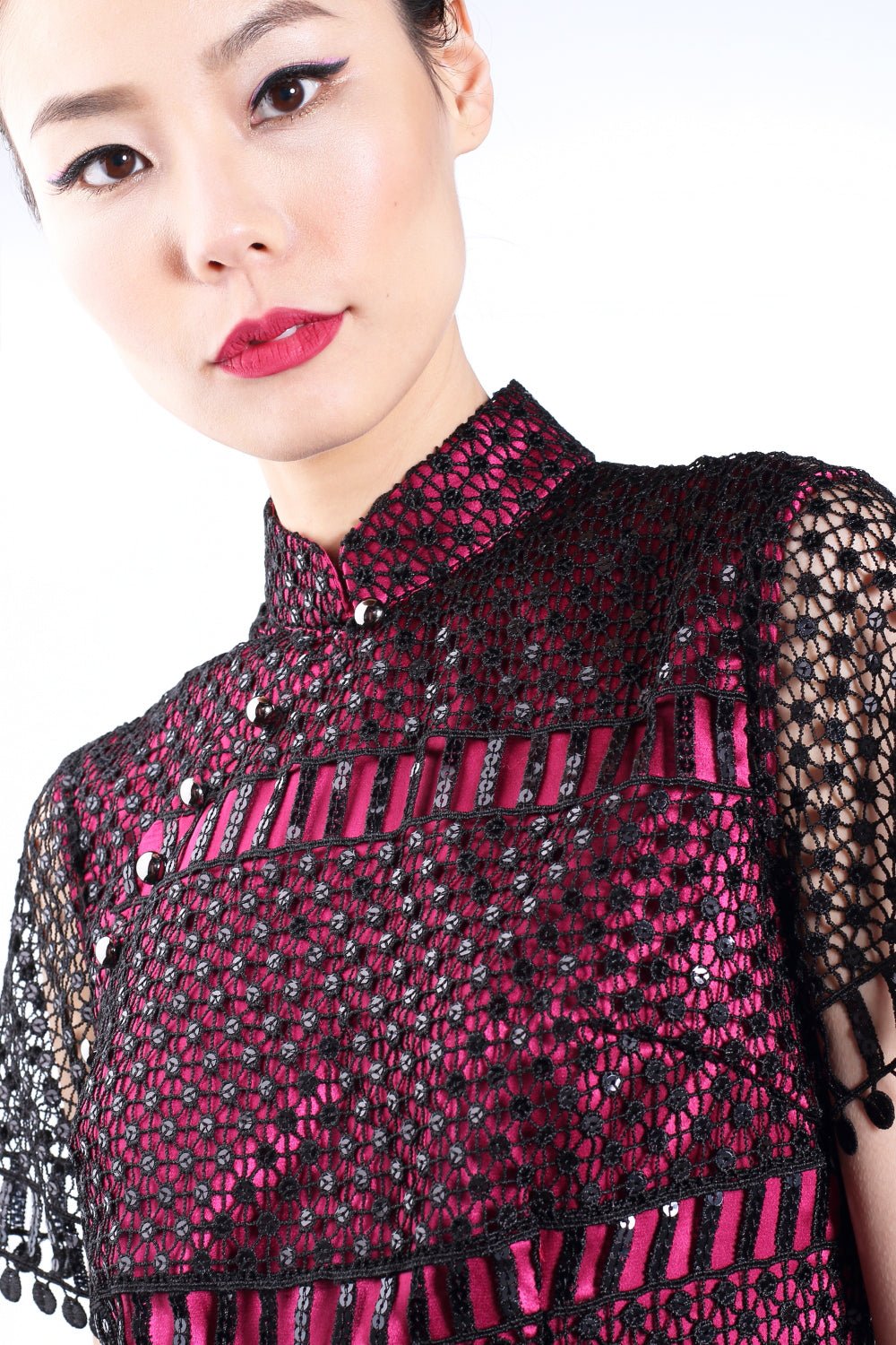 這款短袖長旗袍飾有黑色亮片蕾絲 .搭配撞色桑葚緞襯裡。正面飾有金屬紐扣 .更添亮點。