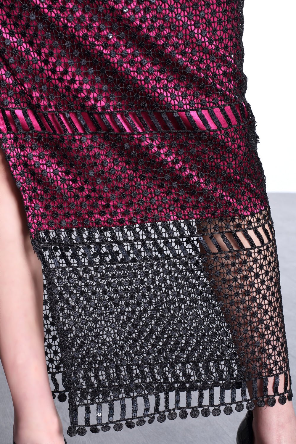 這款短袖長旗袍採用黑色亮片蕾絲和對比色桑蠶絲緞襯裡。正面飾有金屬紐扣作為擴展。