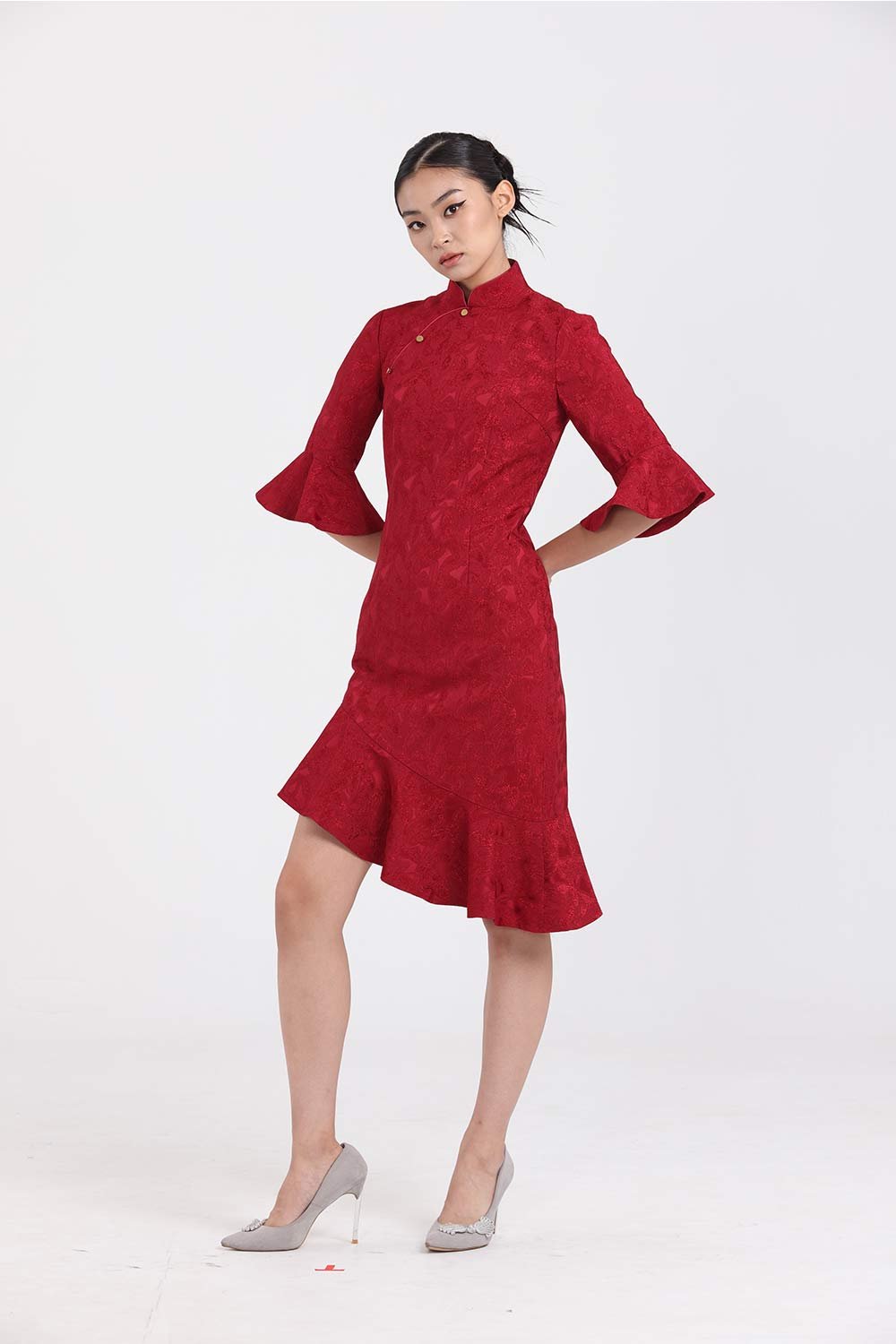 這款旗袍的特點是提花面料和美人魚下擺 .增強了旗袍的現代風格。 yi-ming簽名金拉鍊