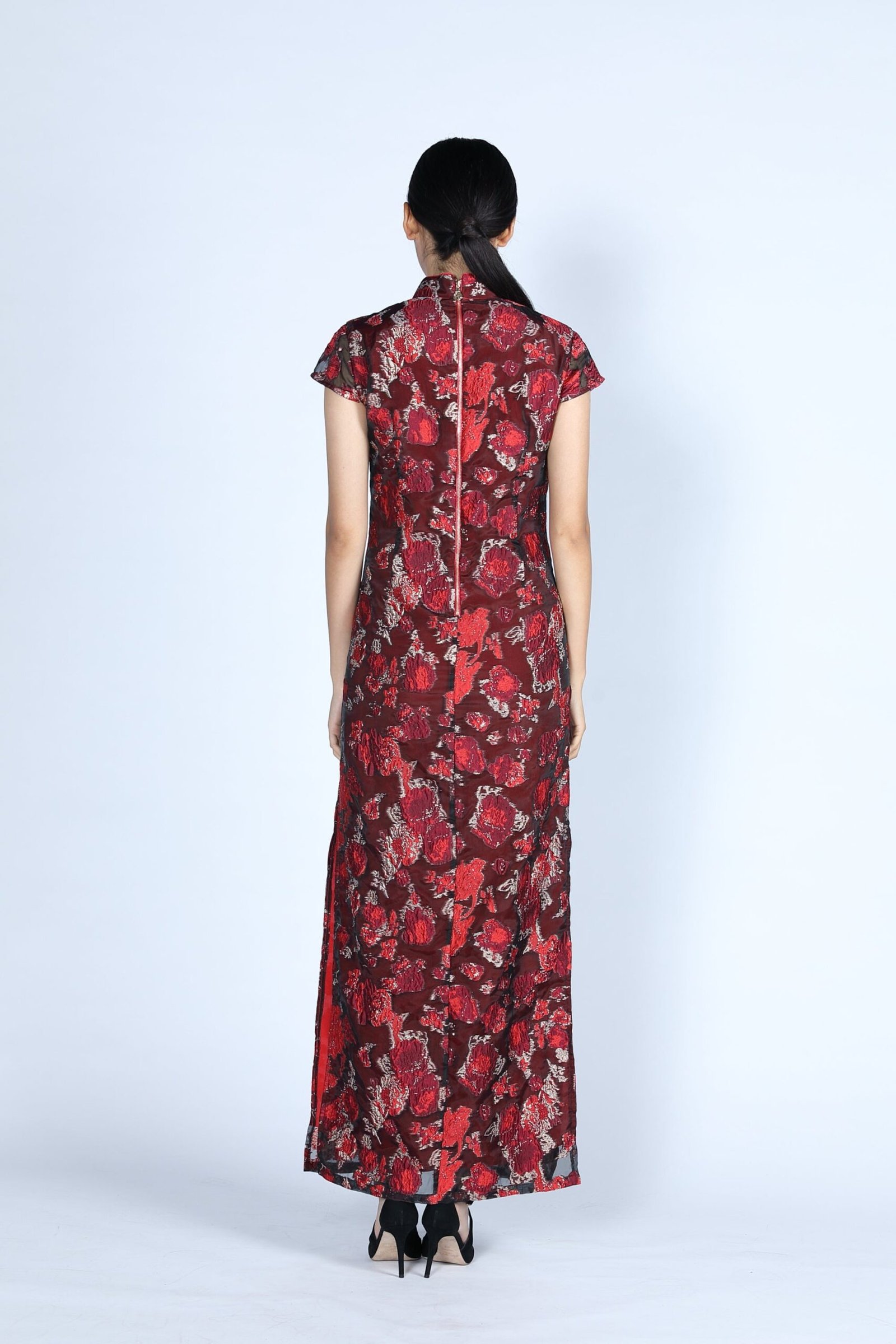 紅色和金色刺繡歐根紗長旗袍 .帶袖子 .飾有綠色翡翠鈕扣。Yi-ming標誌性金色拉鍊 .中後封。給人一種帶有現代感的傳統東方印象。可以搭配外套。這是參加聚會的理想旗袍。 span> p>