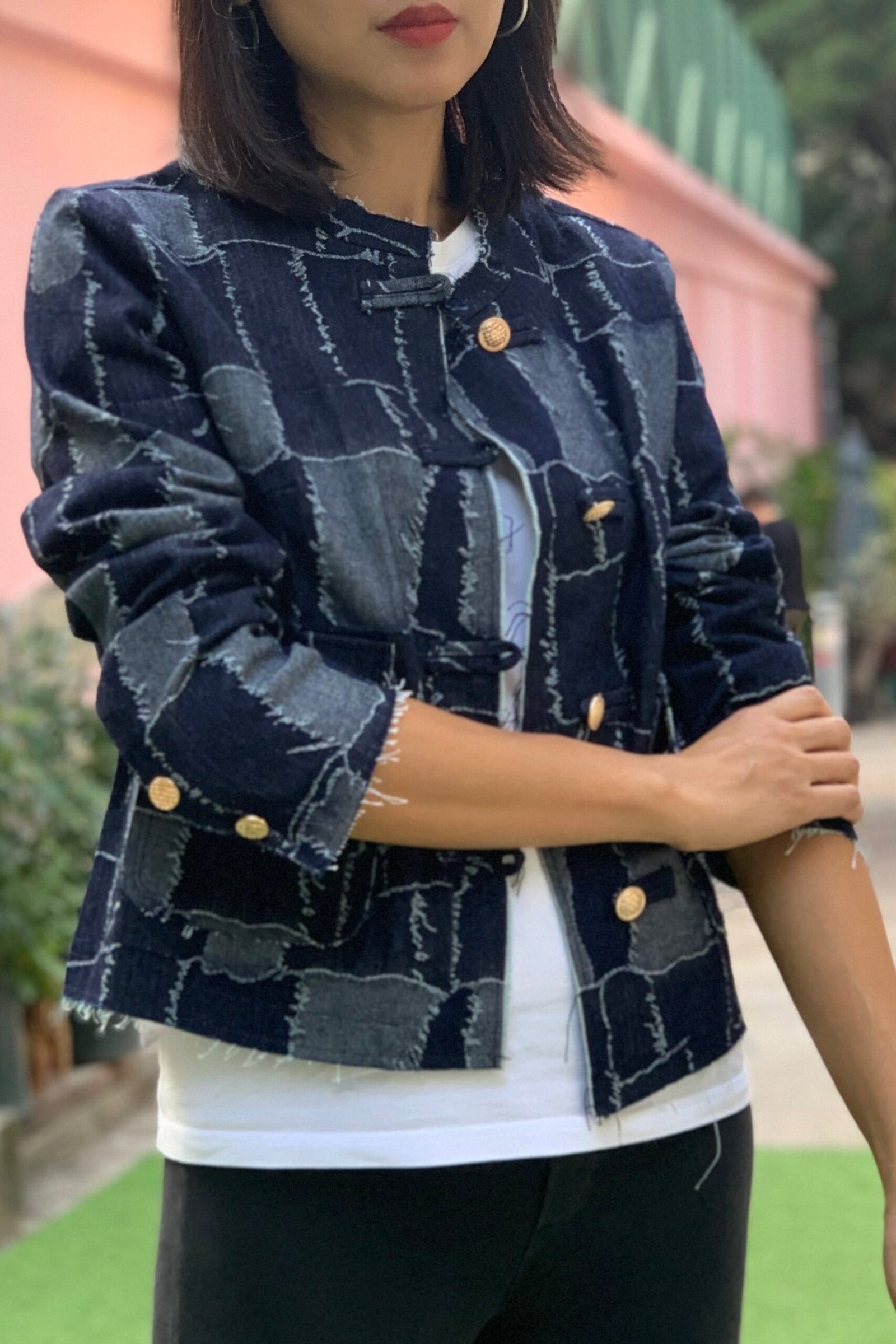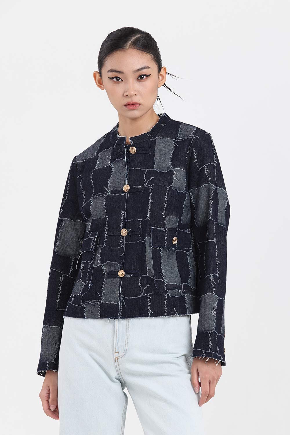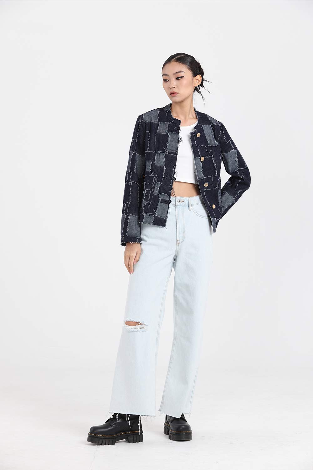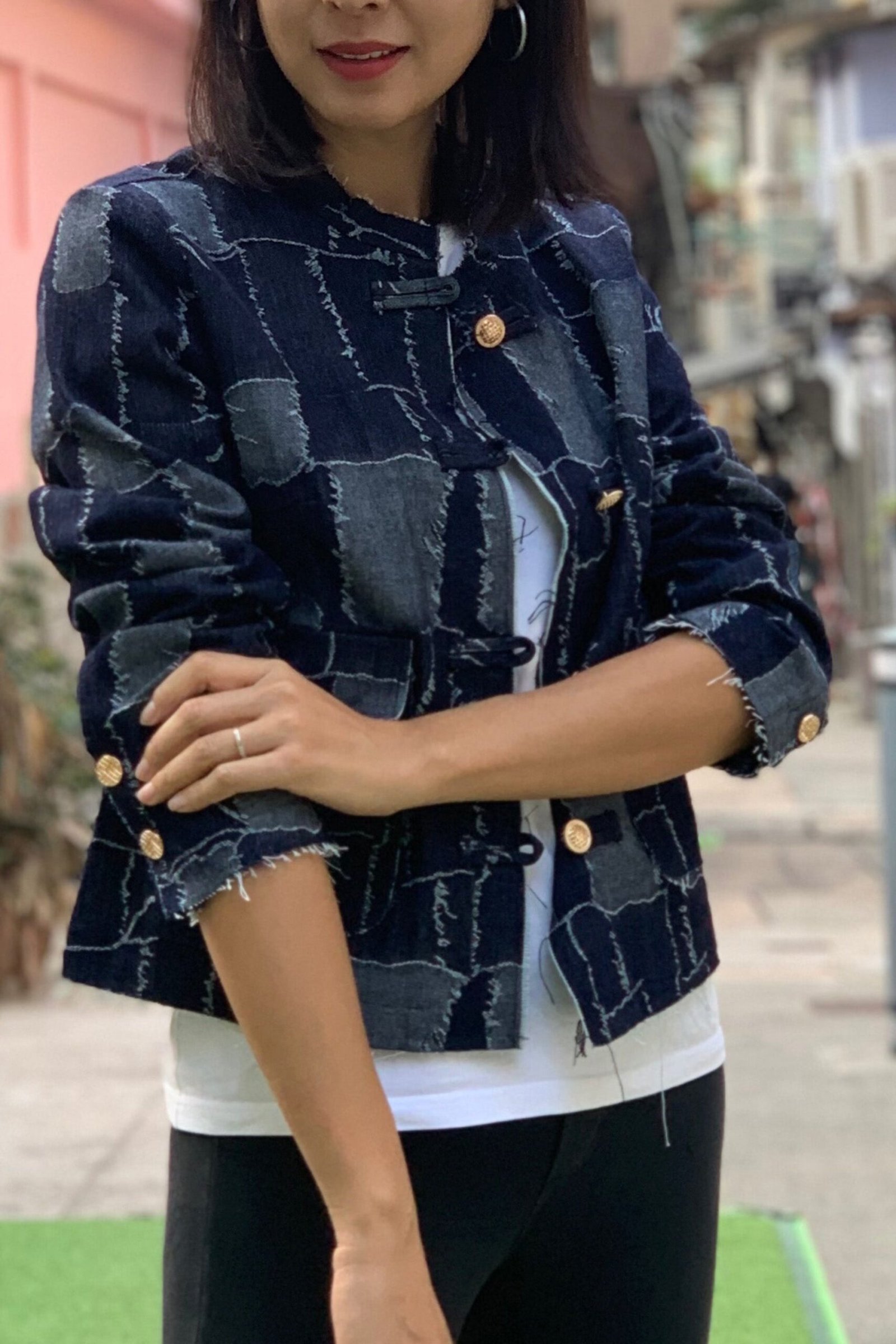 雙色牛仔布帶出立體的層次美感 .短身及腰部設計令裙子更加輕便 .兩側袋扣方便攜帶隨身物品 .前中一個中式一字排樓及口金色紐帶閃爍耀眼 .適合喜歡時尚混搭的你 .可配襯裙及褲子 .是一件時尚型格的百搭裙子。
