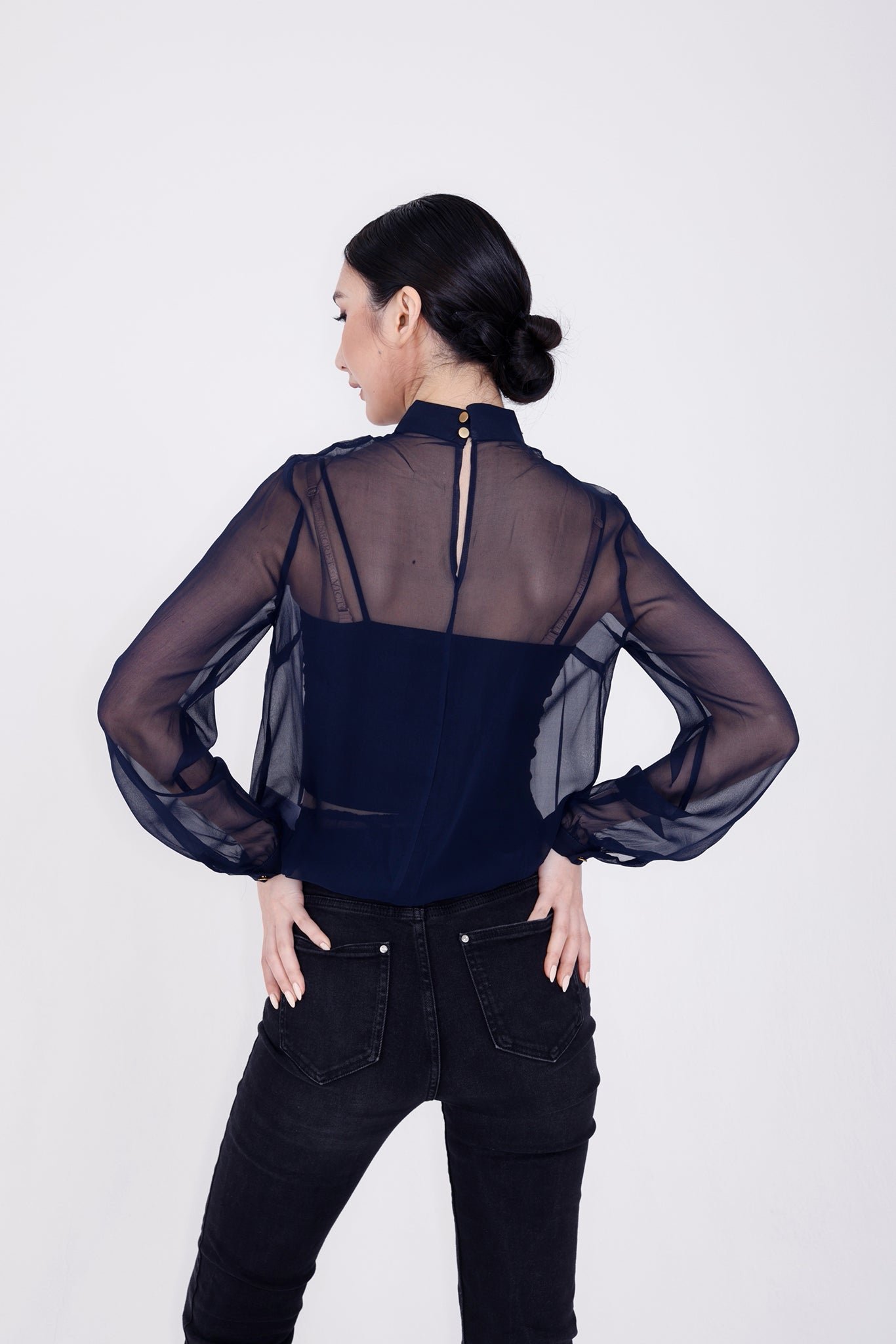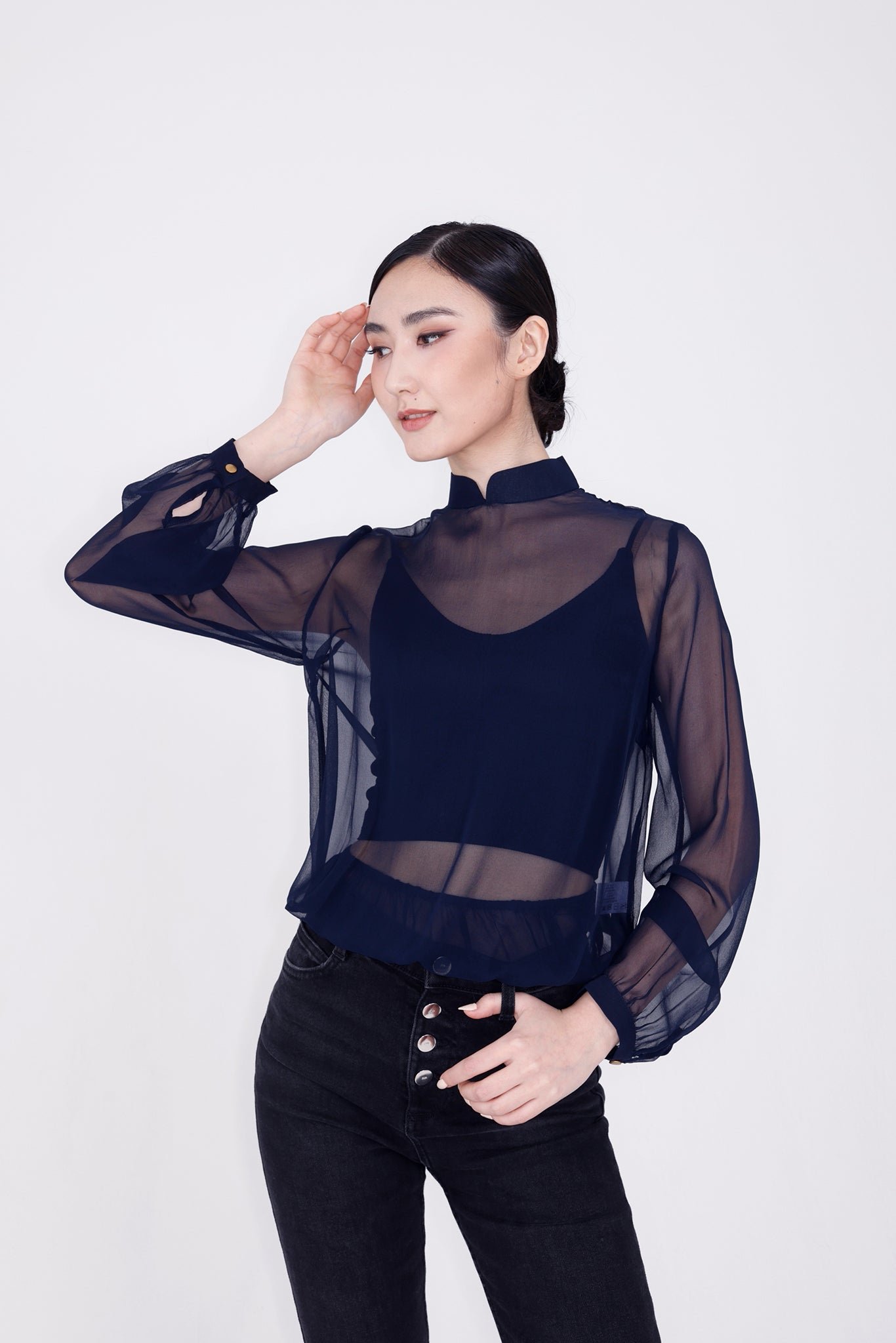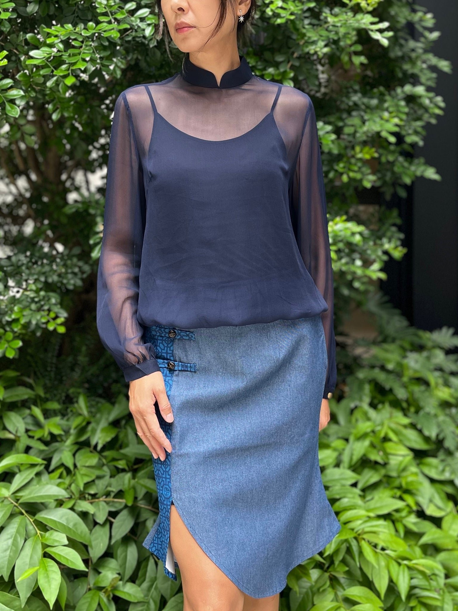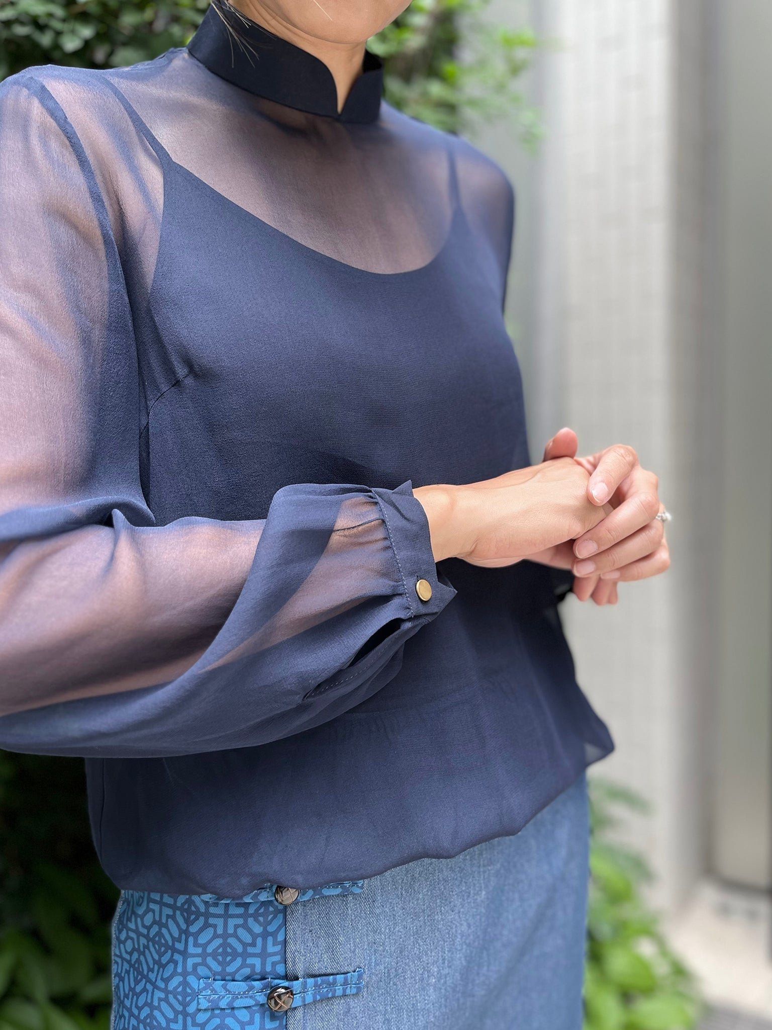 用這款精緻的海軍藍絲綢提升您的風格 透視雪紡襯衫。採用100%純真絲製成 .搭配精緻的中式立領和長袖。襯衫下擺彈性十足 .穿著舒適靈活。金色羈扣裝飾更添魅力 .透視布料更顯迷人。搭配吊帶背心 .打造時尚優雅的造型。