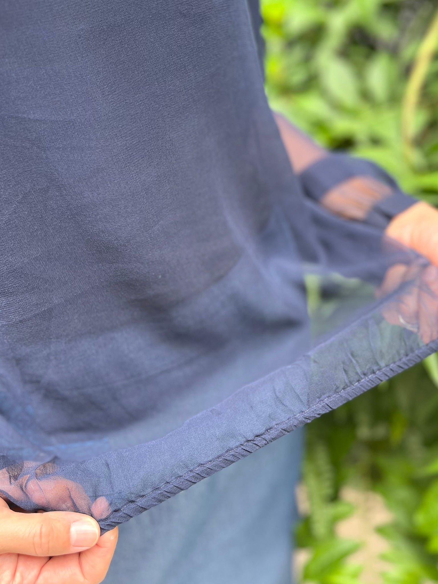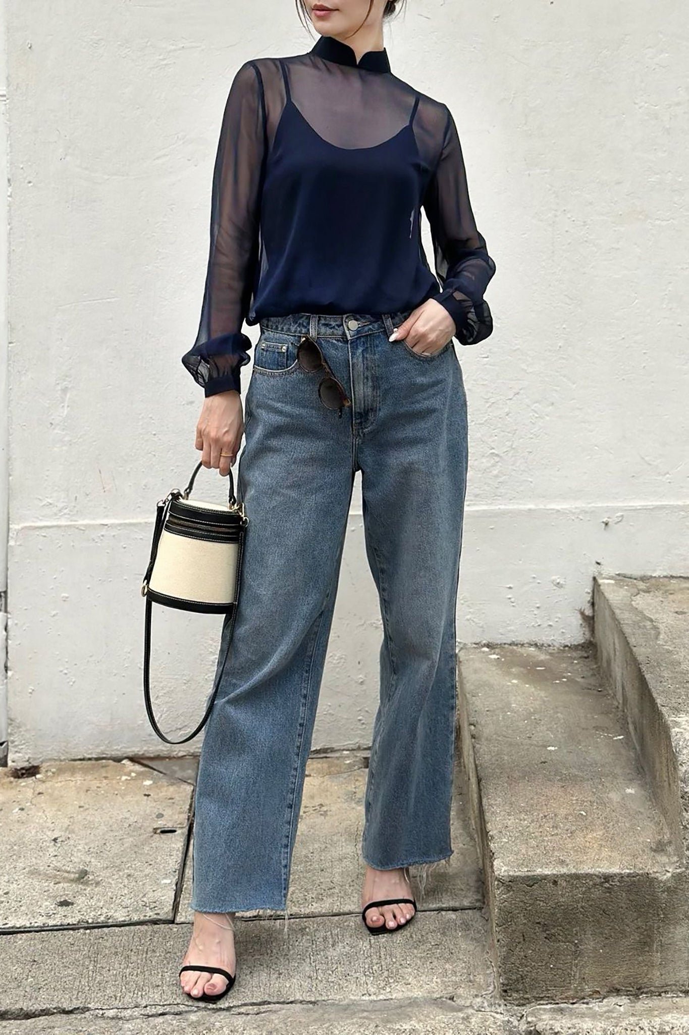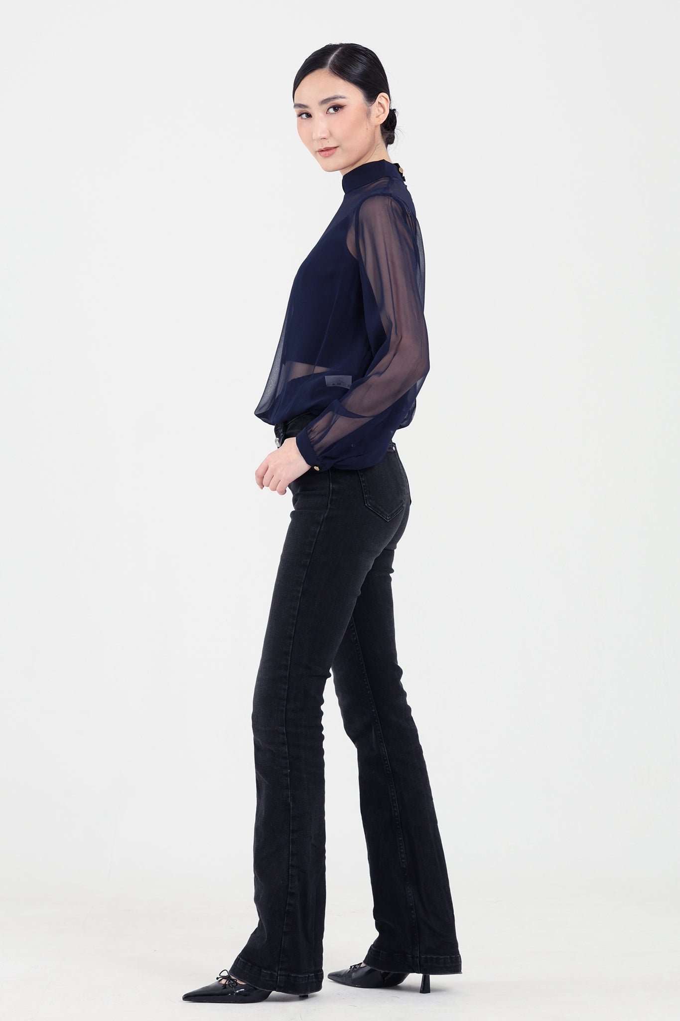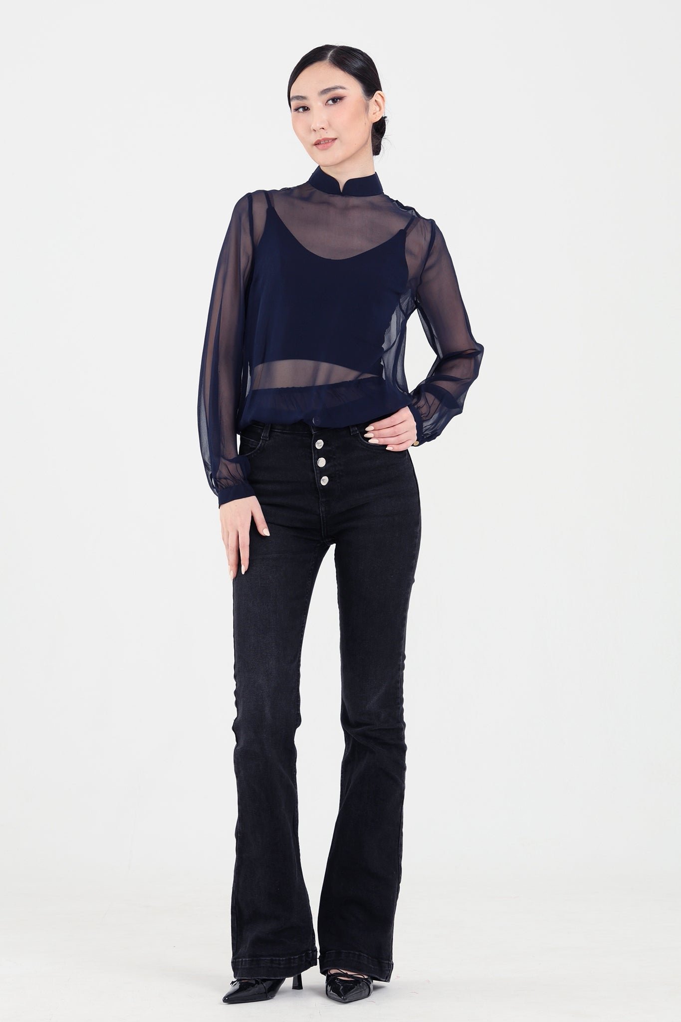 用這款精緻的海軍藍絲綢提升您的風格 透視雪紡襯衫。採用100%純真絲製成 .搭配精緻的中式立領和長袖。襯衫下擺彈性十足 .穿著舒適靈活。金色羈扣裝飾更添魅力 .透視布料更顯迷人。搭配吊帶背心 .打造時尚優雅的造型。