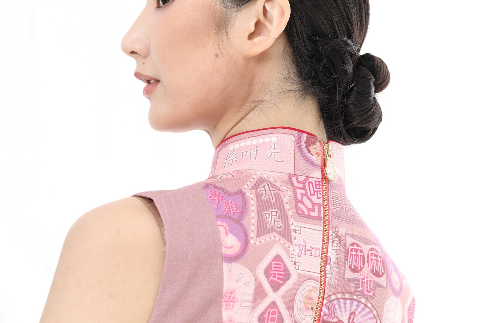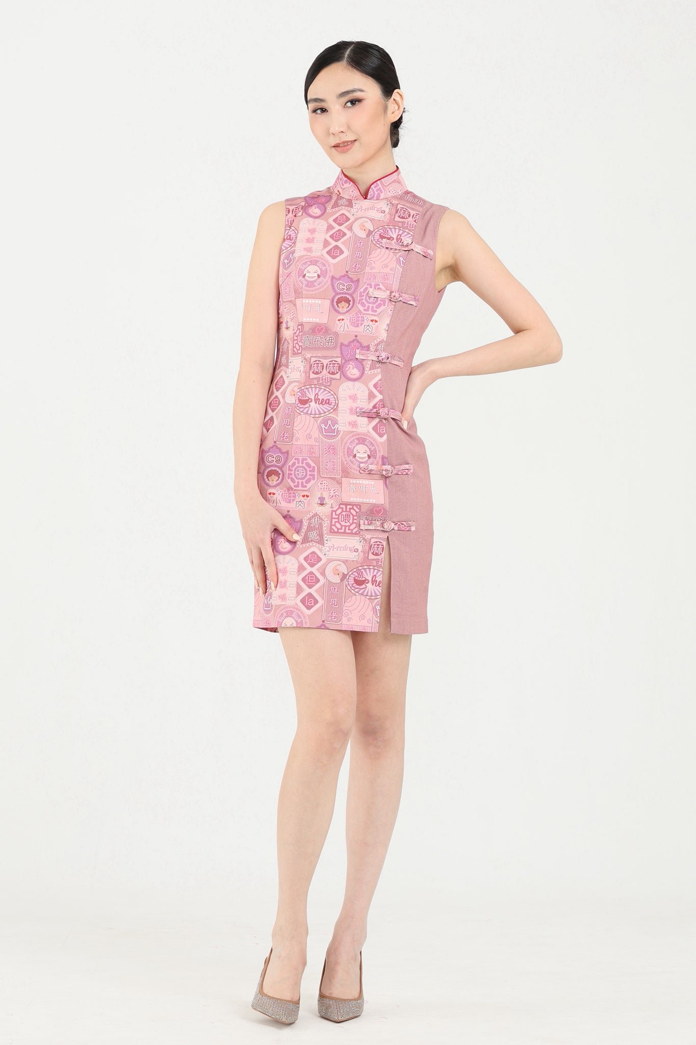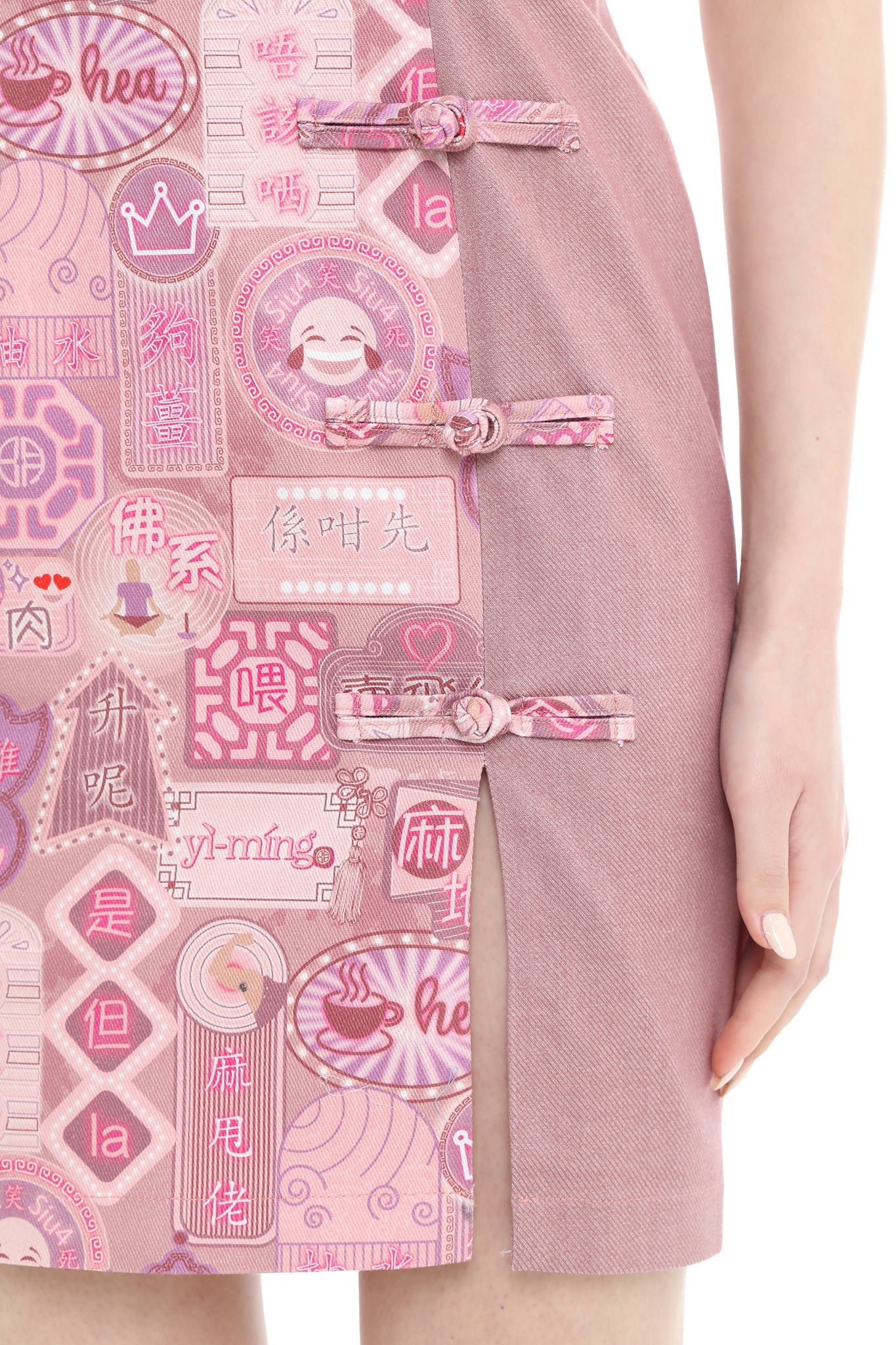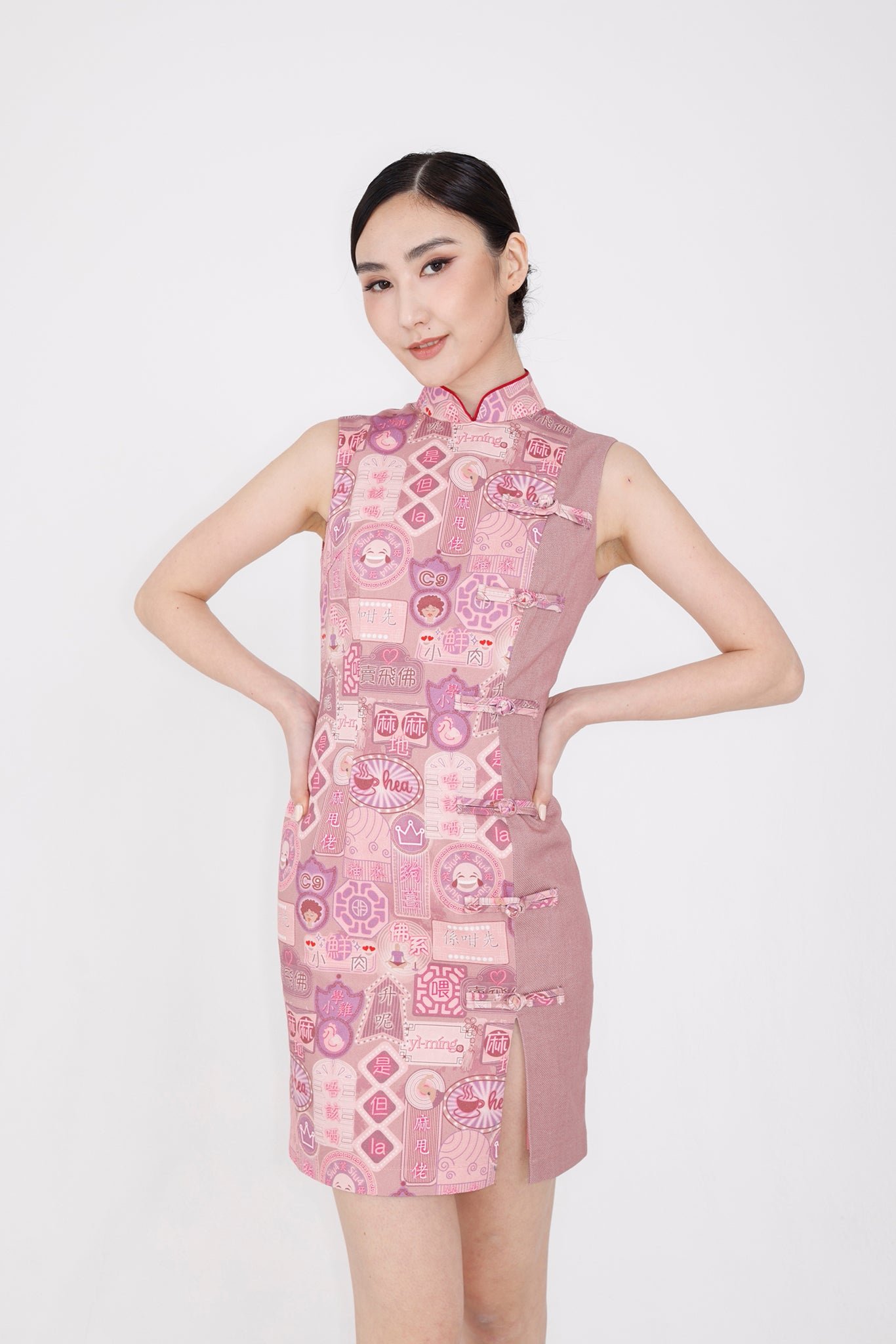 隆重介紹這款拼接牛仔旗袍 .將傳統與現代完美融合。霓虹燈標誌和粵語印花與素色牛仔布形成鮮明對比 .並飾有一排裝飾性中式連結。左前襟設有小開衩 .後中部配有金色拉鍊 .確保輕鬆穿著。棉質襯裡確保全天舒適穿著。