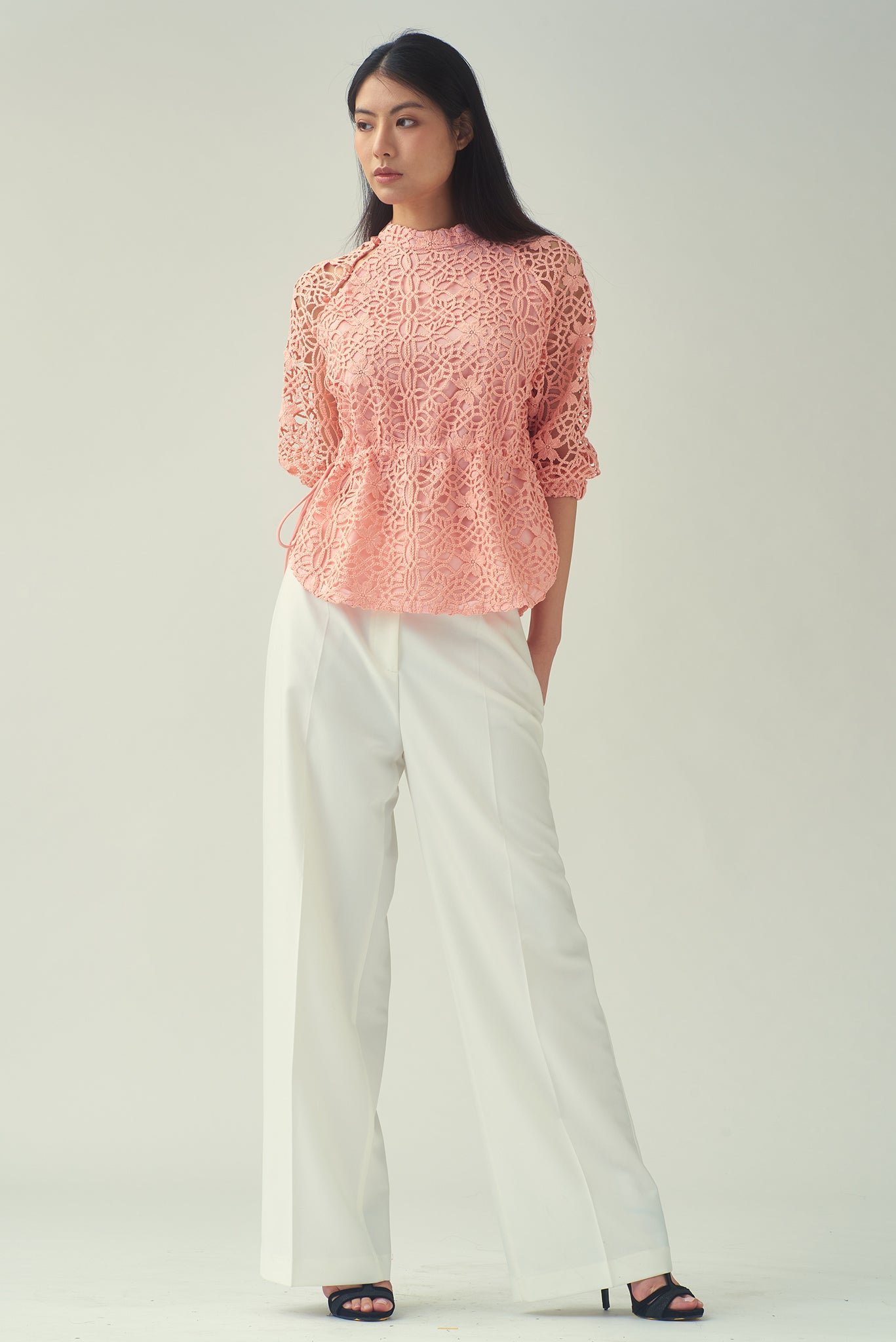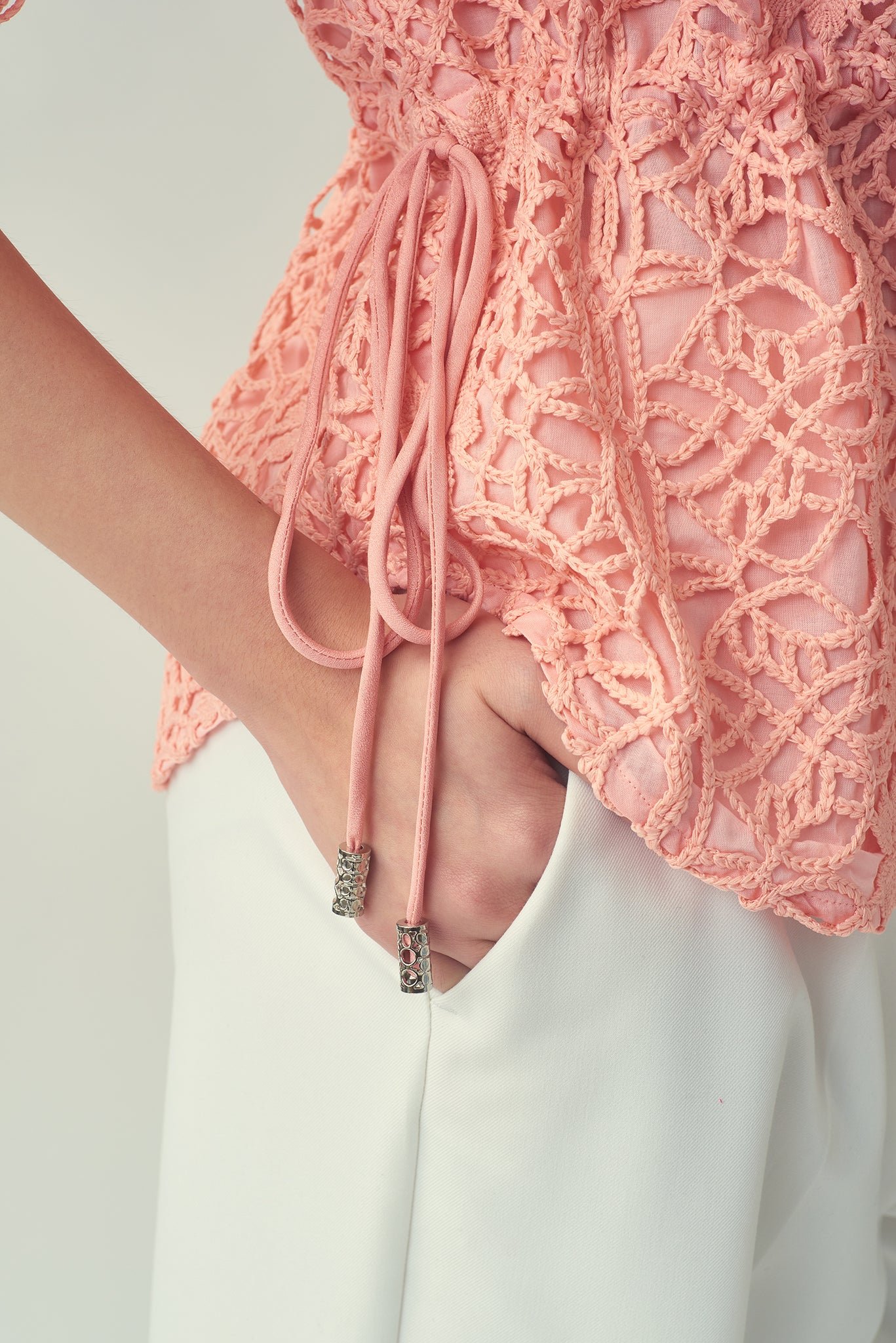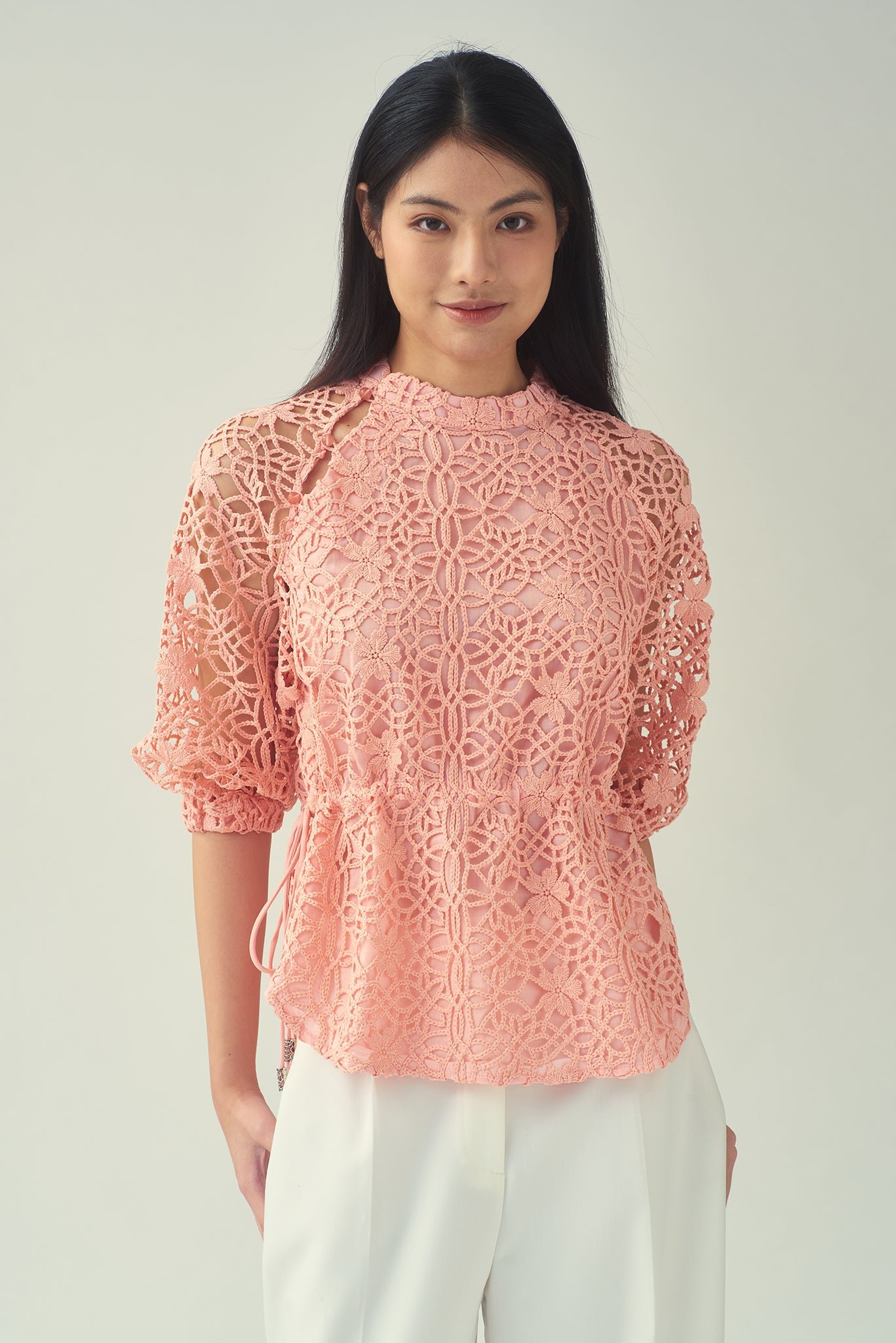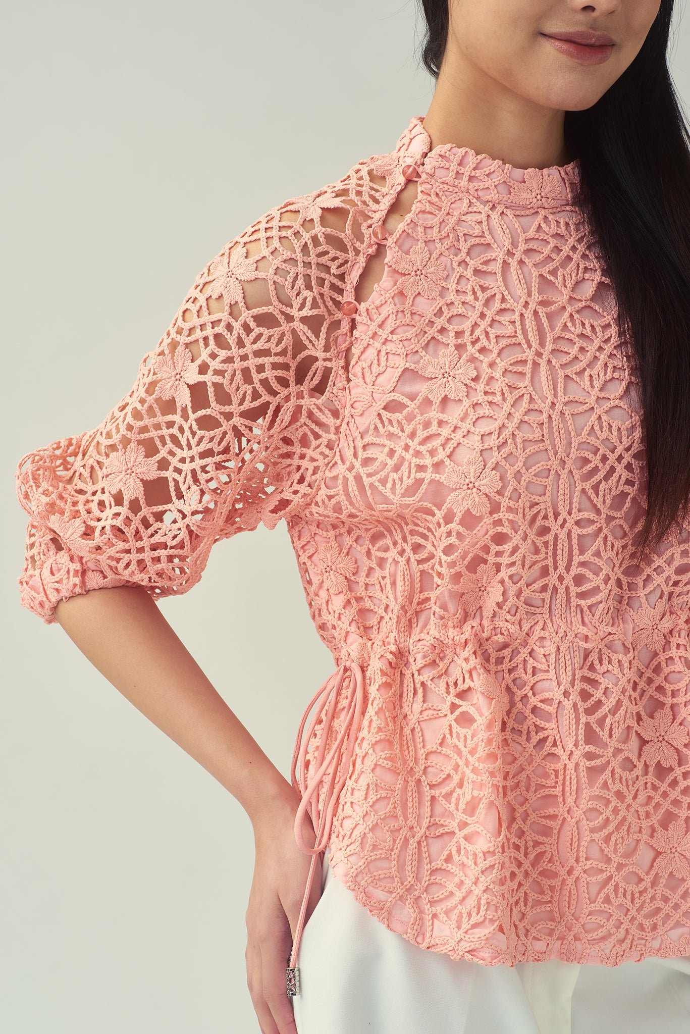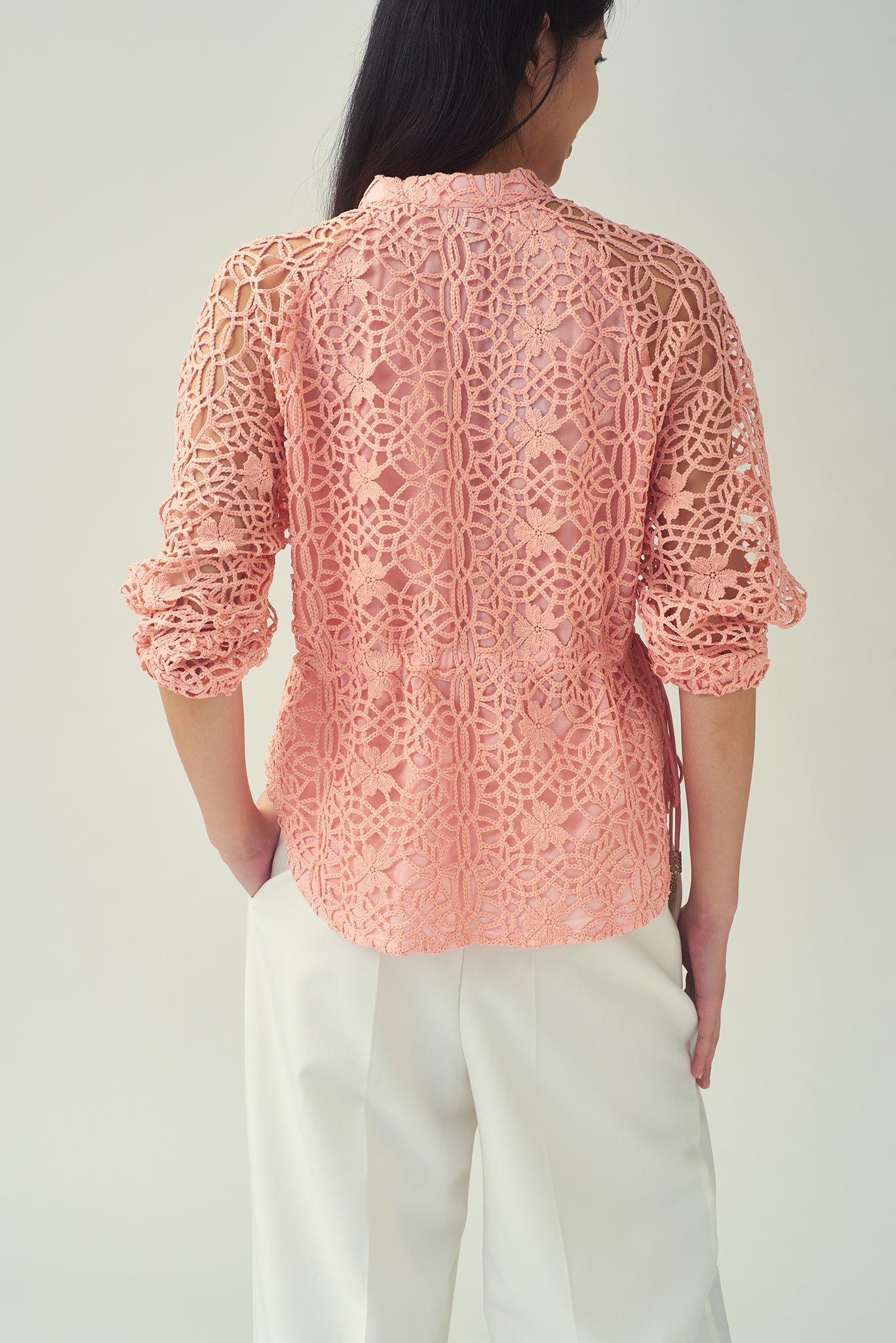 這款女士上衣將舒適與時尚完美結合。柔軟的棉質襯裡帶來舒適的穿著體驗。精緻的花卉蕾絲覆層為設計增添一抹優雅。斜切的綠玉色紐帶前開襟 .打造獨特而醒目的細節。腰部抽繩設計 .打造個人化貼合感 .泡泡袖和鬆緊袖口則增添迷人柔和的氣息。