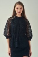這款女士上衣將舒適與時尚完美結合。柔軟的棉質襯裡帶來舒適的穿著體驗。精緻的花卉蕾絲覆層為設計增添一抹優雅。斜切的綠玉色紐帶前開襟 .打造獨特而醒目的細節。腰部抽繩設計 .打造個人化貼合感 .泡泡袖和鬆緊袖口則增添迷人柔和的氣息。