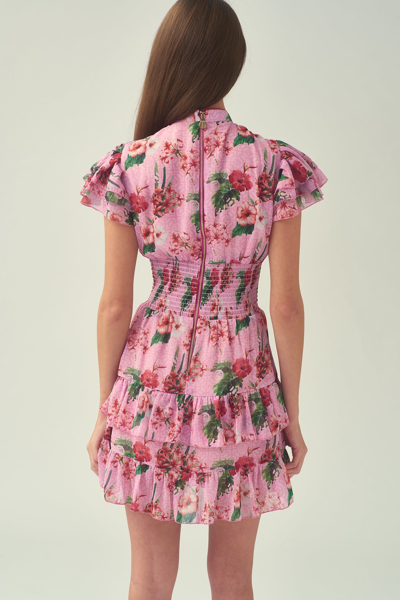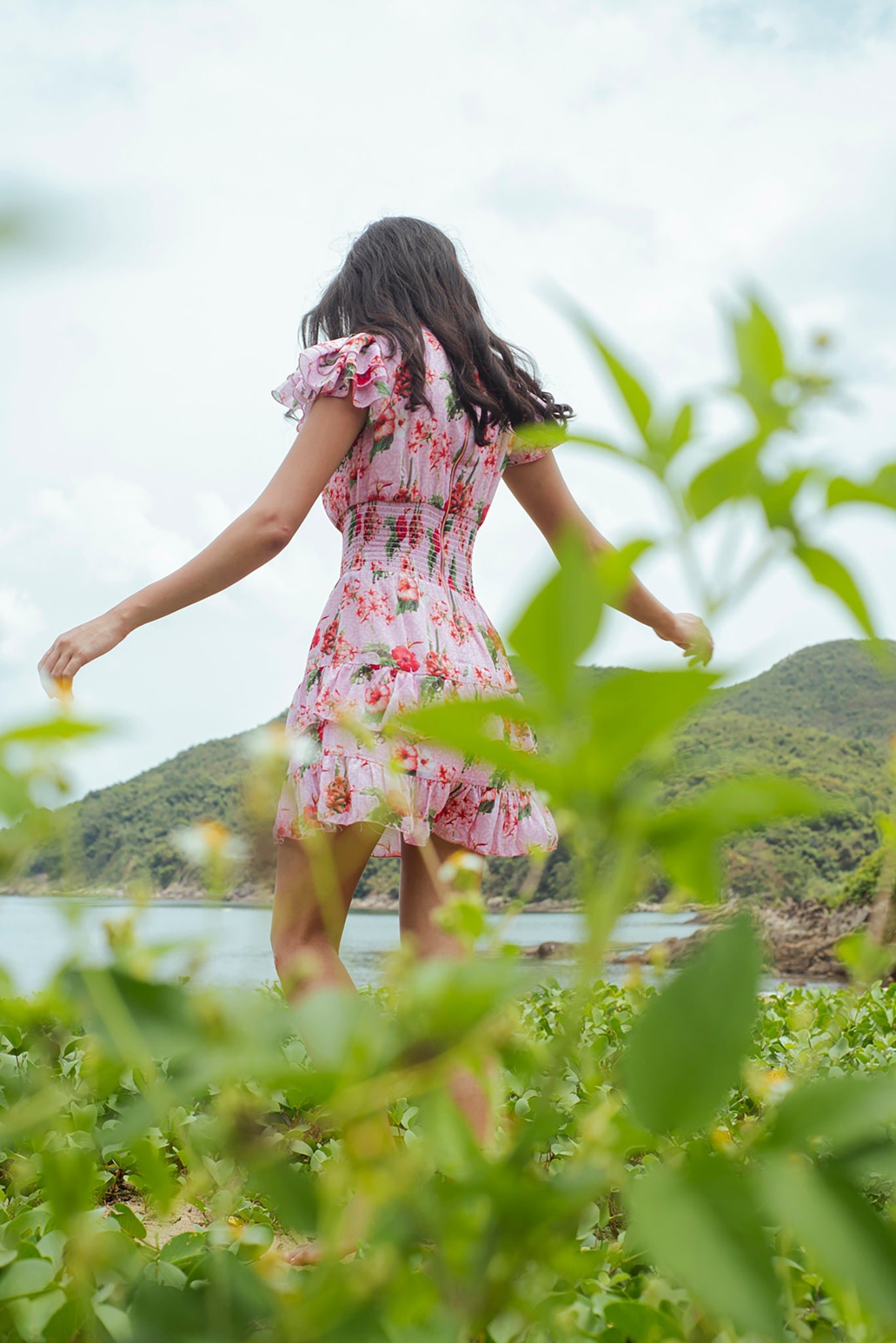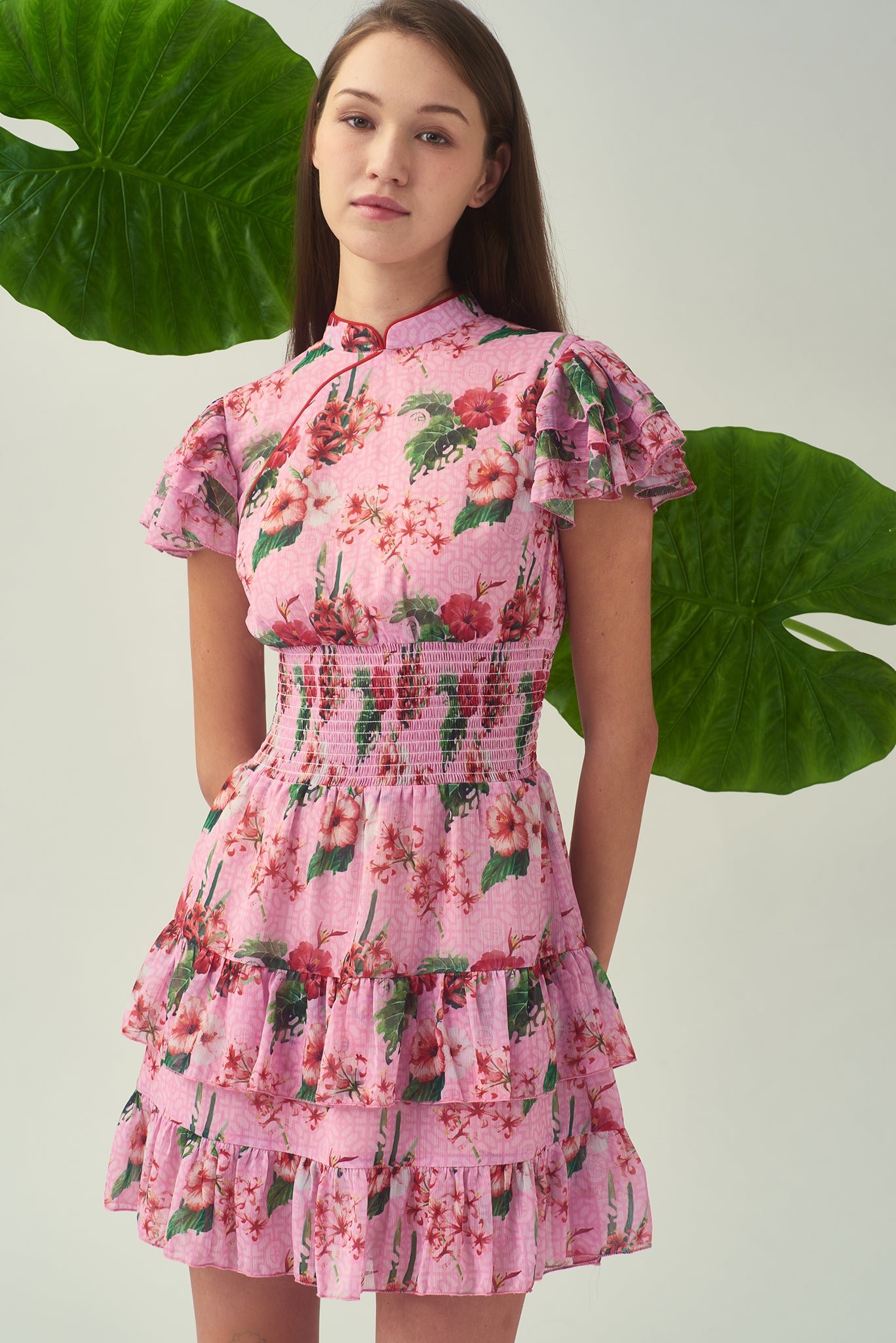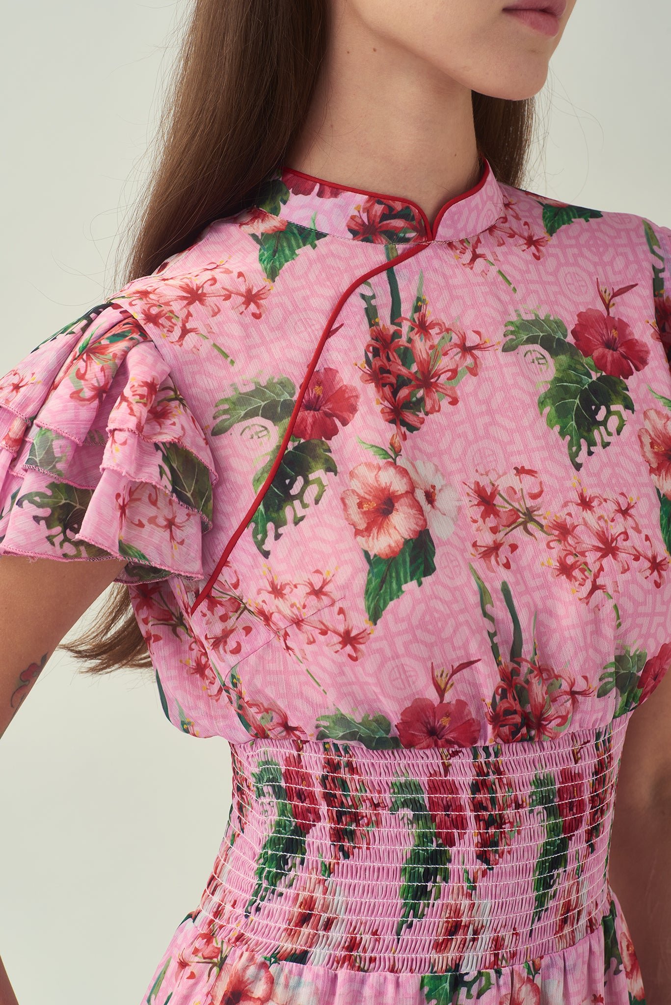 這款層疊荷葉邊連身裙 .捕捉青春活力。 Yi-ming 原創植物印花雪紡面料 .更添一絲異國情調。中式立領和前片的滾邊更添精緻細節。肩部層疊荷葉邊和褶皺腰身 .打造俏皮百搭的輪廓。後背中央拉鍊開合 .方便穿著。