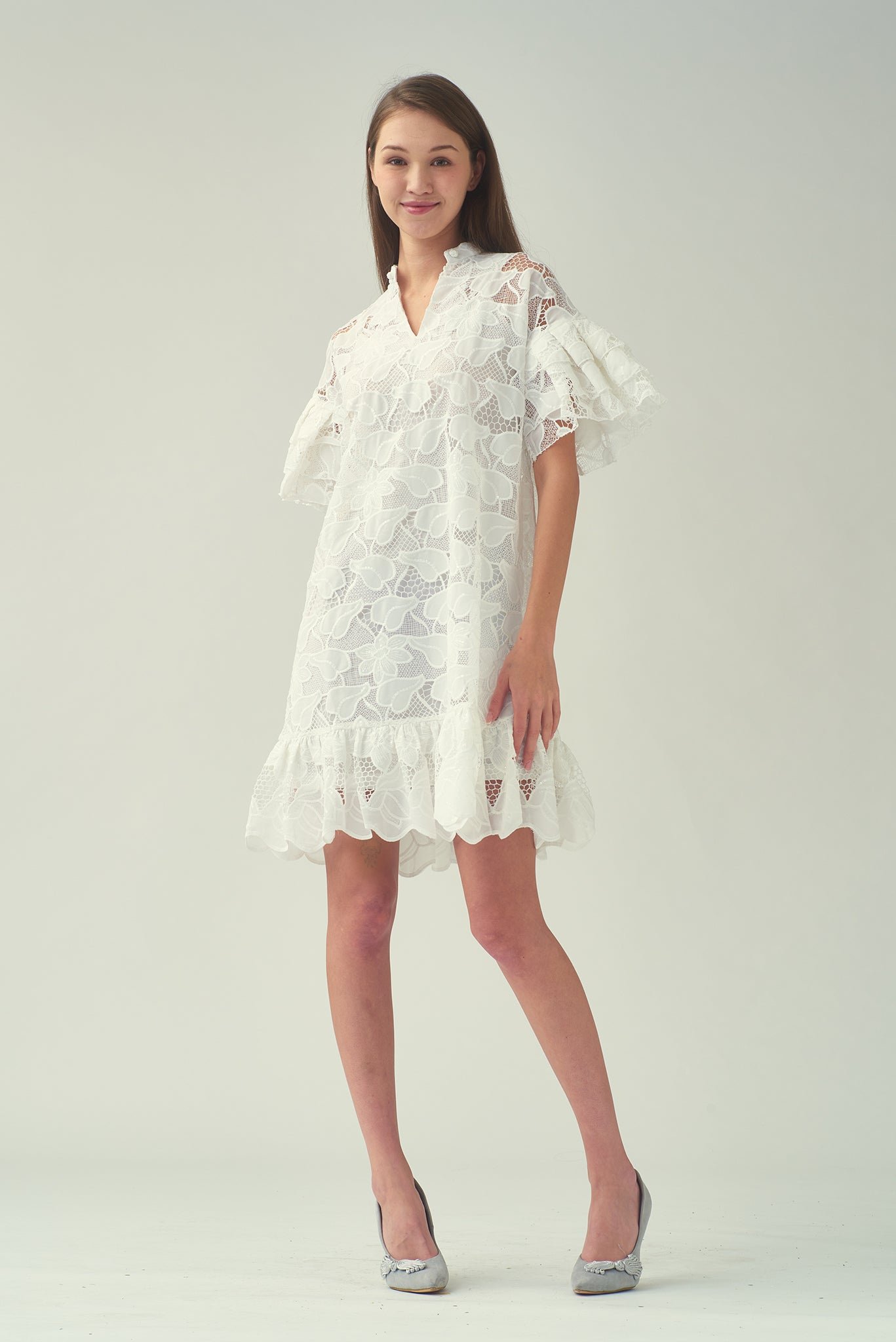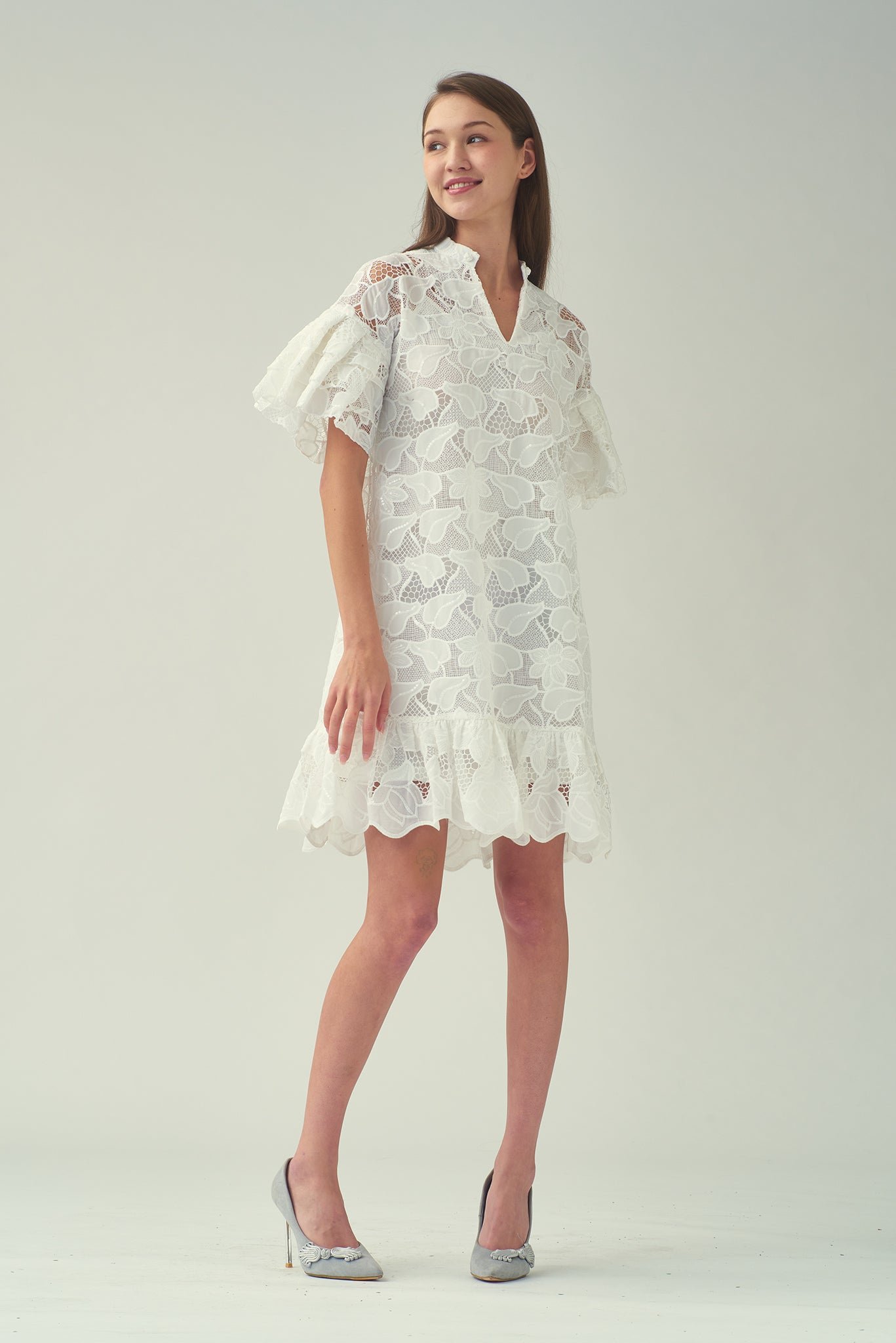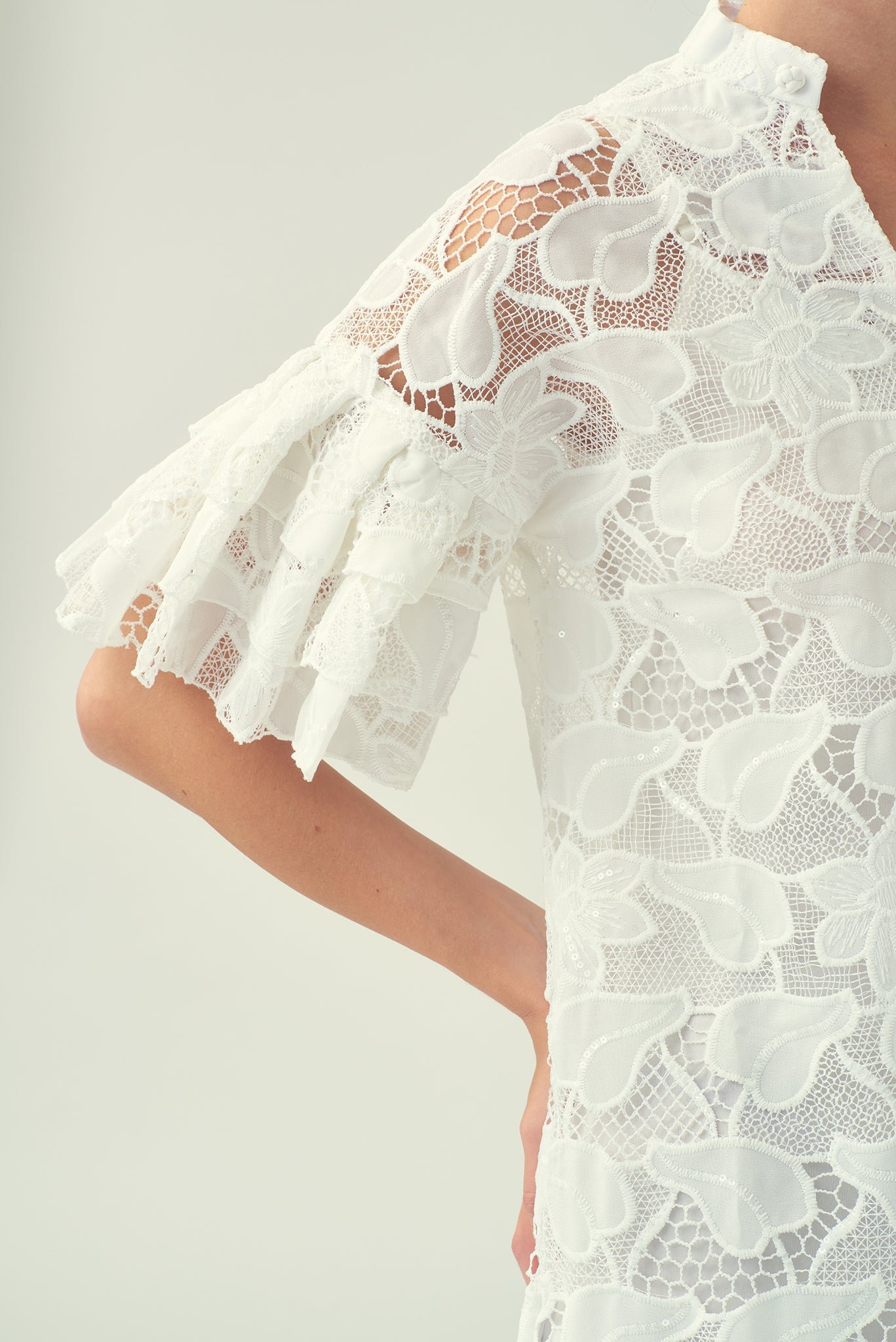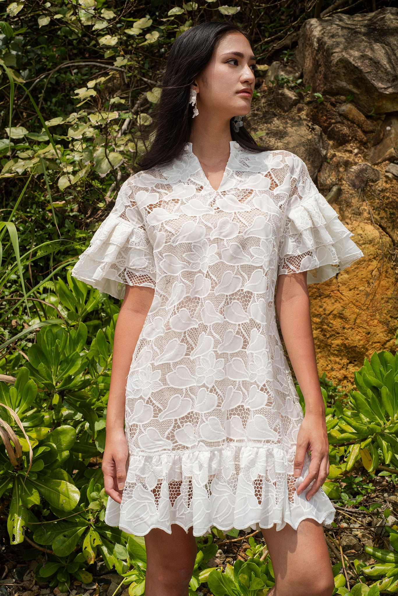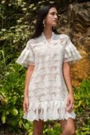 探索我們這款亮片白色蕾絲洋裝的舒適與精緻。內搭奢華絲質吊帶裙 .帶來絲滑觸感。寬鬆的版型和A字廓形 .輕鬆修飾您的身材。 V領設計更添魅力 .領口的中國結紐扣更添迷人點綴。層疊的荷葉邊垂袖和荷葉邊下擺 .更添俏皮柔美 .為這套迷人套裝錦上添花。