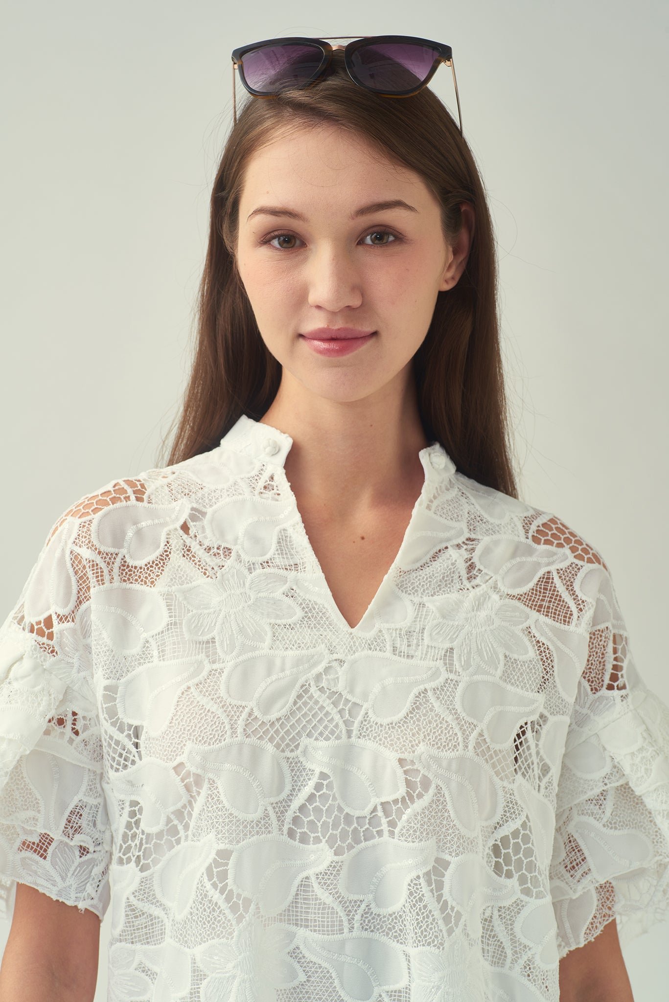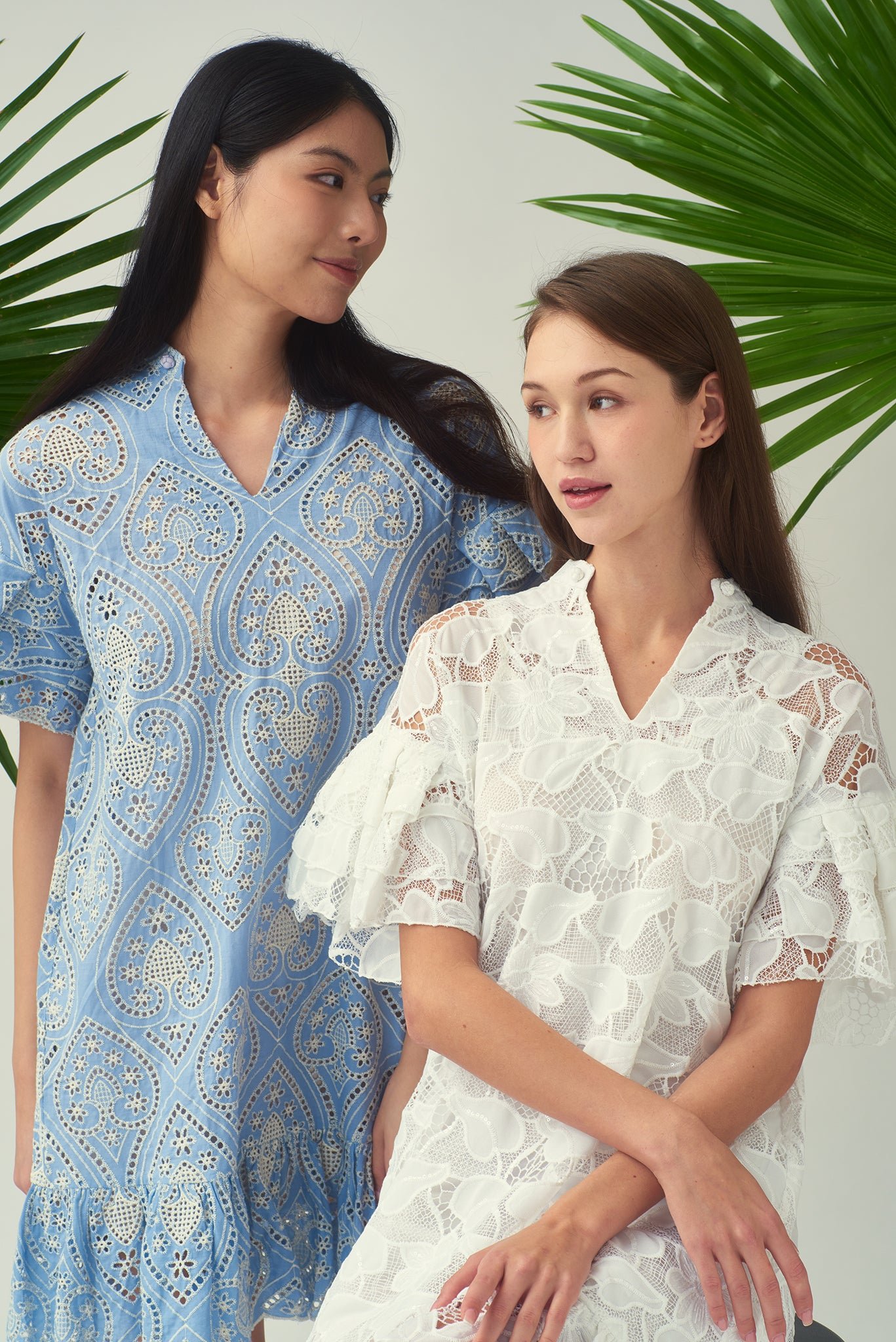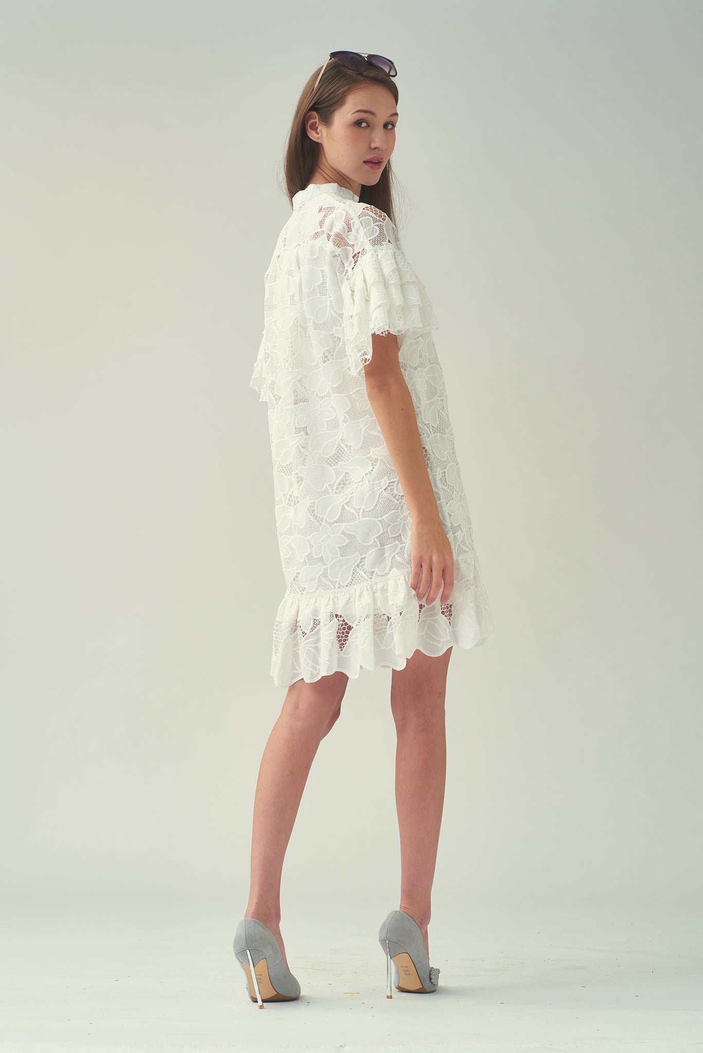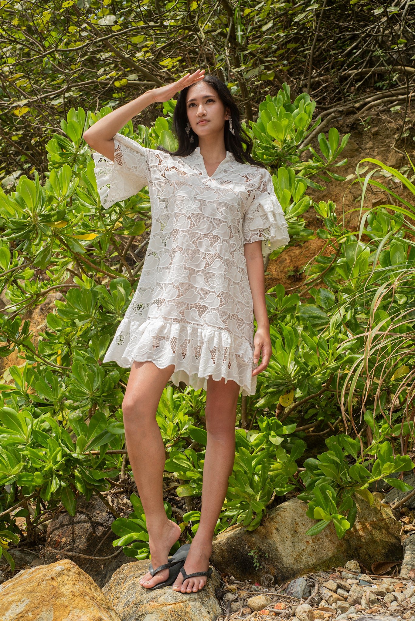探索我們這款亮片白色蕾絲洋裝的舒適與精緻。內搭奢華絲質吊帶裙 .帶來絲滑觸感。寬鬆的版型和A字廓形 .輕鬆修飾您的身材。 V領設計更添魅力 .領口的中國結紐扣更添迷人點綴。層疊的荷葉邊垂袖和荷葉邊下擺 .更添俏皮柔美 .為這套迷人套裝錦上添花。