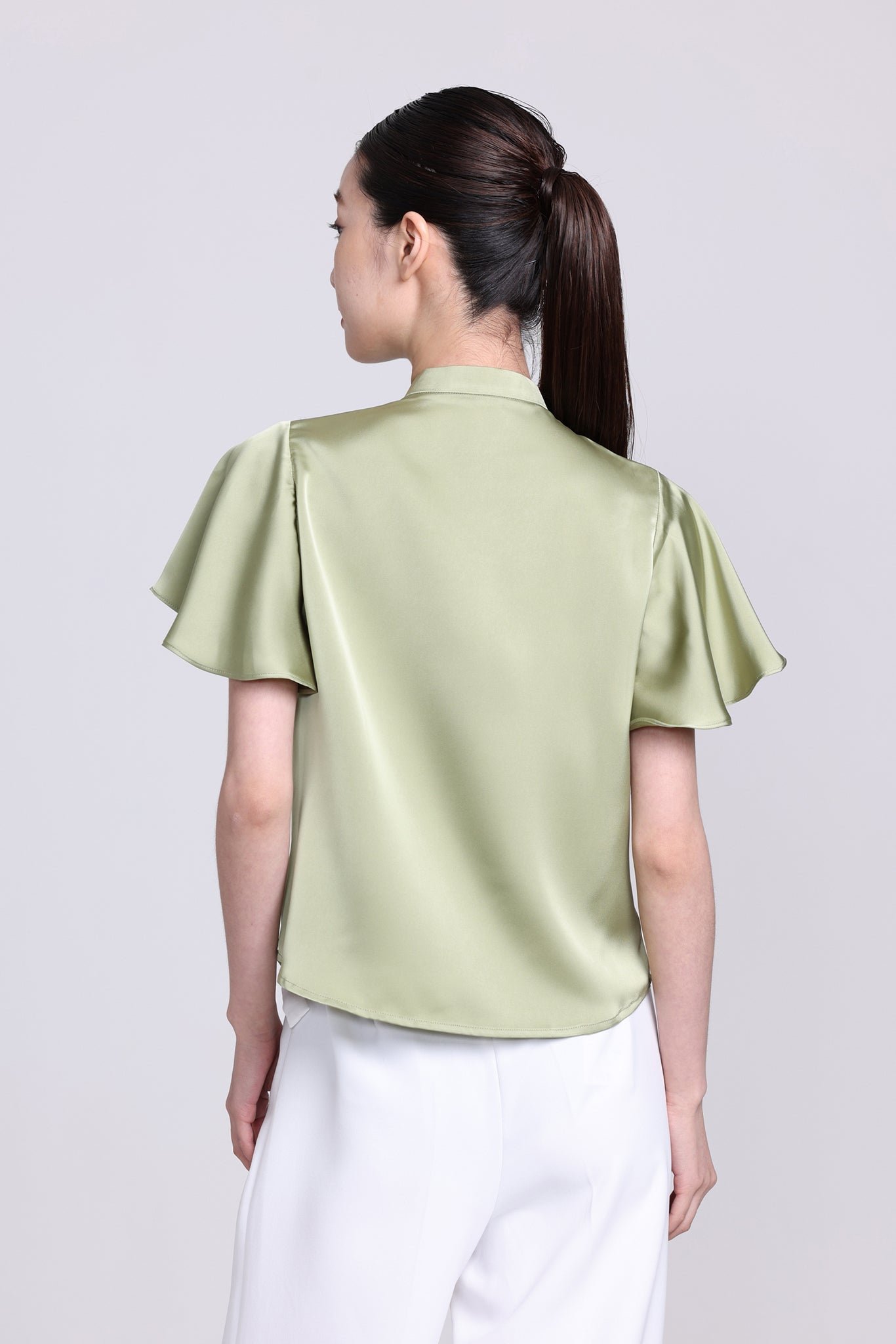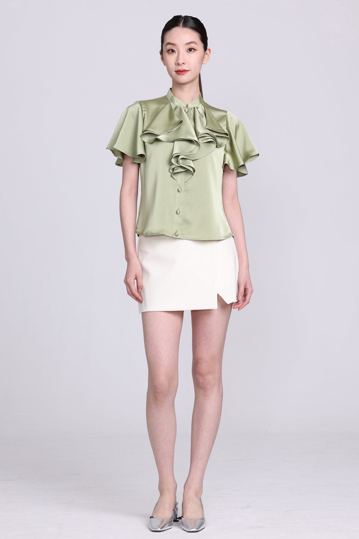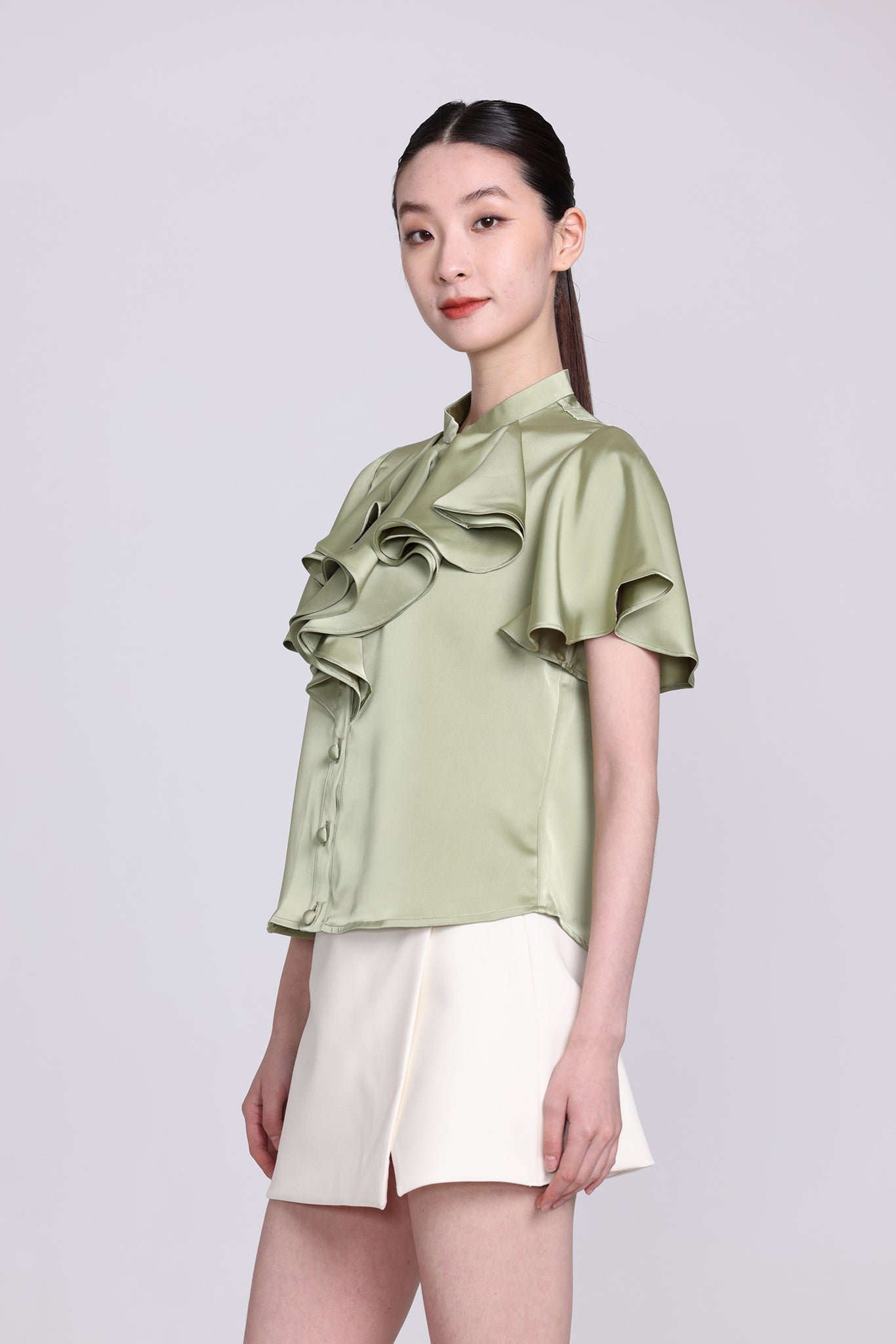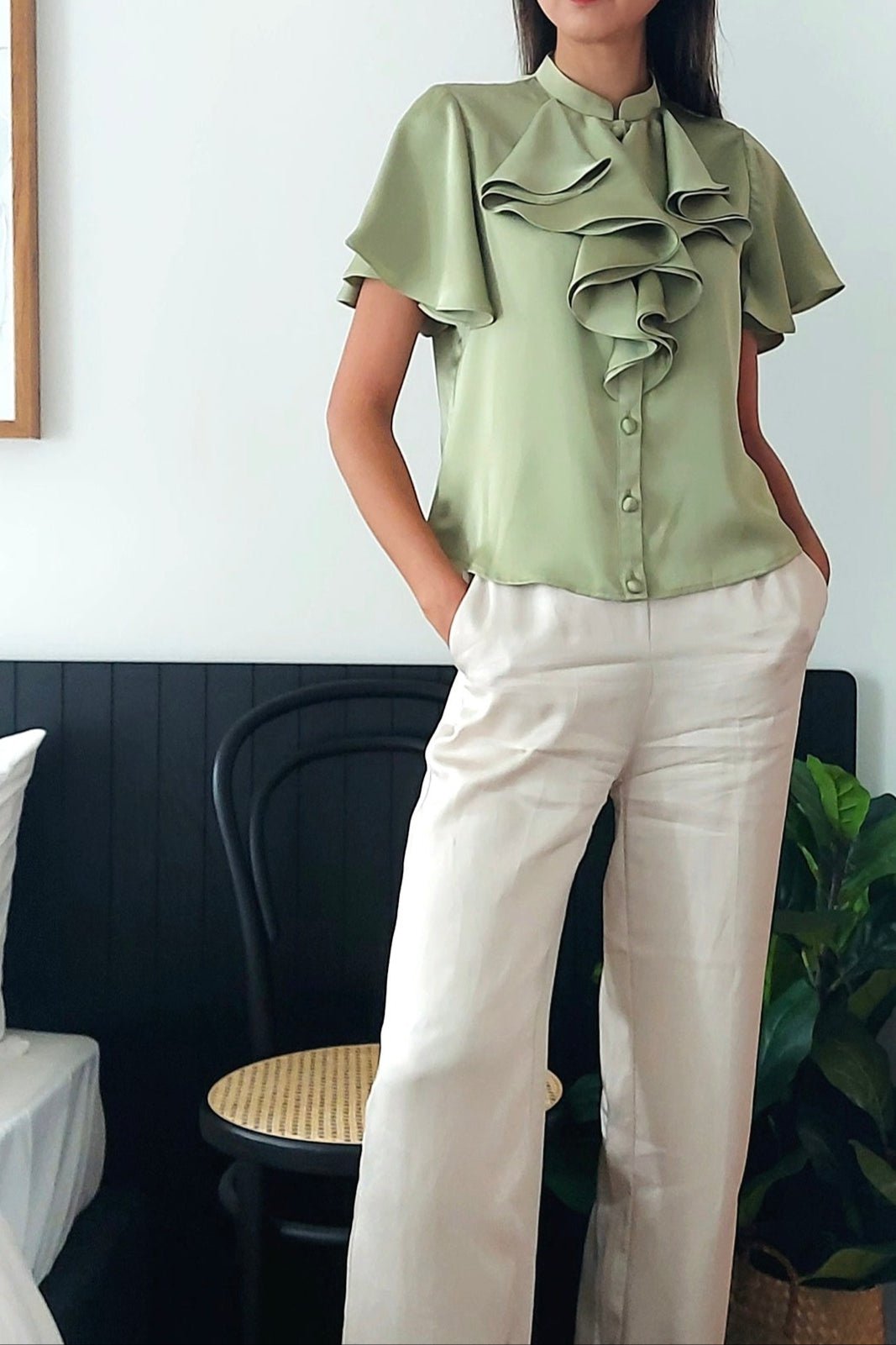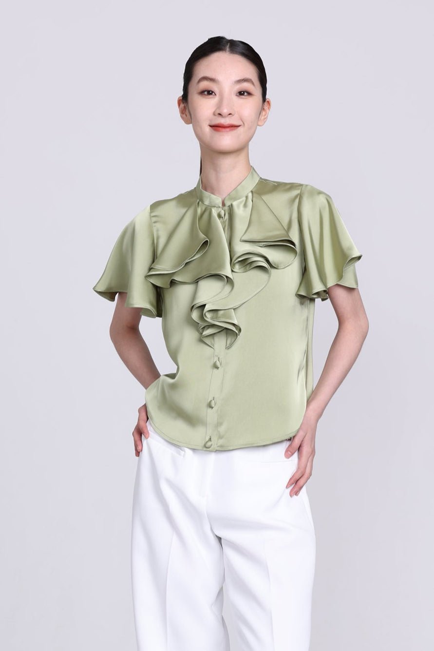 沉醉於這款緞面襯衫的奢華魅力 .散發著奢華精緻的氣息。它擁有優雅的荷葉邊袖口和前胸精緻的荷葉邊細節 .更添一絲女性柔美。前中紐扣開襟 .輕鬆時尚。用這款精緻百搭的單品提升您的衣櫥品味。