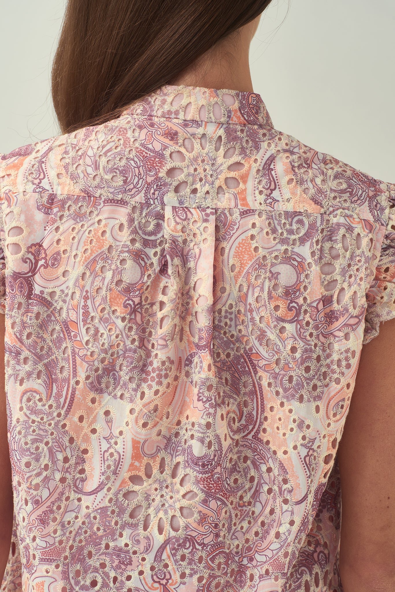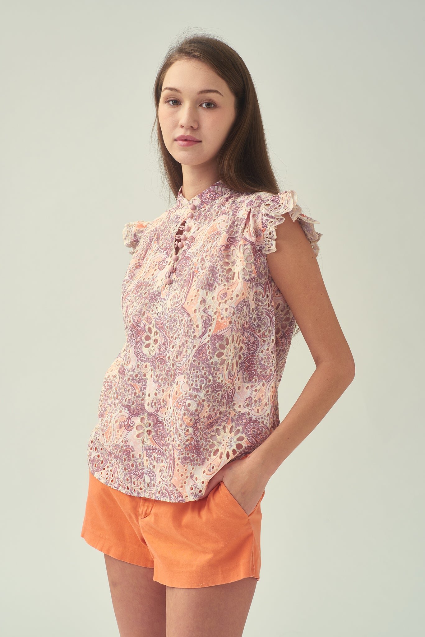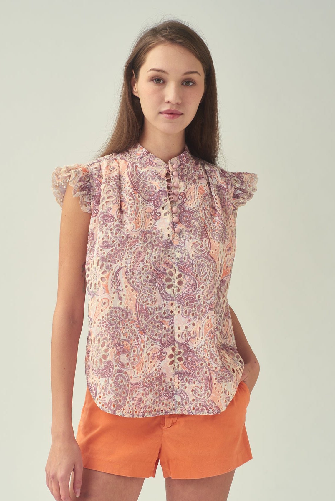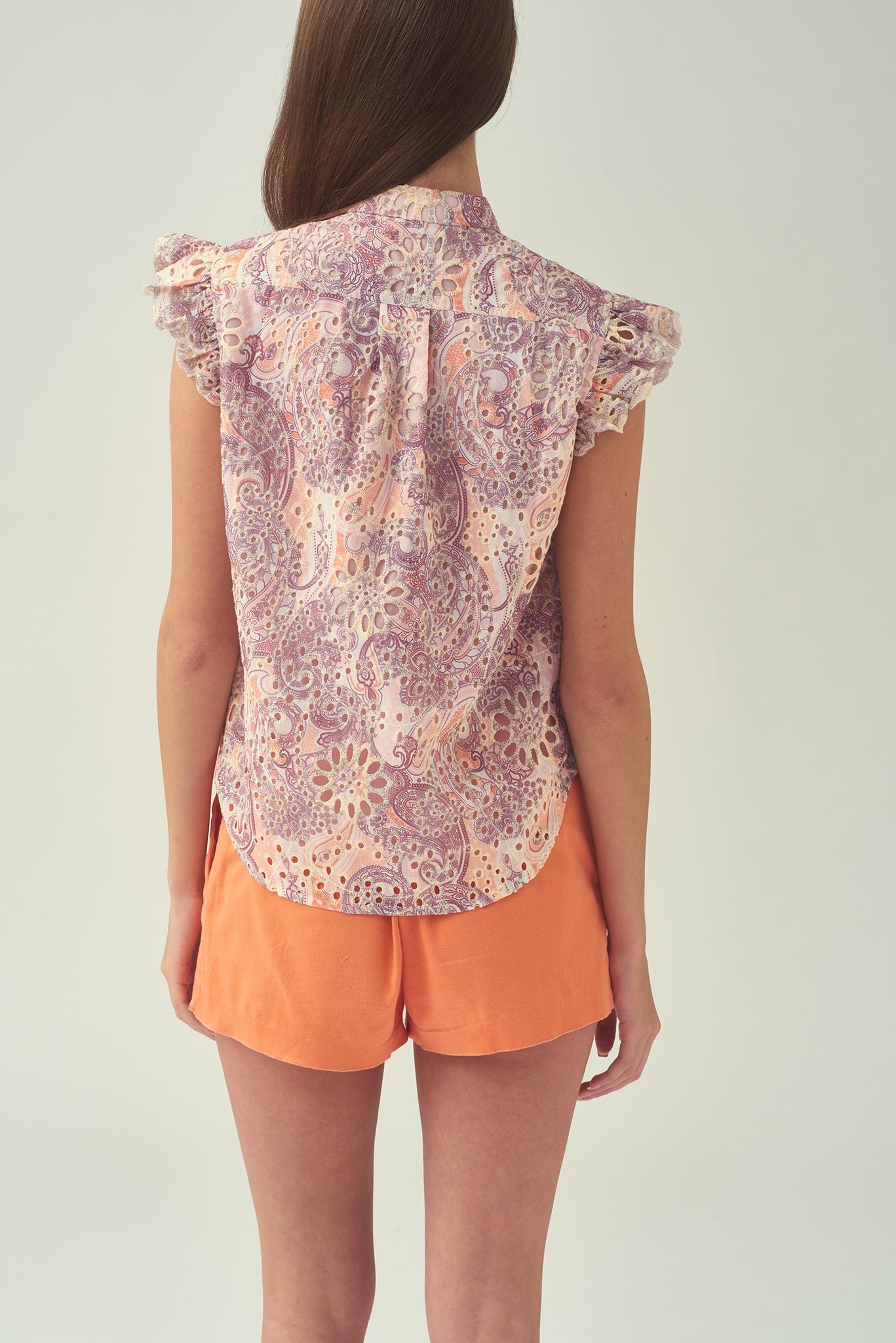這款無袖襯衫採用荷葉邊肩部設計 .展現時尚風格。採用舒適的斜紋棉布製成 .飾有刺繡佩斯利花紋 .散發波西米亞風情。前襟中央的小紐扣增添精緻細節 .輕鬆演繹女性柔美與精緻優雅。