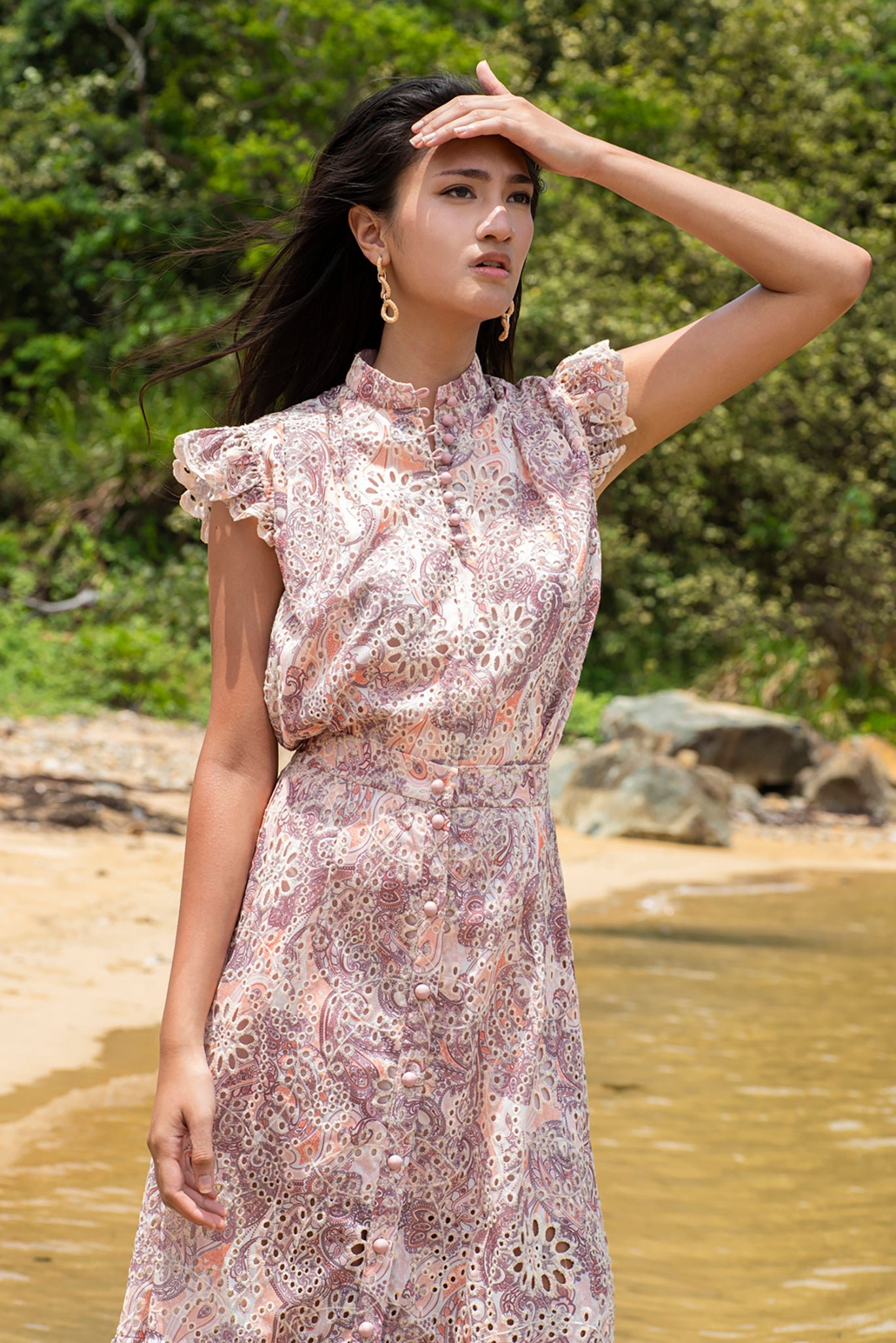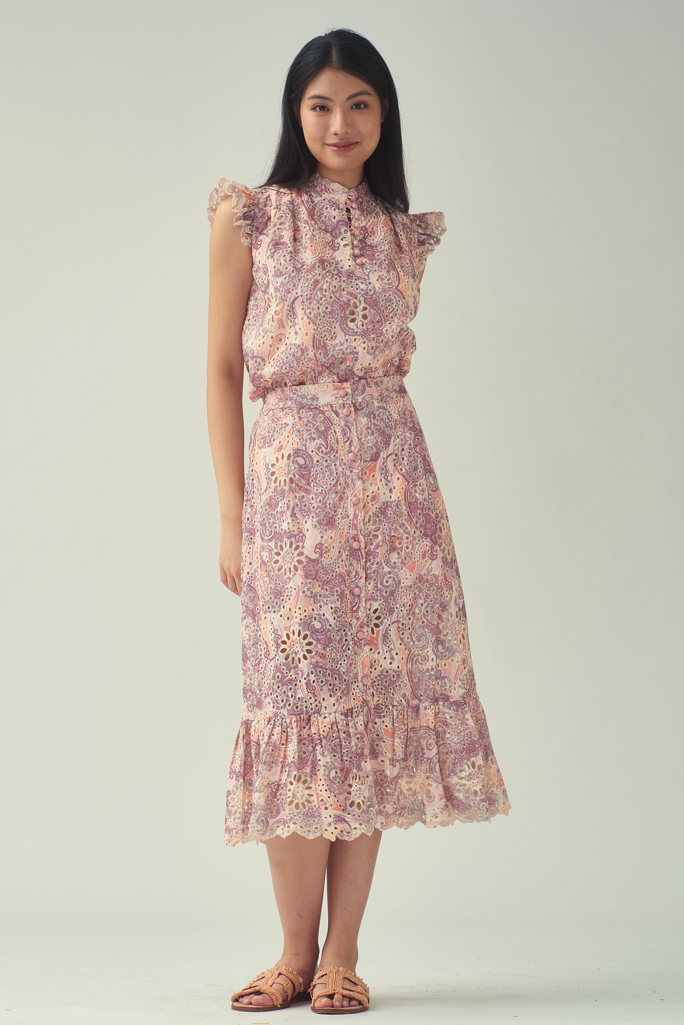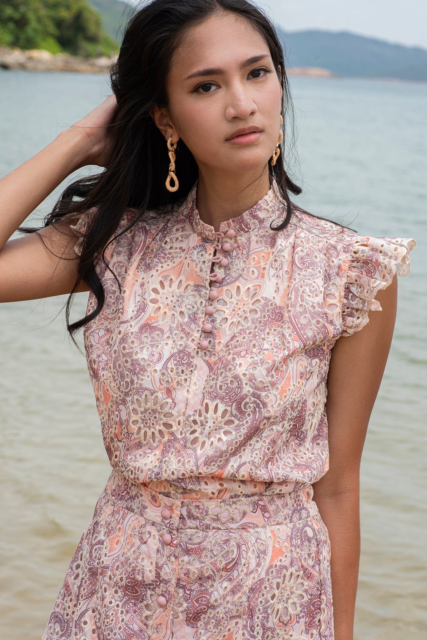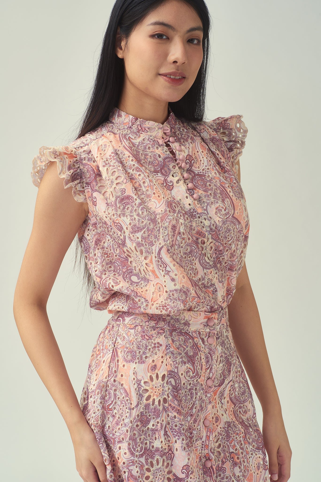 這款無袖襯衫採用荷葉邊肩部設計 .展現時尚風格。採用舒適的斜紋棉布製成 .飾有刺繡佩斯利花紋 .散發波西米亞風情。前襟中央的小紐扣增添精緻細節 .輕鬆演繹女性柔美與精緻優雅。