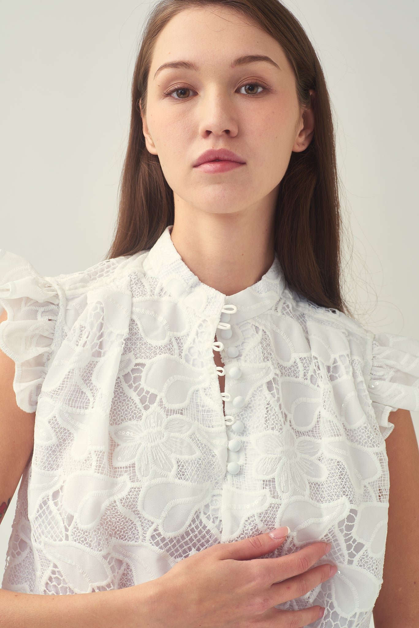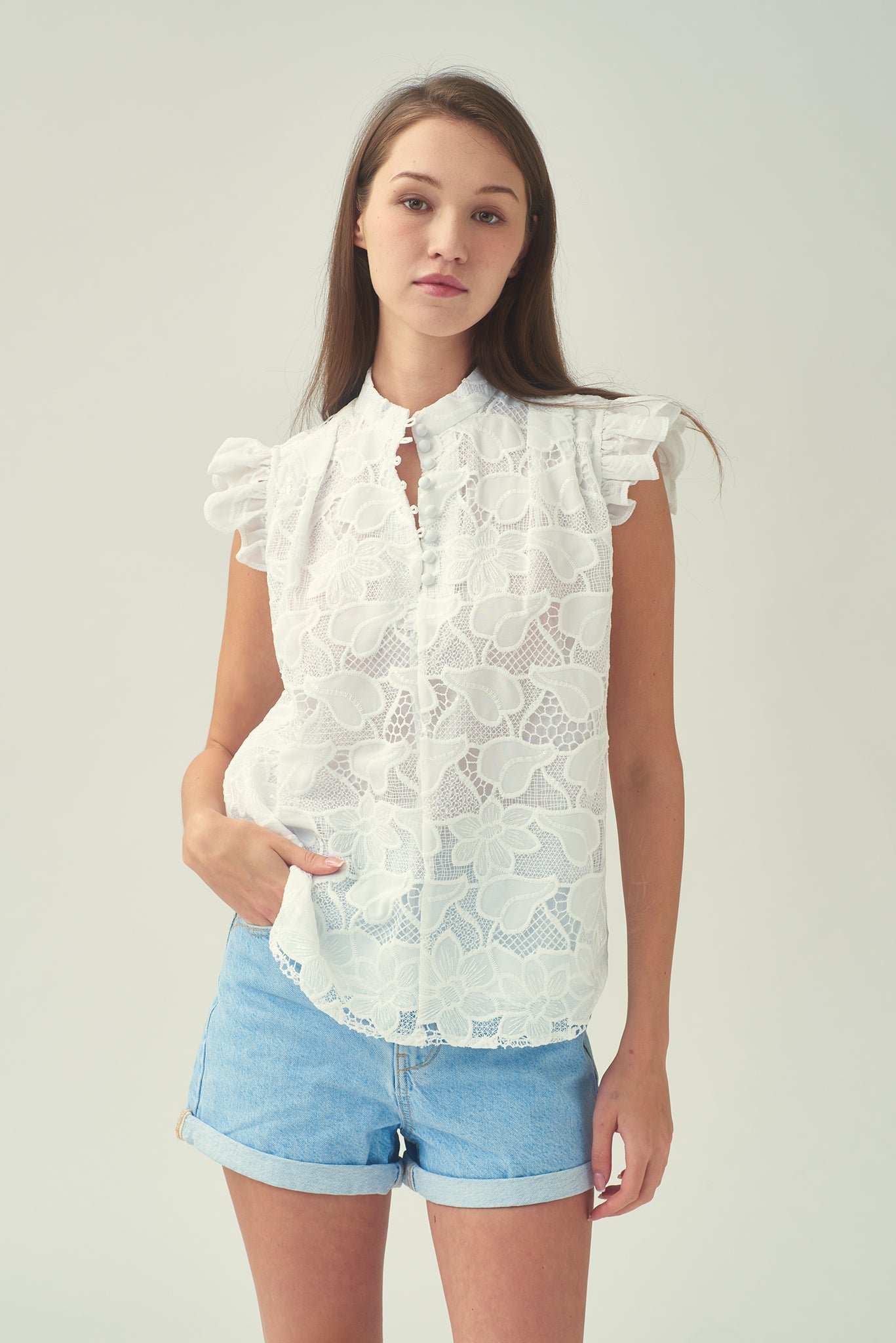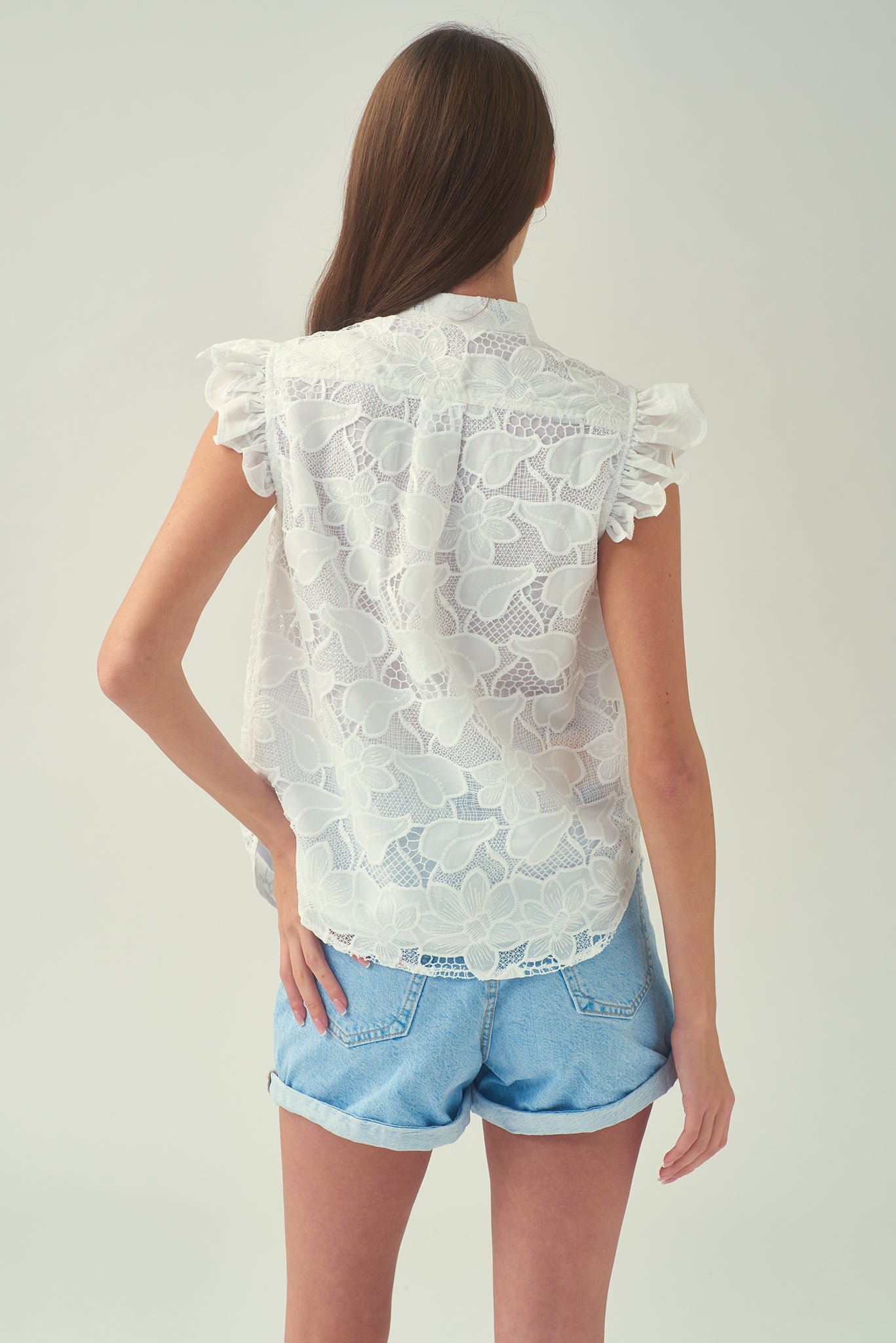 這款精緻的棉質襯裡無袖襯衫 .幫助您提升個人風格。肩膀荷葉邊更添柔美 .綴以亮片的白色蕾絲布料更顯優雅精緻。前襟中央的小紐扣點綴精緻細節 .更添時尚優雅 .為這款經典襯衫錦上添花。