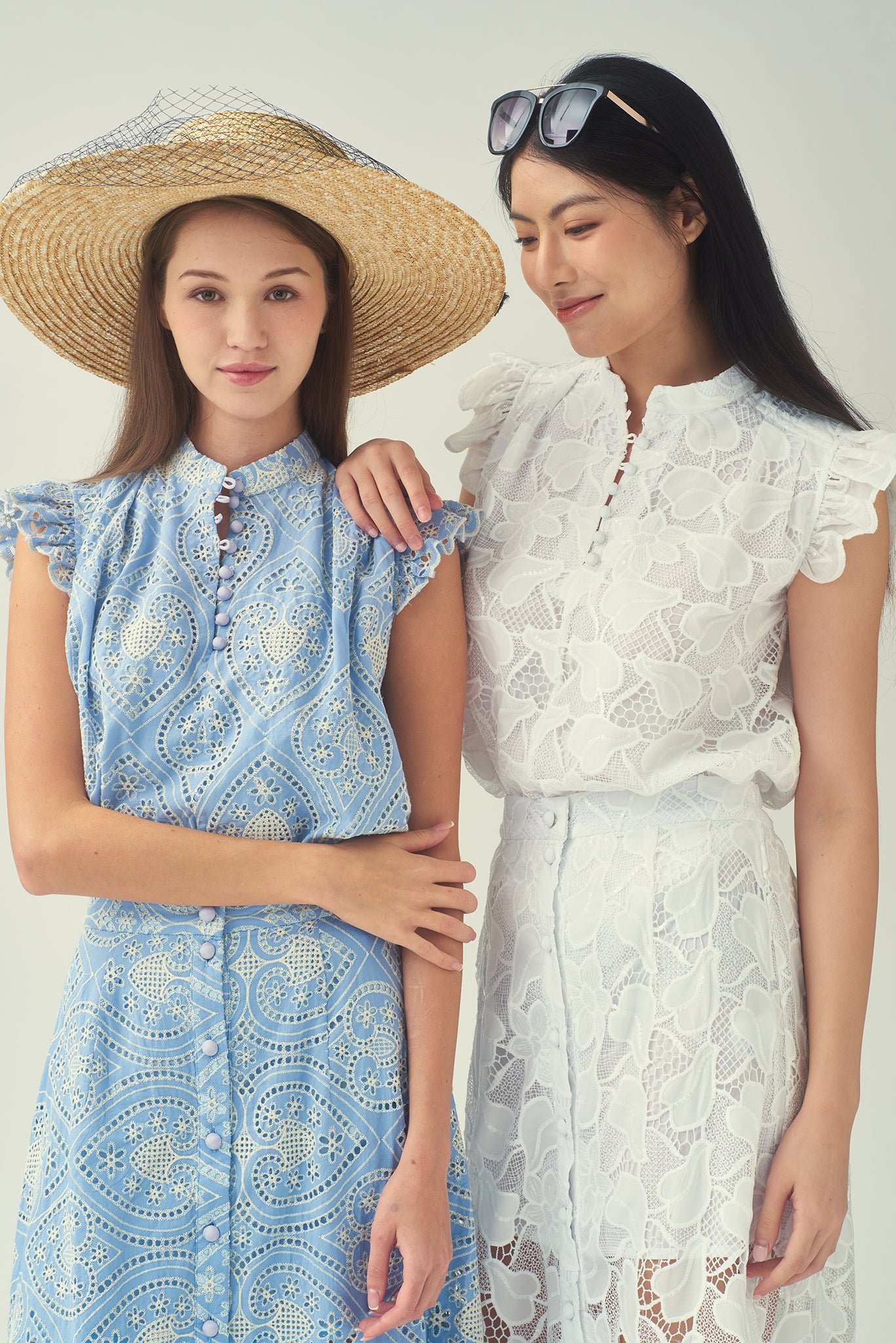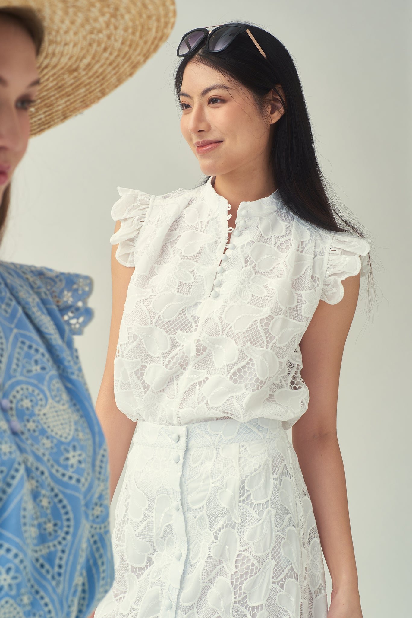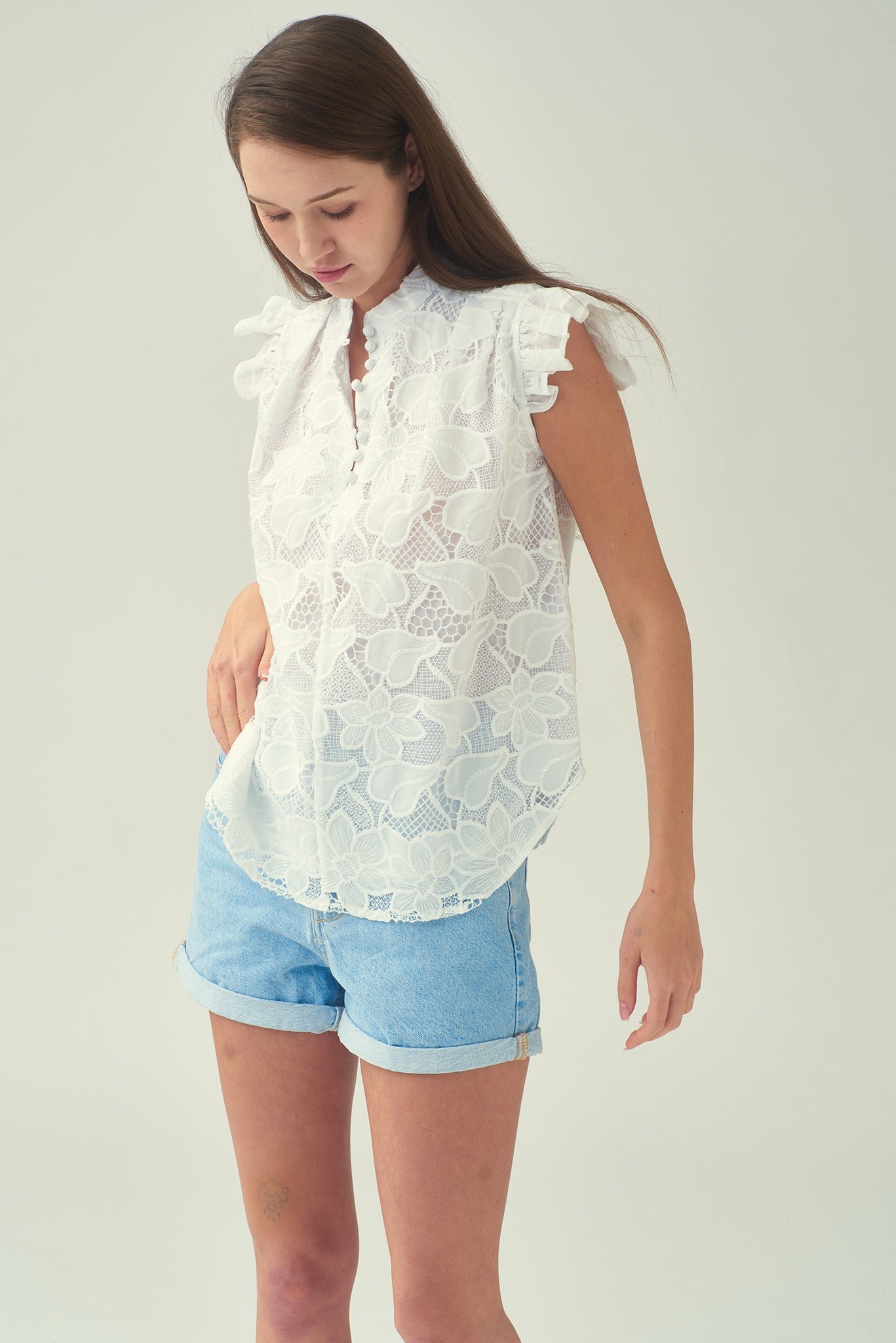 這款精緻的棉質襯裡無袖襯衫 .幫助您提升個人風格。肩膀荷葉邊更添柔美 .綴以亮片的白色蕾絲布料更顯優雅精緻。前襟中央的小紐扣點綴精緻細節 .更添時尚優雅 .為這款經典襯衫錦上添花。