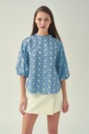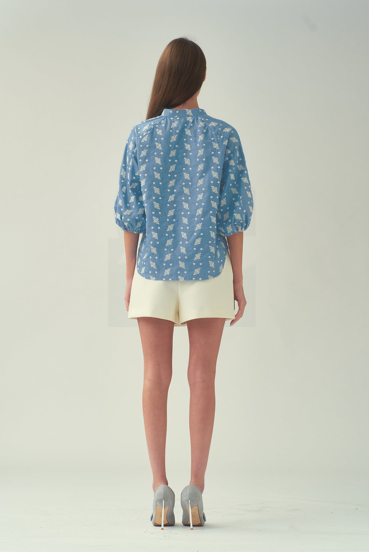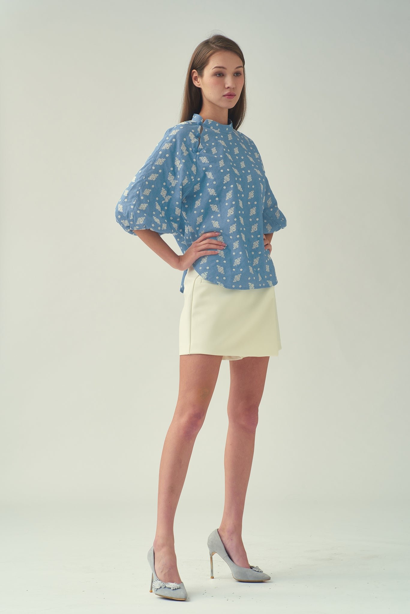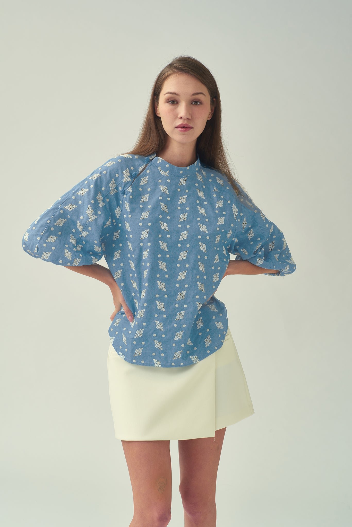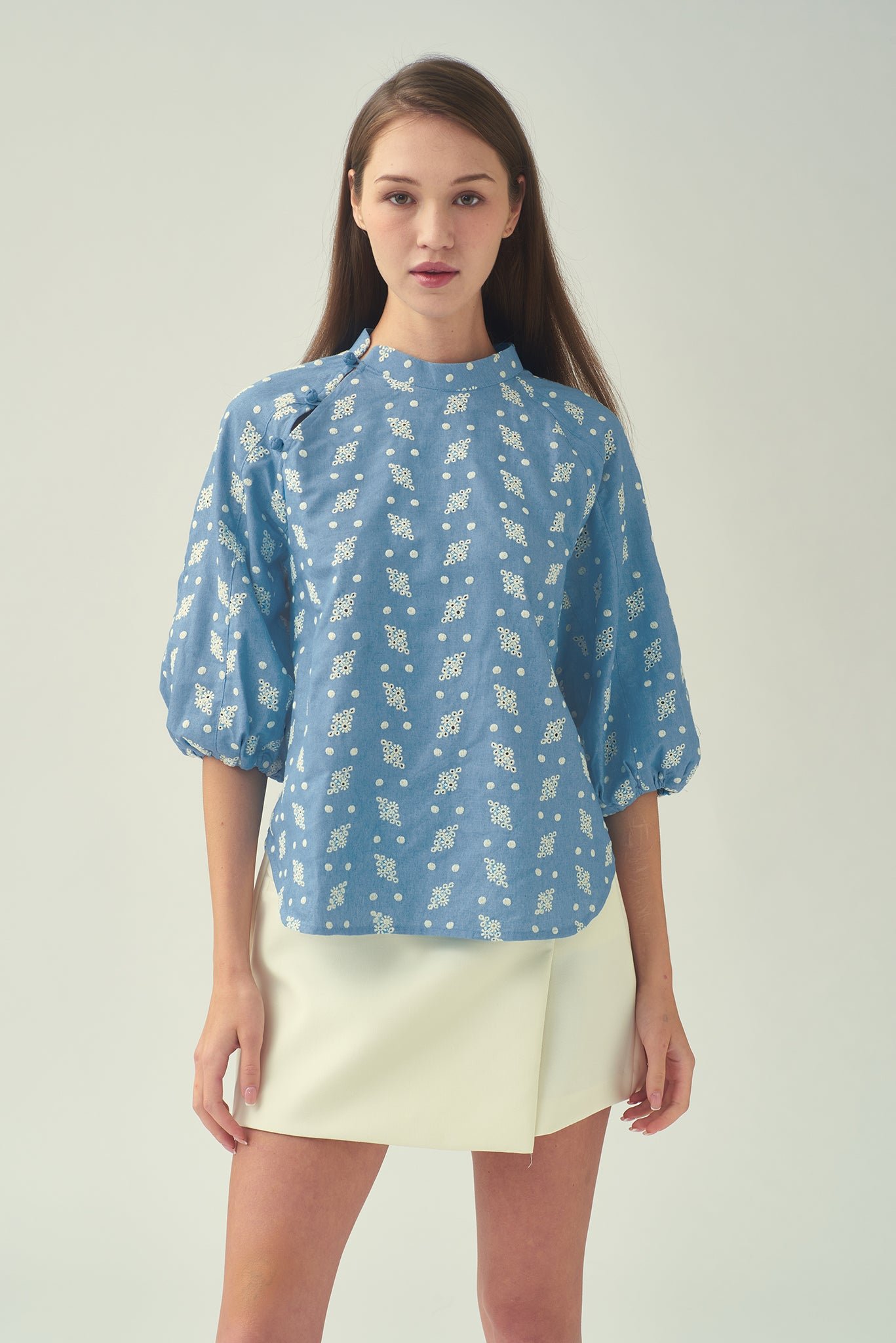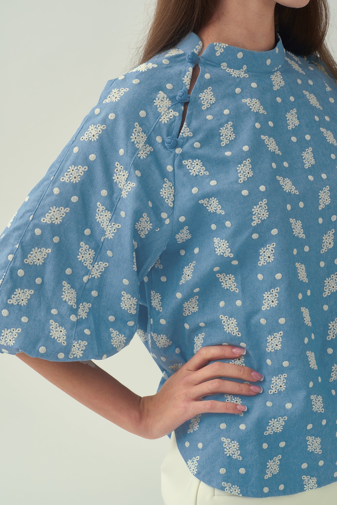 這款襯衫飾有精緻的刺繡圖案 .增添一絲清涼氣息。纖細的中式立領 .更顯其輕鬆隨興的造型。斜紋中國結紐扣環增添了獨特的中式細節。寬鬆版型 .穿著舒適;四分之一燈籠袖搭配鬆緊袖口 .打造時尚休閒的輪廓。