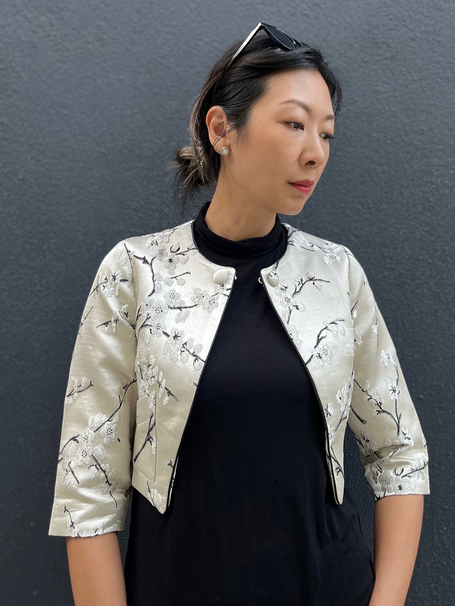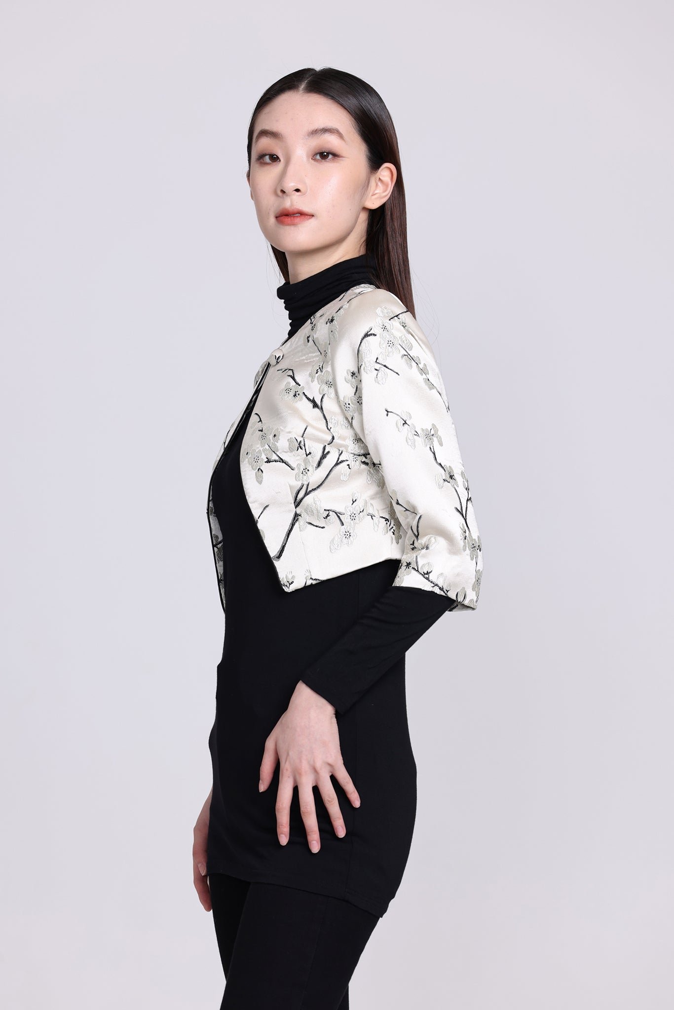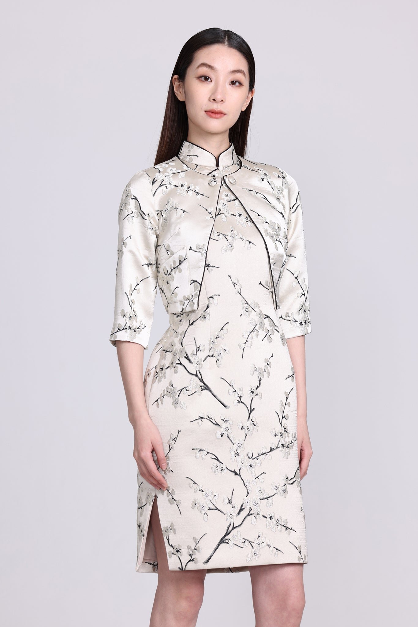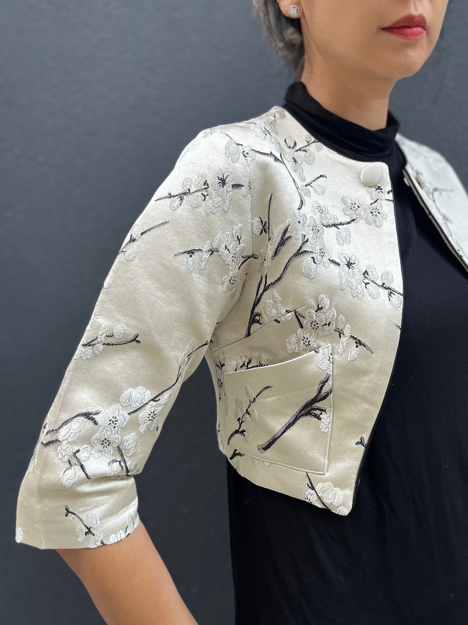 這款修身外套採用四分袖和短版剪裁 .展現時尚現代的風格。它採用東方梅花織錦面料製成 .為服裝增添了一絲優雅與文化氣息。可與PAMELA無袖旗袍搭配成套。