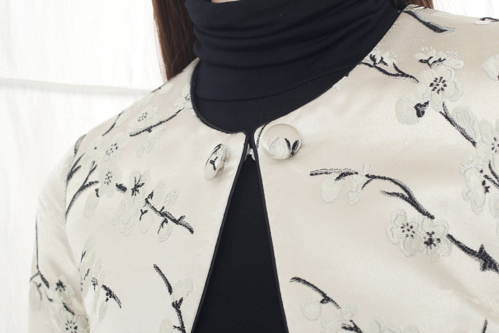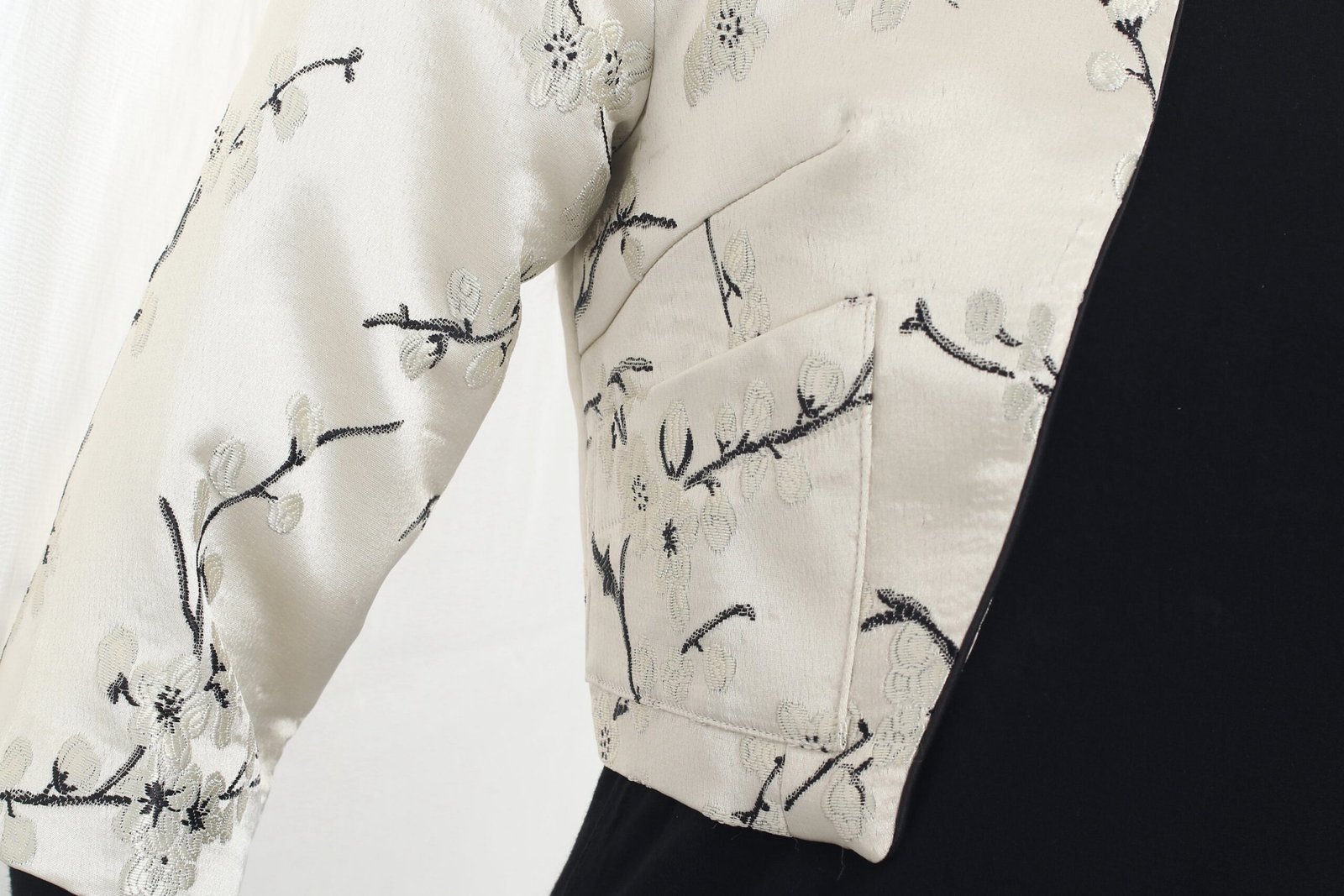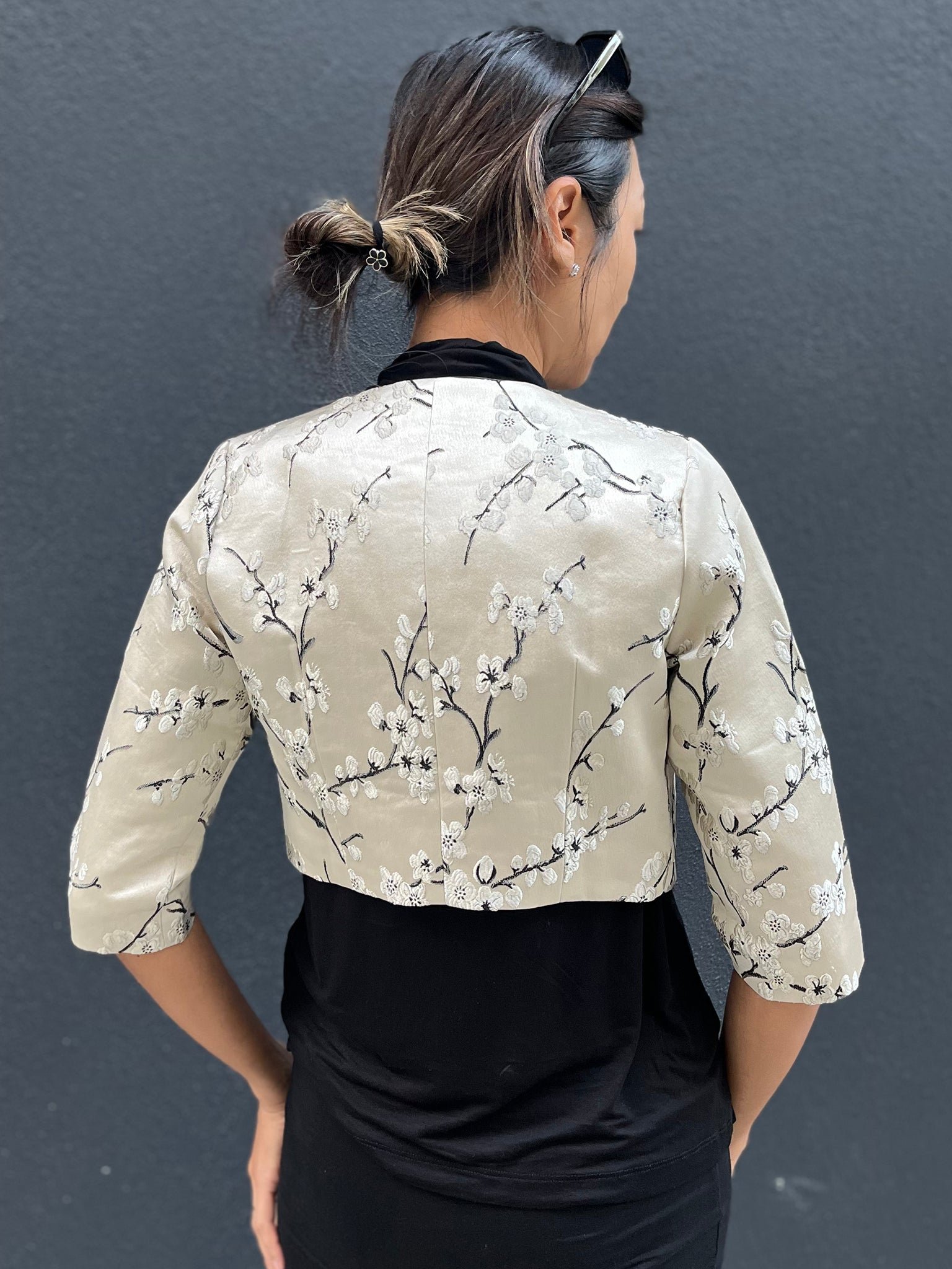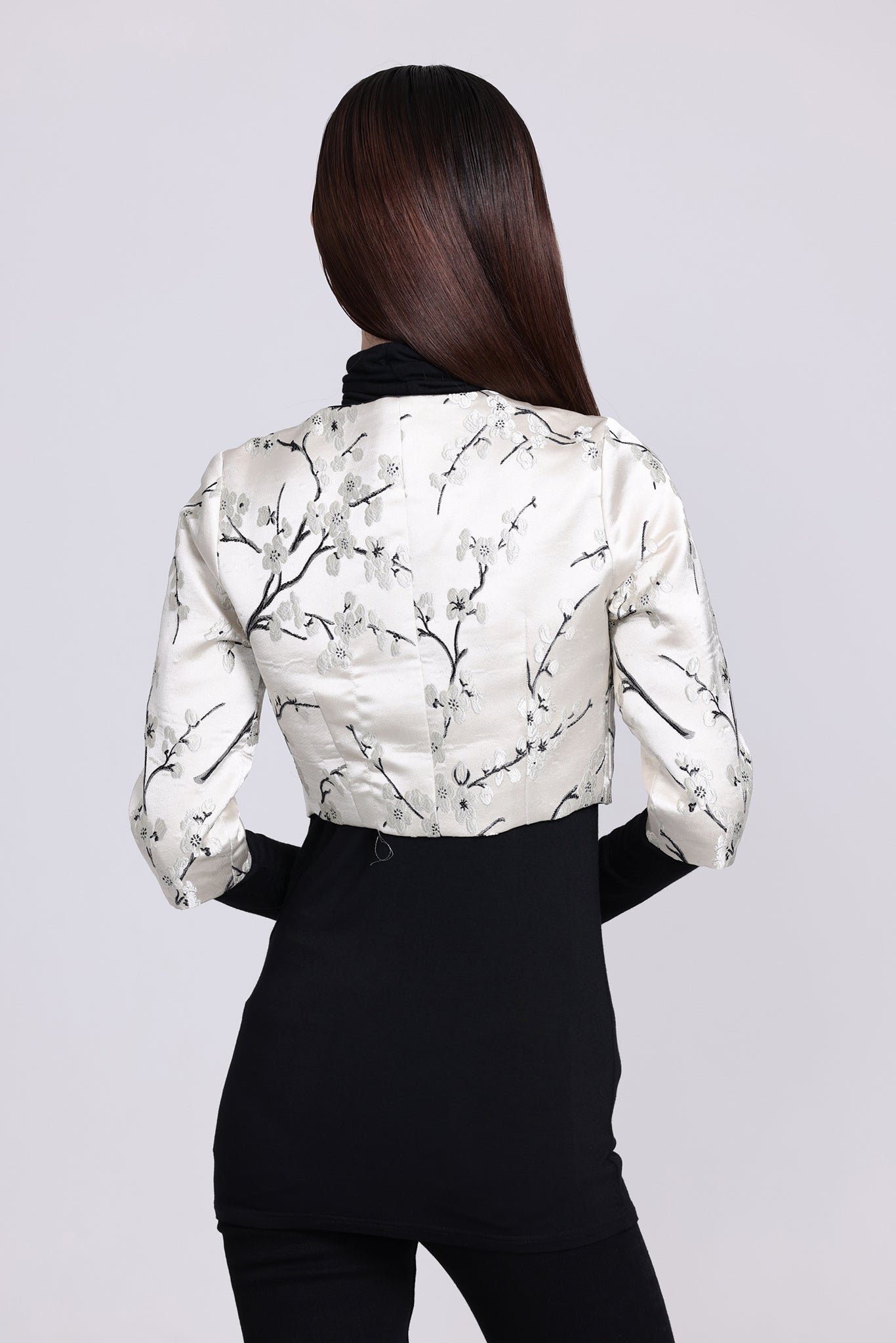 這款修身外套採用四分袖和短版剪裁 .展現時尚現代的風格。它採用東方梅花織錦面料製成 .為服裝增添了一絲優雅與文化氣息。可與PAMELA無袖旗袍搭配成套。