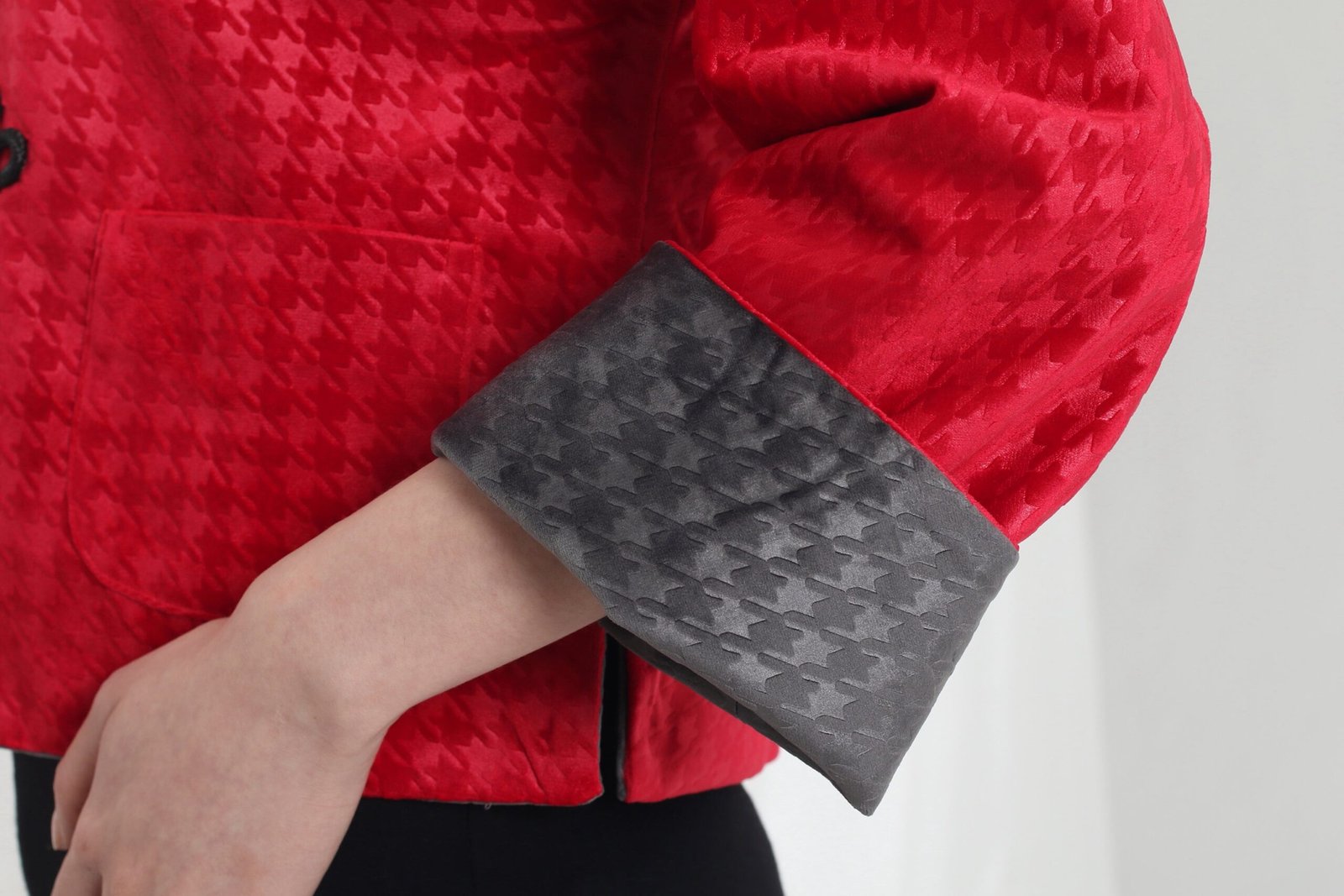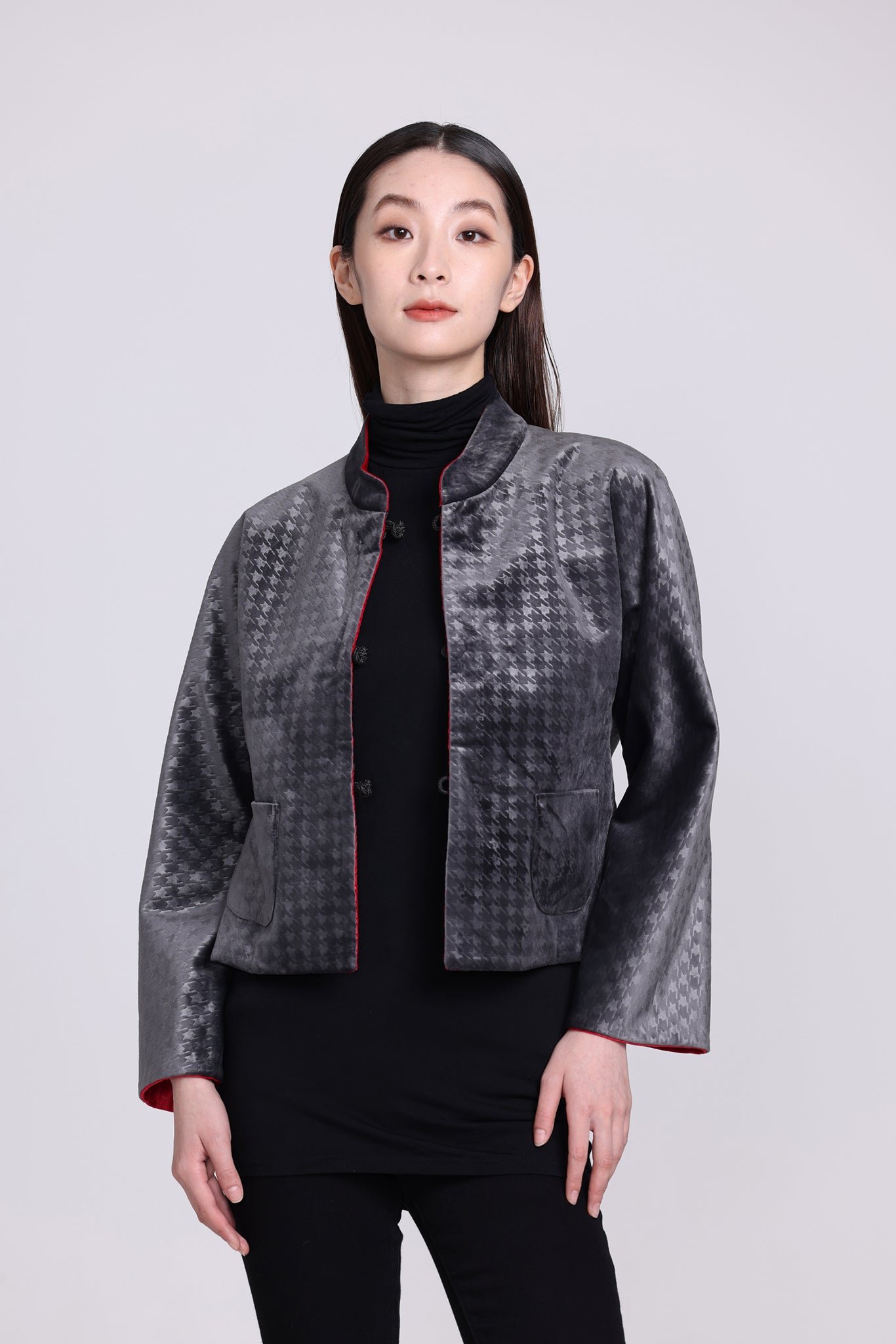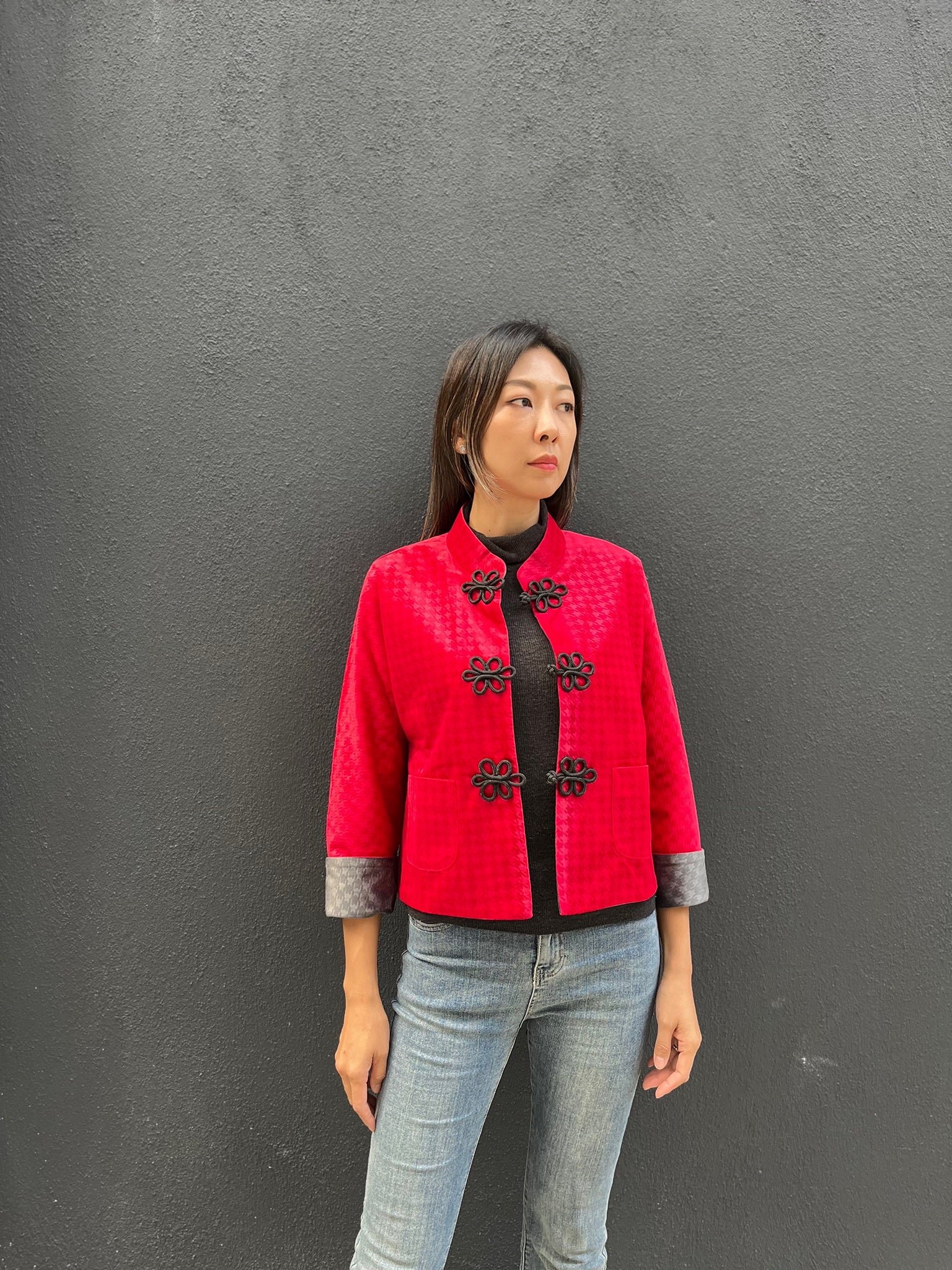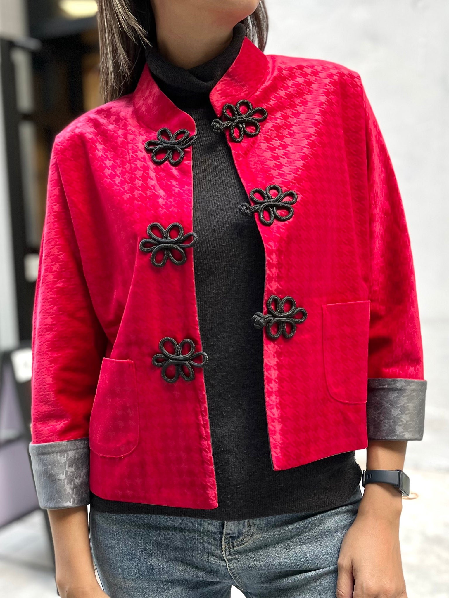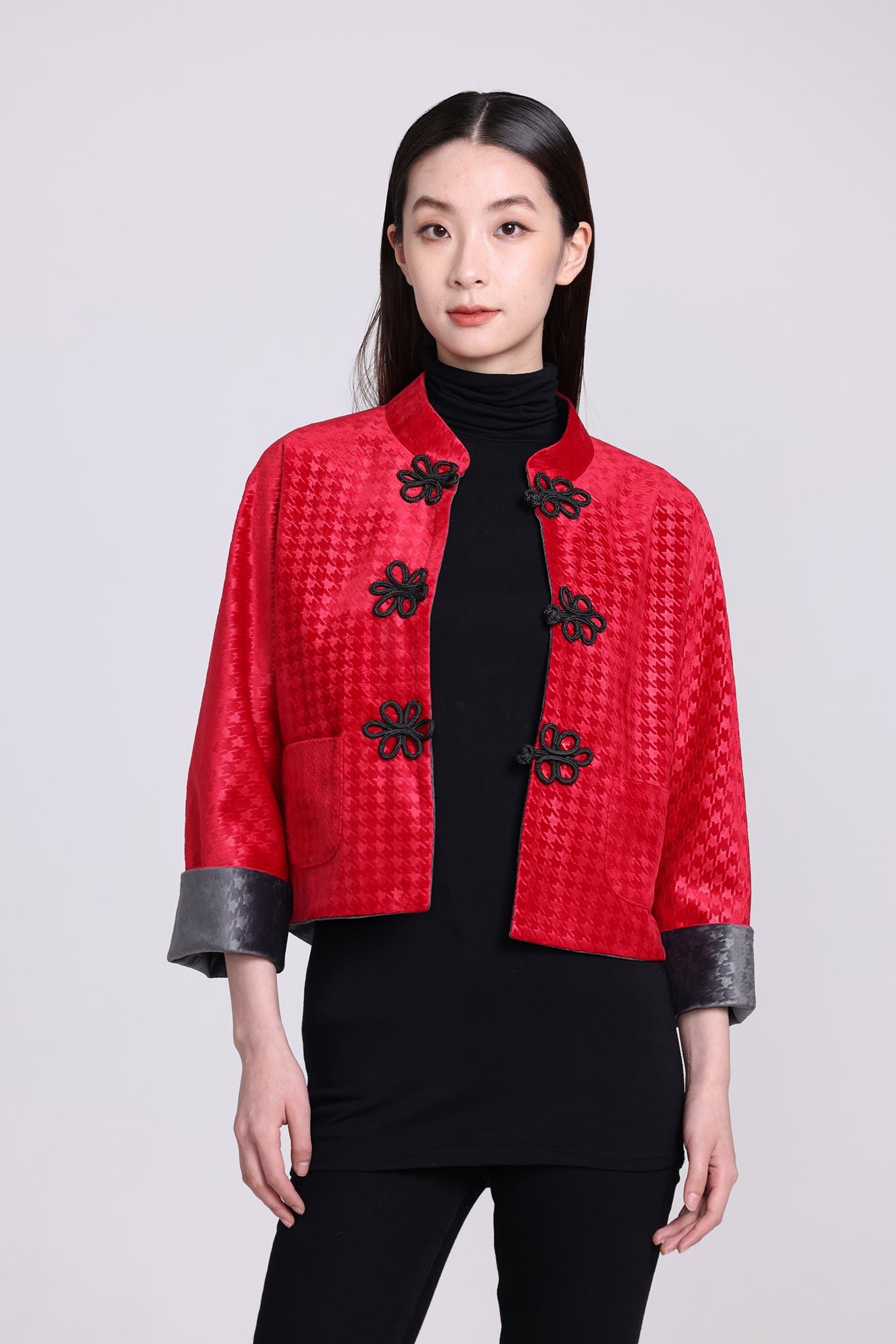 這款奢華的千鳥格紋天鵝絨雙面東方夾克 .不僅能慶祝新年 .還能提升任何社交場合的風格。其精緻的設計將傳統與現代完美融合 .喜慶的色彩更增添了一抹亮色。無論是正式聚會還是熱鬧的慶典 .這款夾克都能展現優雅精緻的氣質。擁抱季節的活力 .用這件驚豔的服飾彰顯您的個性。