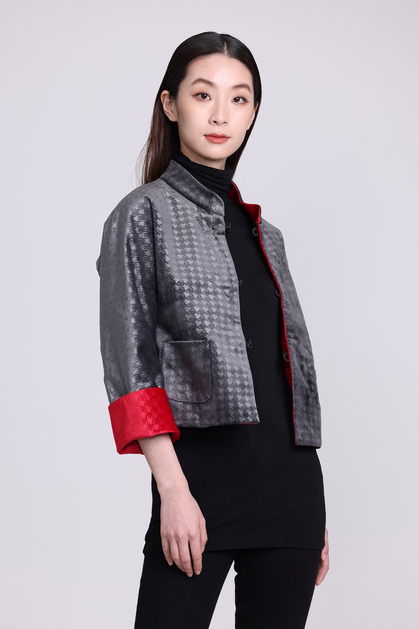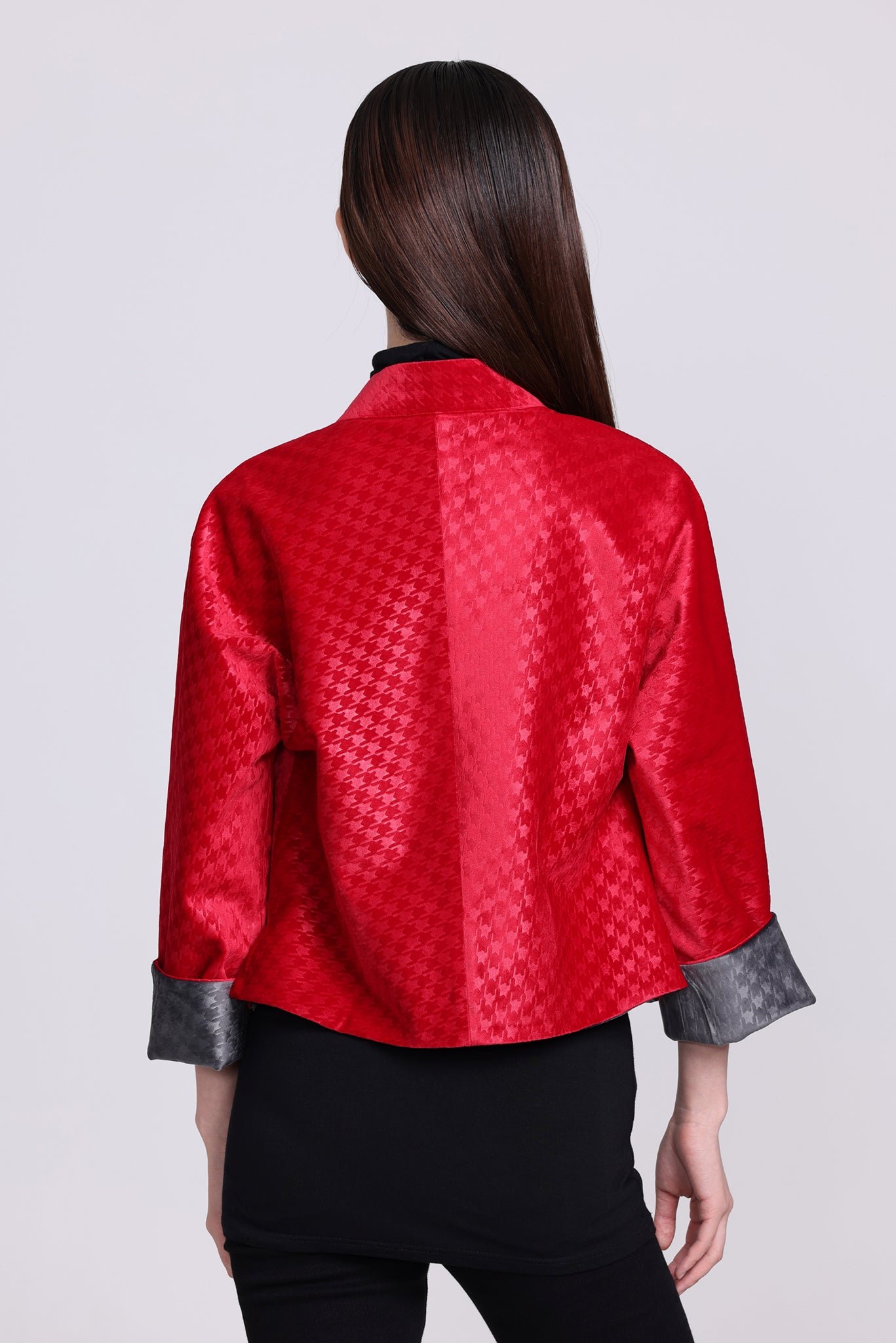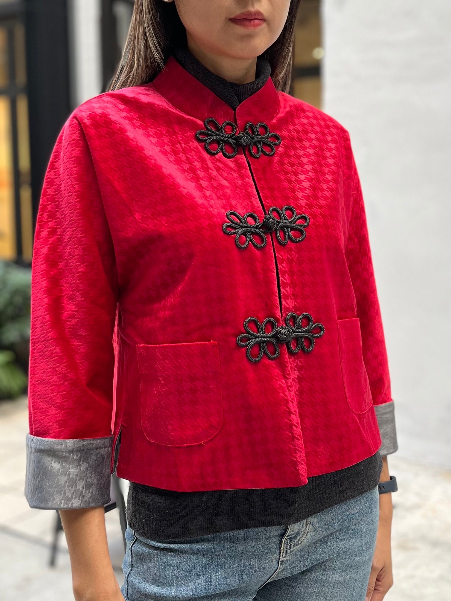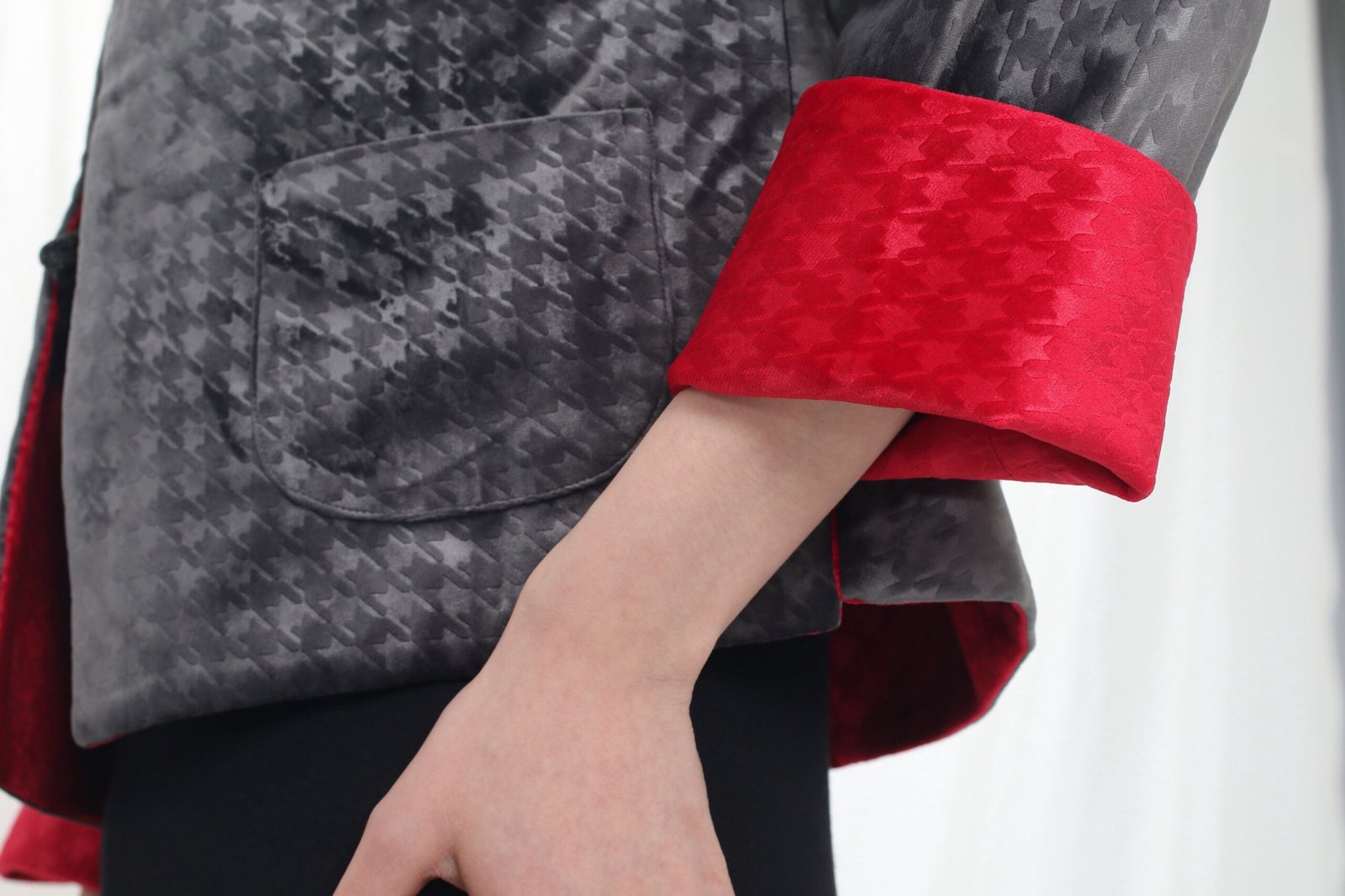 這款奢華的千鳥格紋天鵝絨雙面東方夾克 .不僅能慶祝新年 .還能提升任何社交場合的風格。其精緻的設計將傳統與現代完美融合 .喜慶的色彩更增添了一抹亮色。無論是正式聚會還是熱鬧的慶典 .這款夾克都能展現優雅精緻的氣質。擁抱季節的活力 .用這件驚豔的服飾彰顯您的個性。