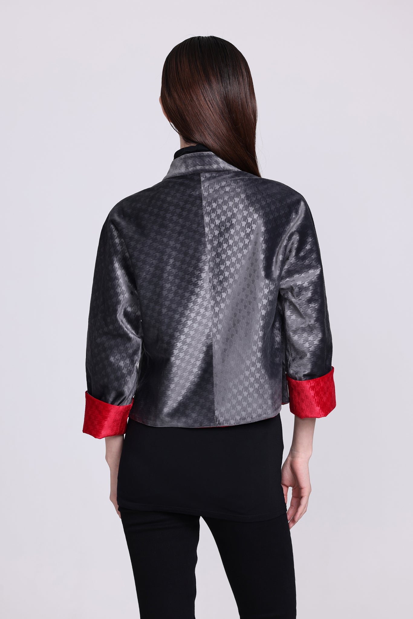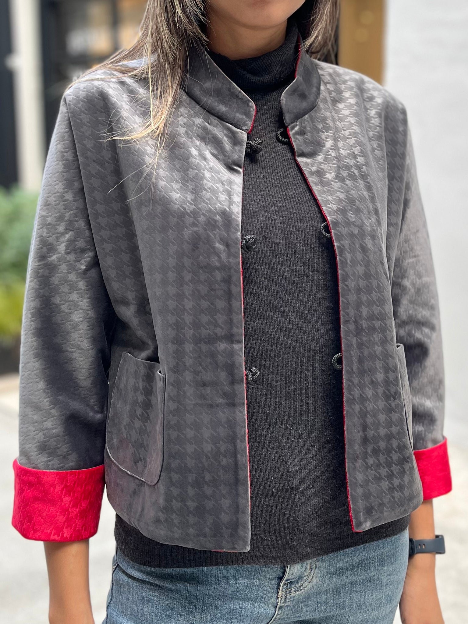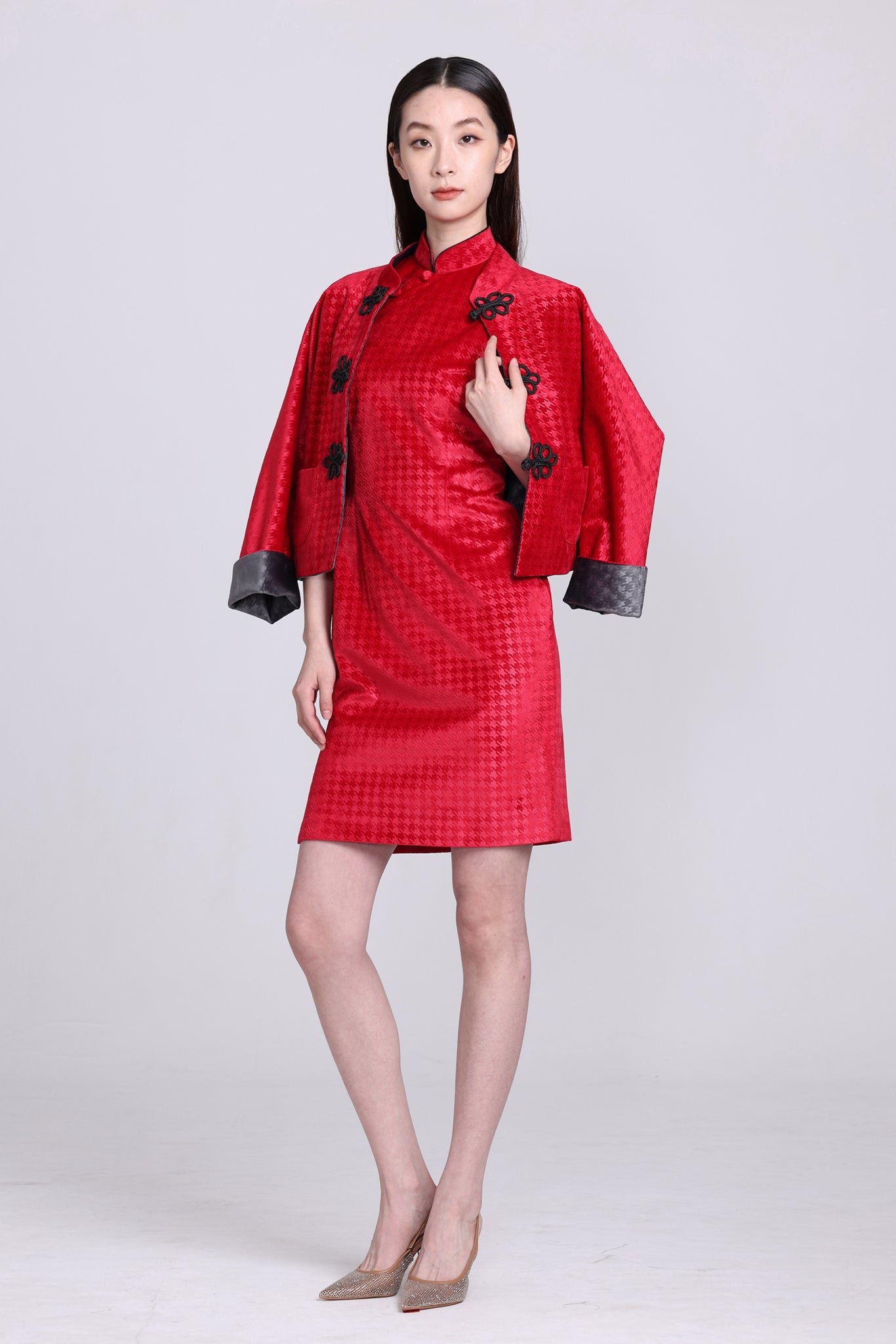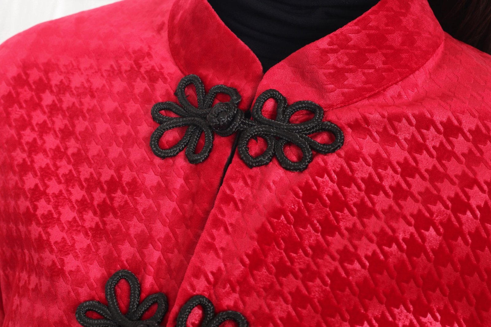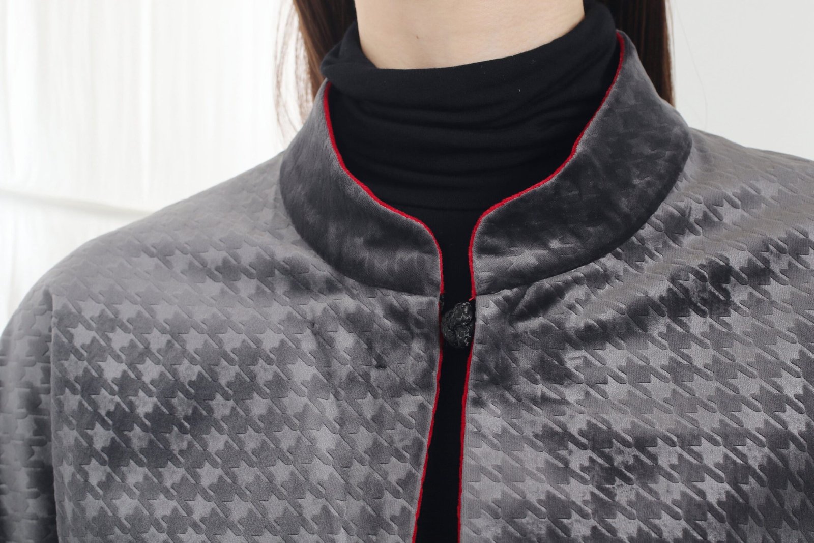 這款奢華的千鳥格紋天鵝絨雙面東方夾克 .不僅能慶祝新年 .還能提升任何社交場合的風格。其精緻的設計將傳統與現代完美融合 .喜慶的色彩更增添了一抹亮色。無論是正式聚會還是熱鬧的慶典 .這款夾克都能展現優雅精緻的氣質。擁抱季節的活力 .用這件驚豔的服飾彰顯您的個性。