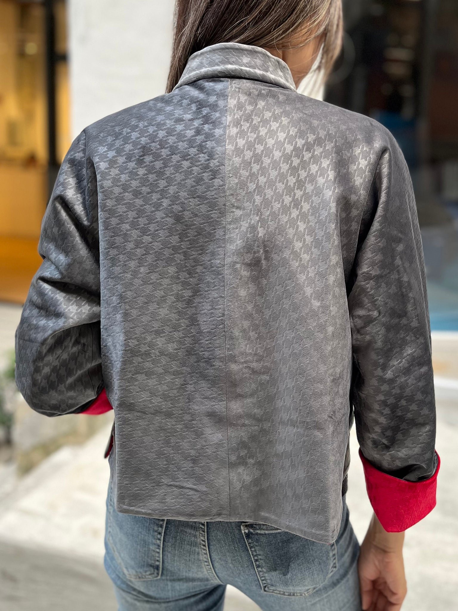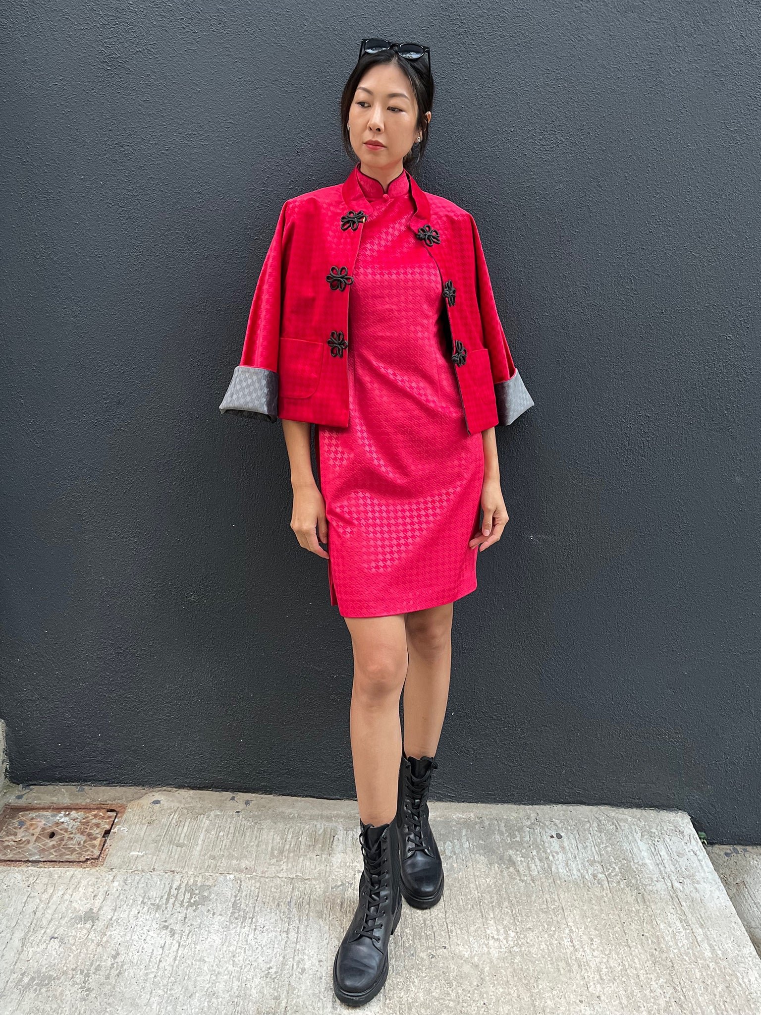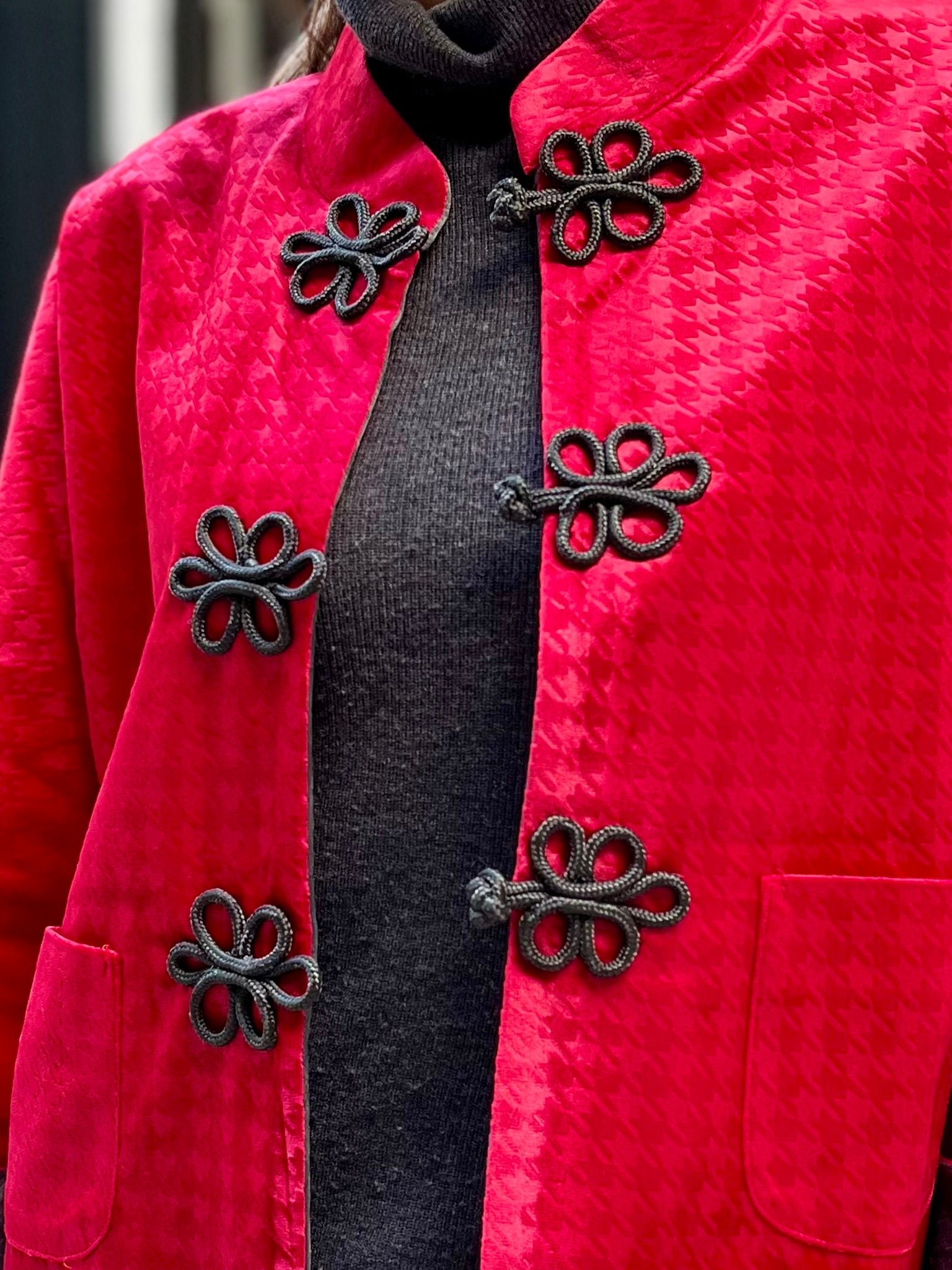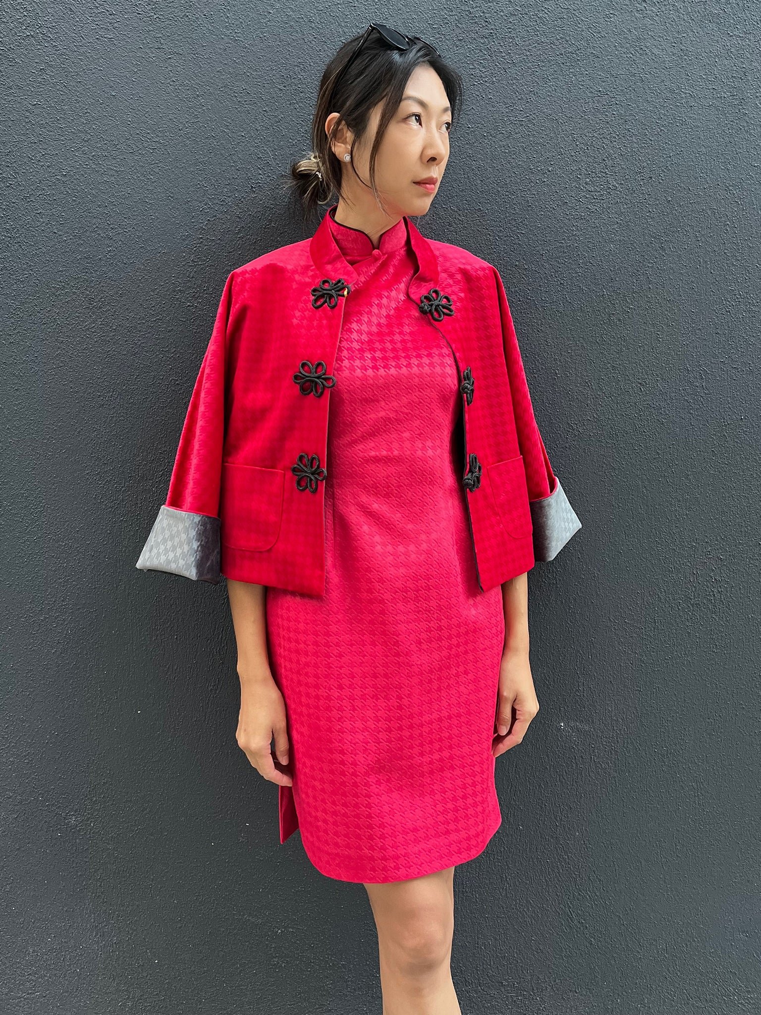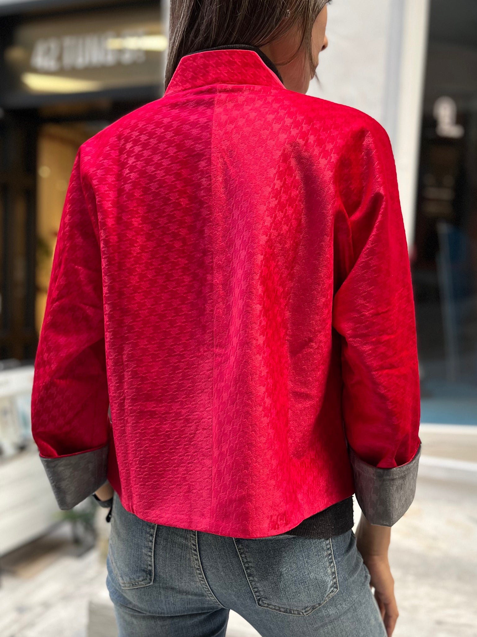 這款奢華的千鳥格紋天鵝絨雙面東方夾克 .不僅能慶祝新年 .還能提升任何社交場合的風格。其精緻的設計將傳統與現代完美融合 .喜慶的色彩更增添了一抹亮色。無論是正式聚會還是熱鬧的慶典 .這款夾克都能展現優雅精緻的氣質。擁抱季節的活力 .用這件驚豔的服飾彰顯您的個性。
