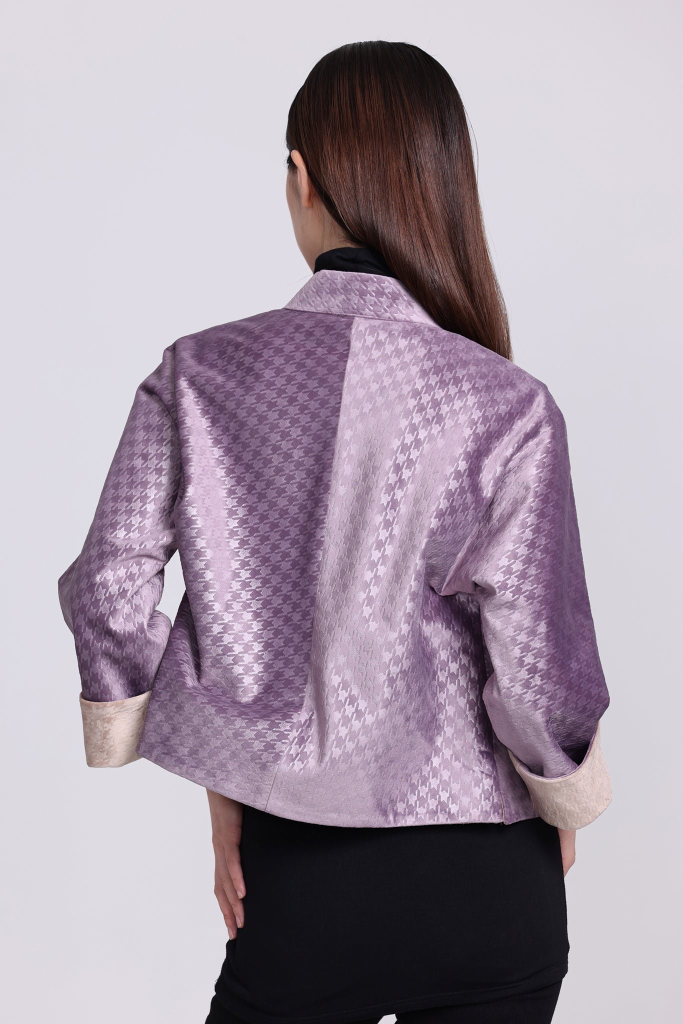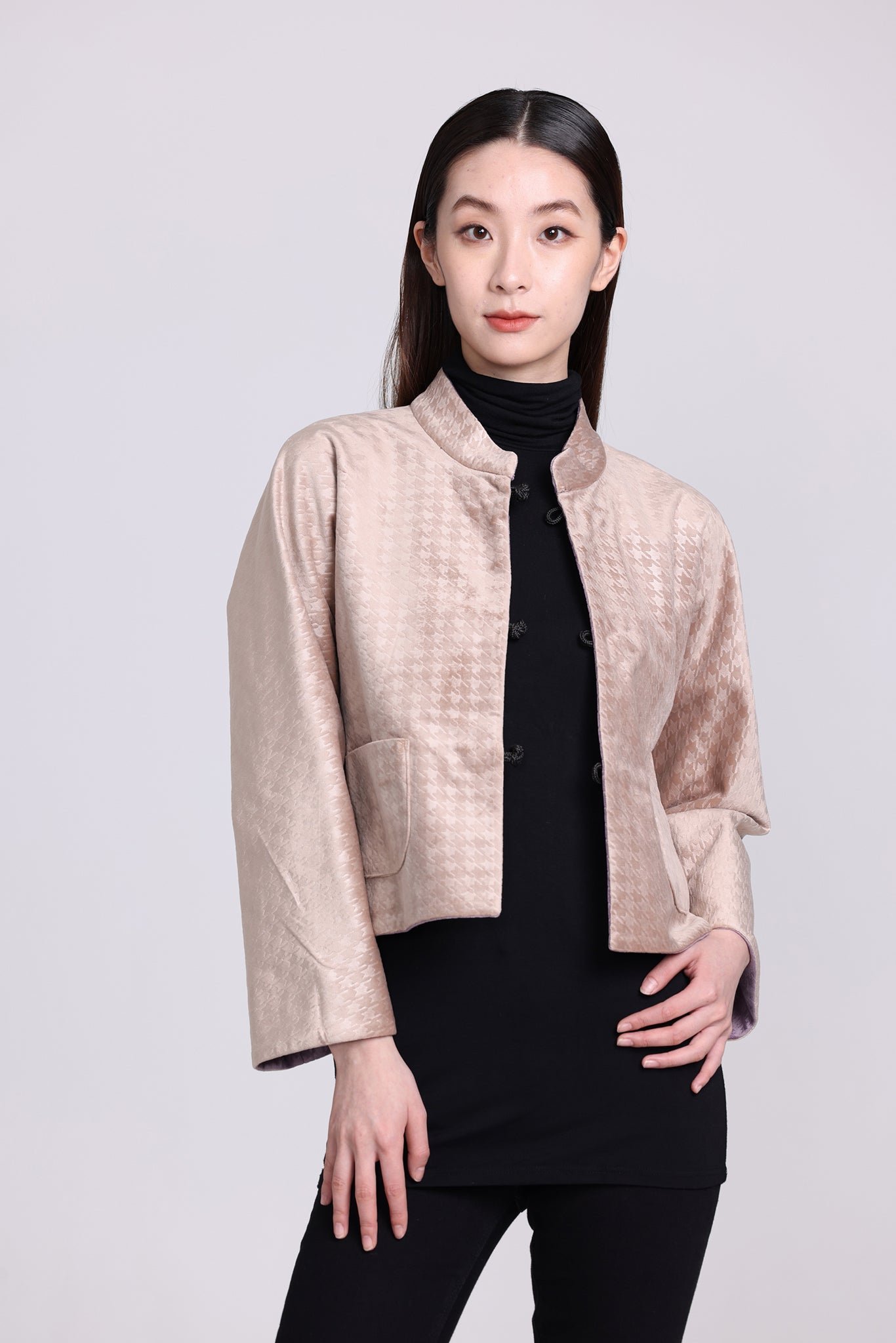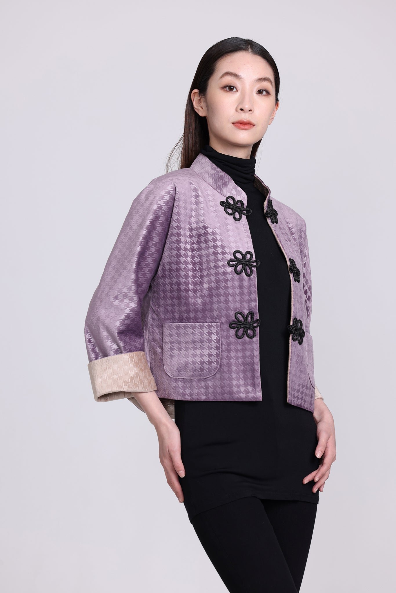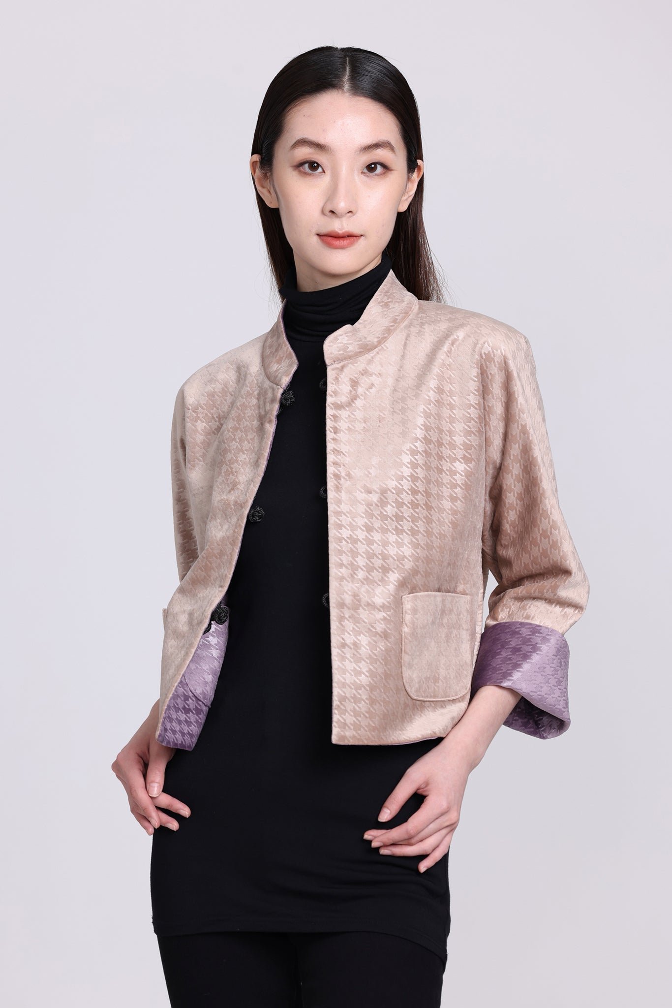 這款奢華的千鳥格紋天鵝絨雙面東方夾克 .不僅能慶祝新年 .還能提升任何社交場合的風格。其精緻的設計將傳統與現代完美融合 .喜慶的色彩更增添了一抹亮色。無論是正式聚會還是熱鬧的慶典 .這款夾克都能展現優雅精緻的氣質。擁抱季節的活力 .用這件驚豔的服飾彰顯您的個性。