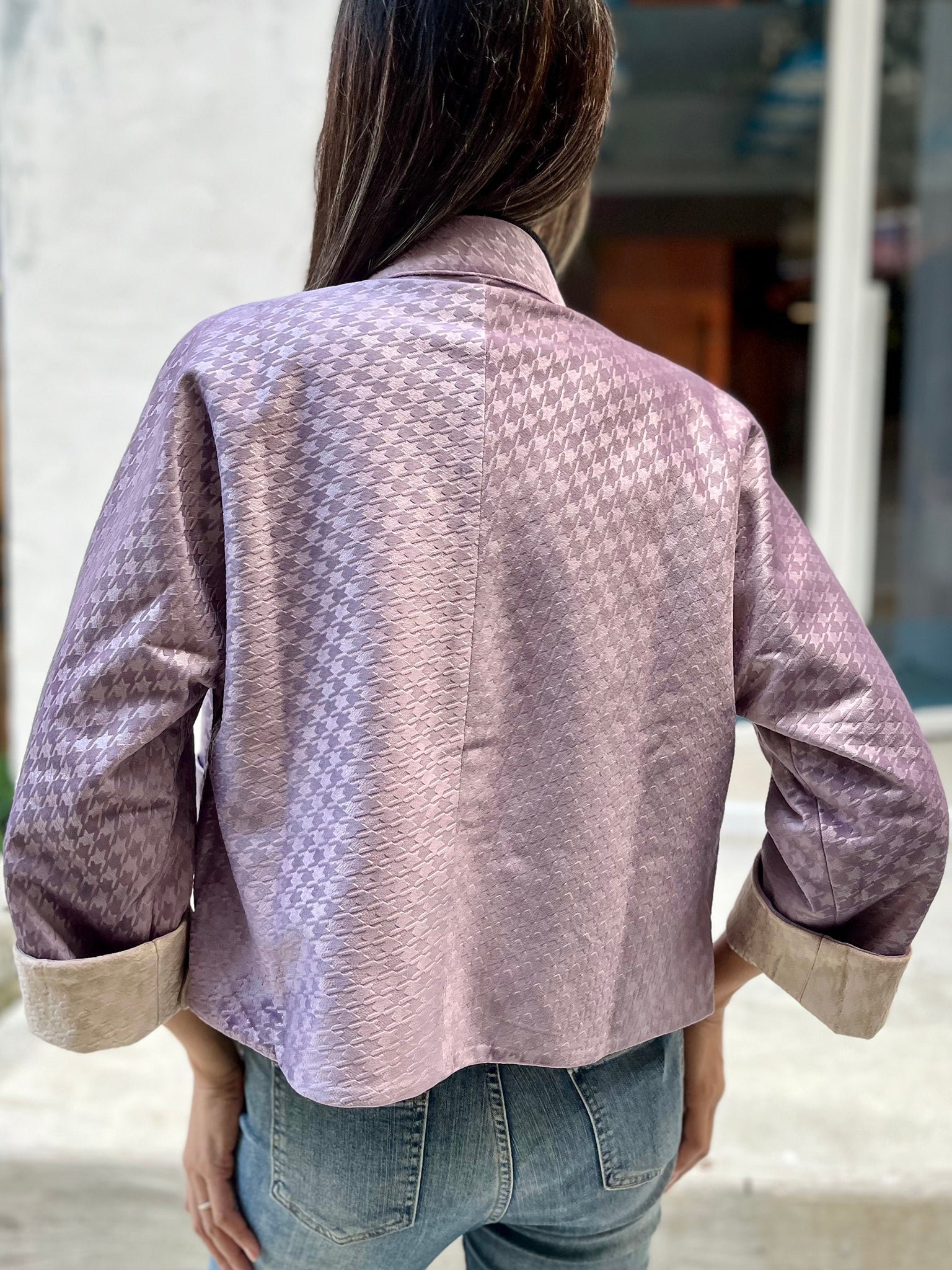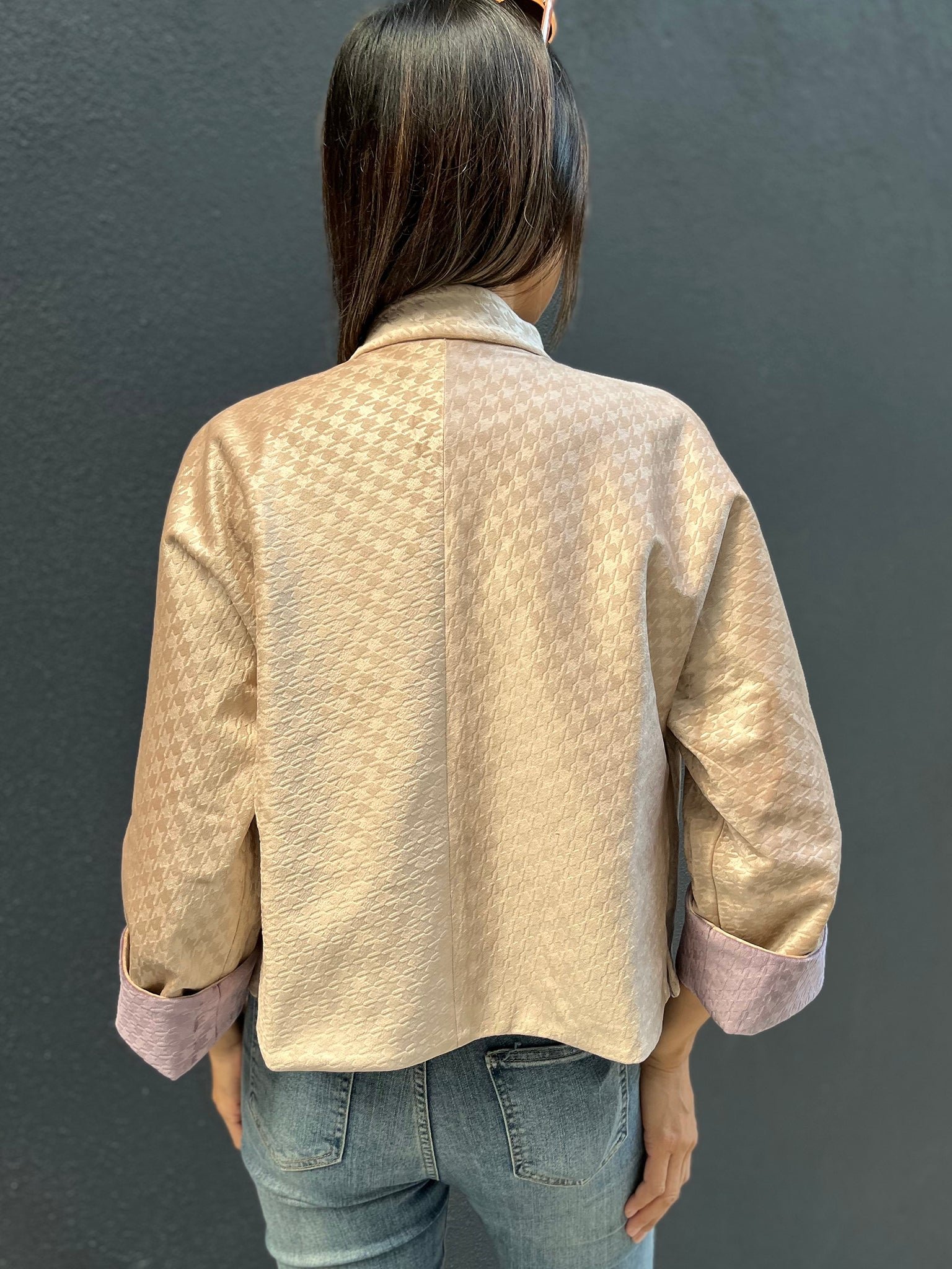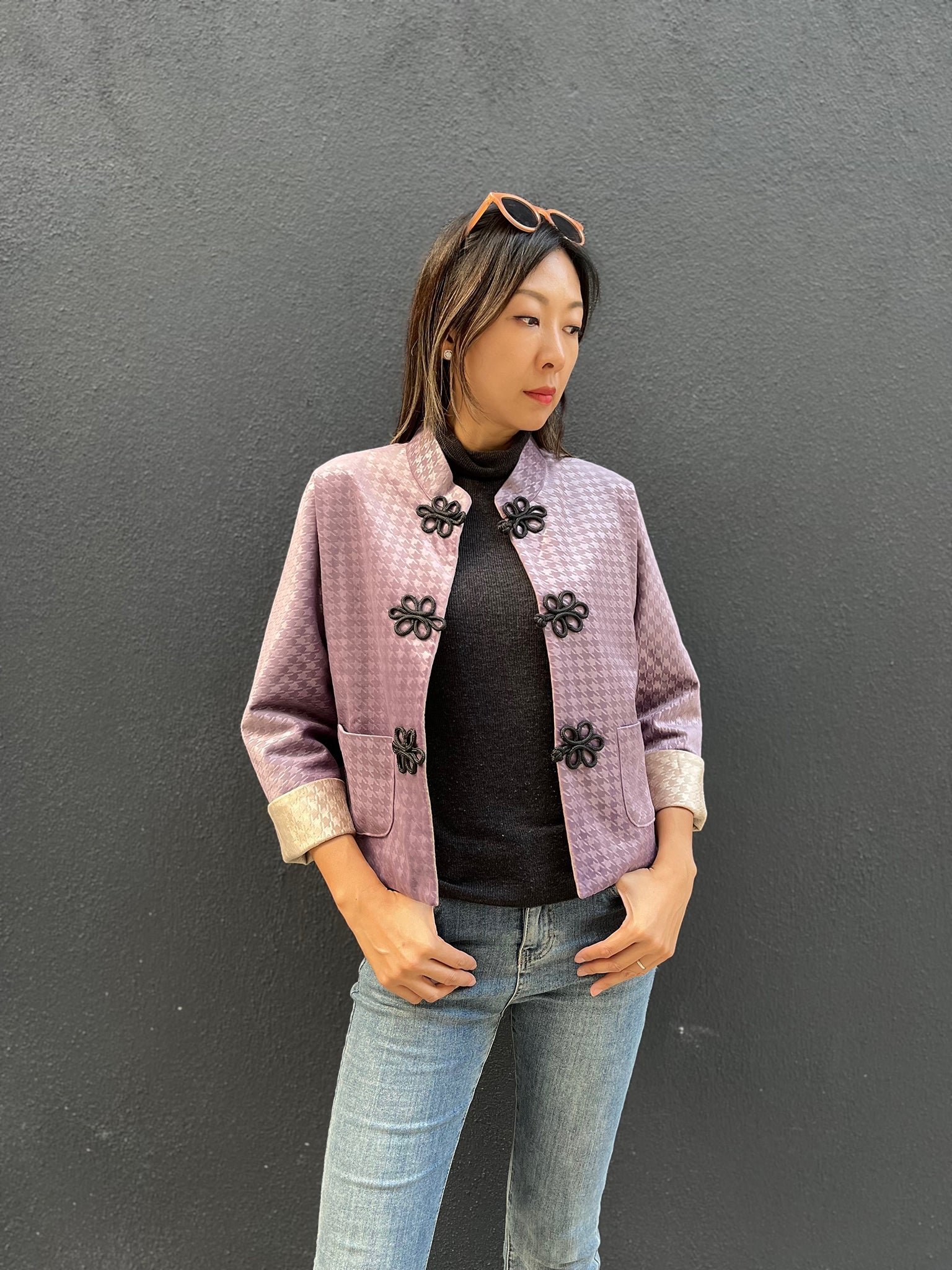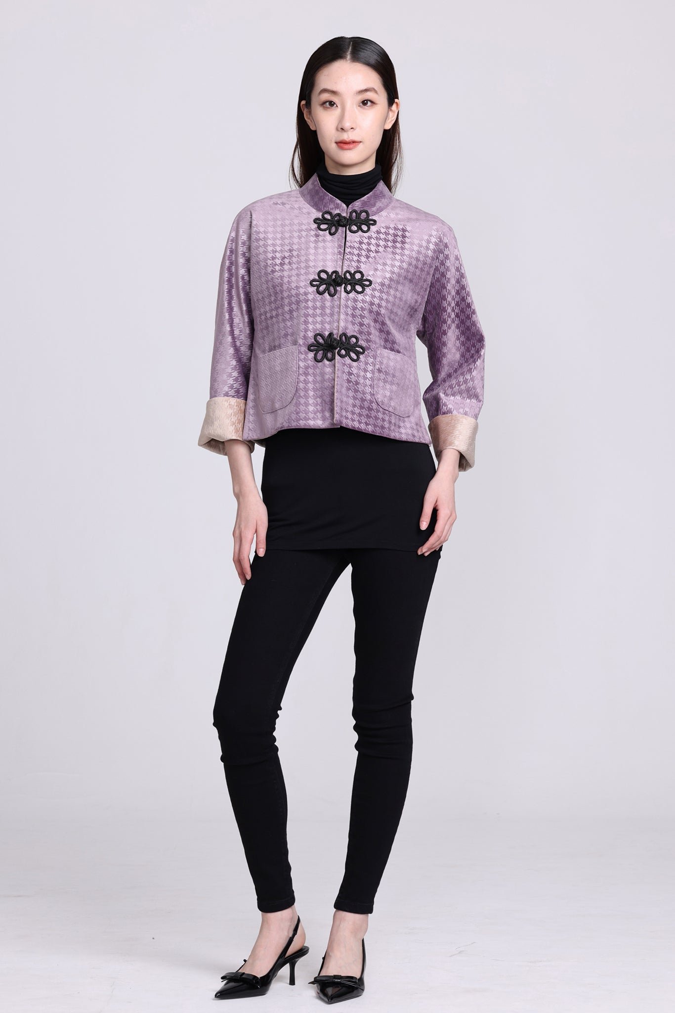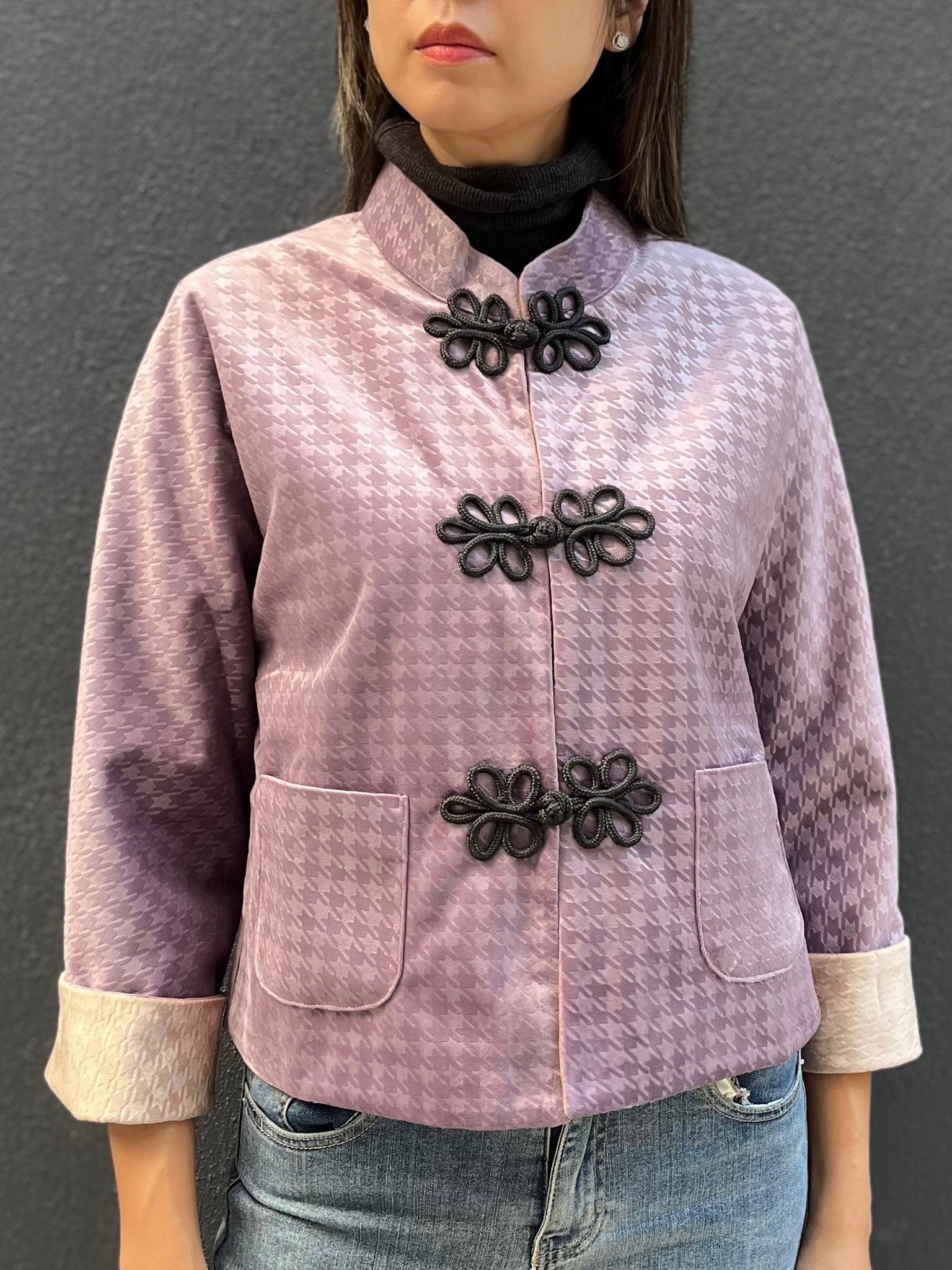 這款奢華的千鳥格紋天鵝絨雙面東方夾克 .不僅能慶祝新年 .還能提升任何社交場合的風格。其精緻的設計將傳統與現代完美融合 .喜慶的色彩更增添了一抹亮色。無論是正式聚會還是熱鬧的慶典 .這款夾克都能展現優雅精緻的氣質。擁抱季節的活力 .用這件驚豔的服飾彰顯您的個性。