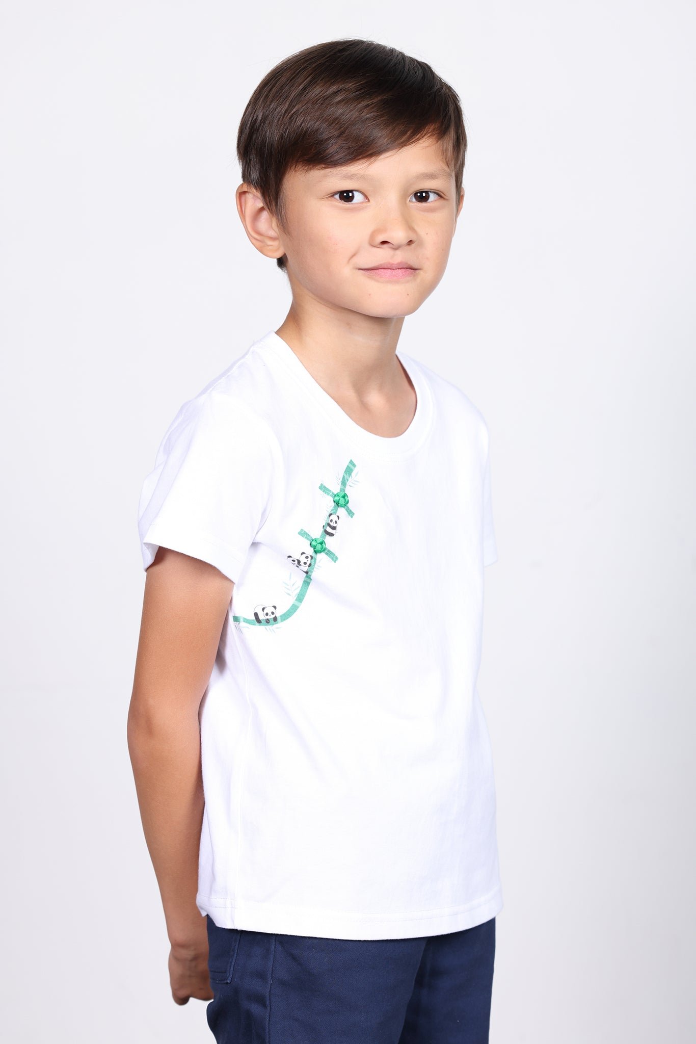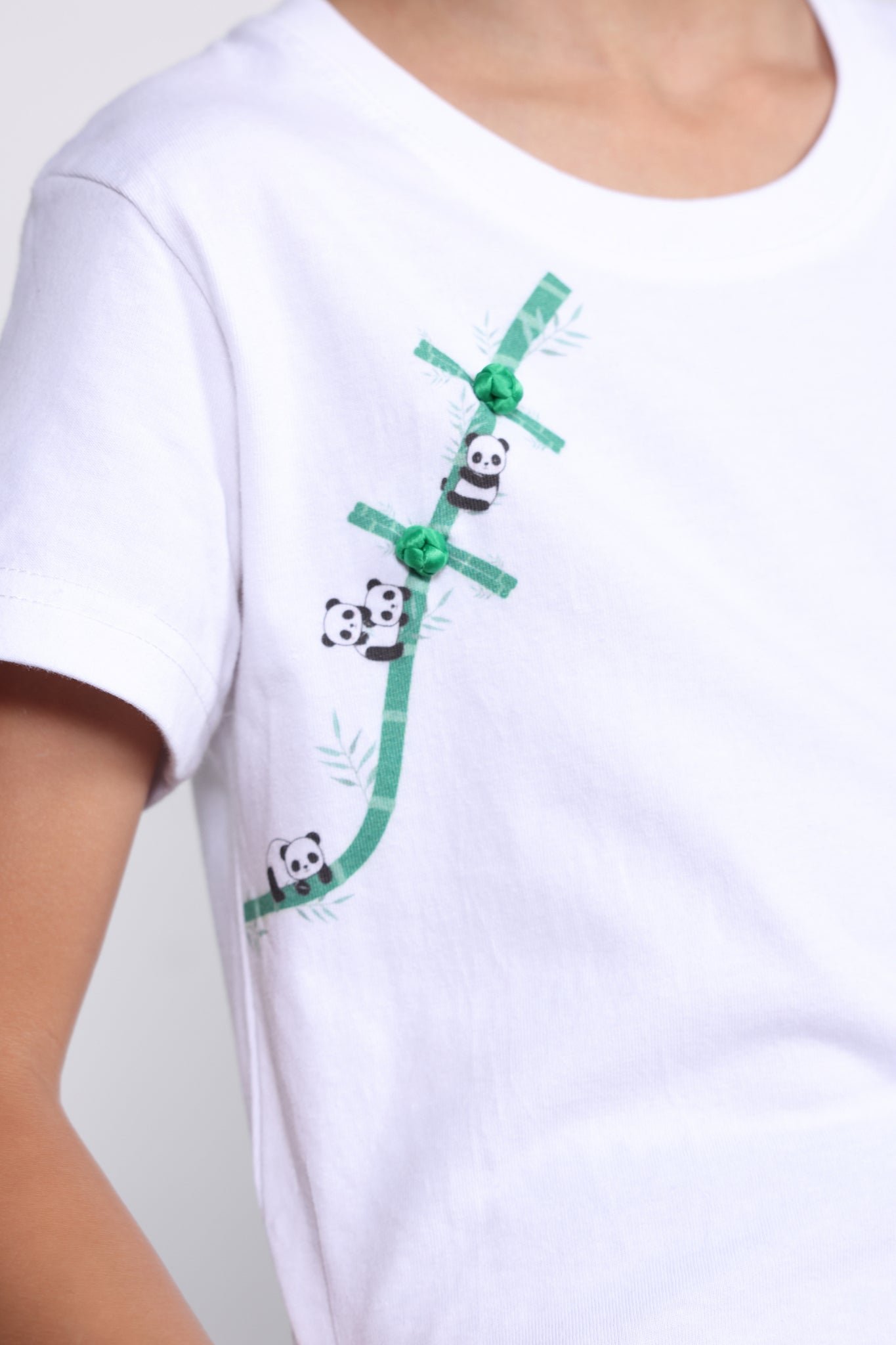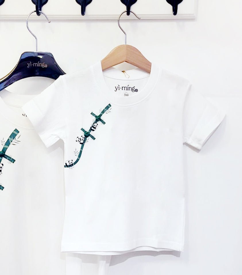 這款男女通用的白色T卹採用舒適的100%純棉布料 .剪裁標準 .是時尚之選。它採用迷人的錯視印花 .展現了竹子前襟和精緻的中國結圖案。可愛的熊貓俏皮地裝飾著竹子 .營造出可愛的設計。襯衫上縫有兩顆手工製作的中國結扣。它完美地打造了協調一致的造型 .可以與媽媽版的搭配 .打造一套令人愉悅的家庭套裝。