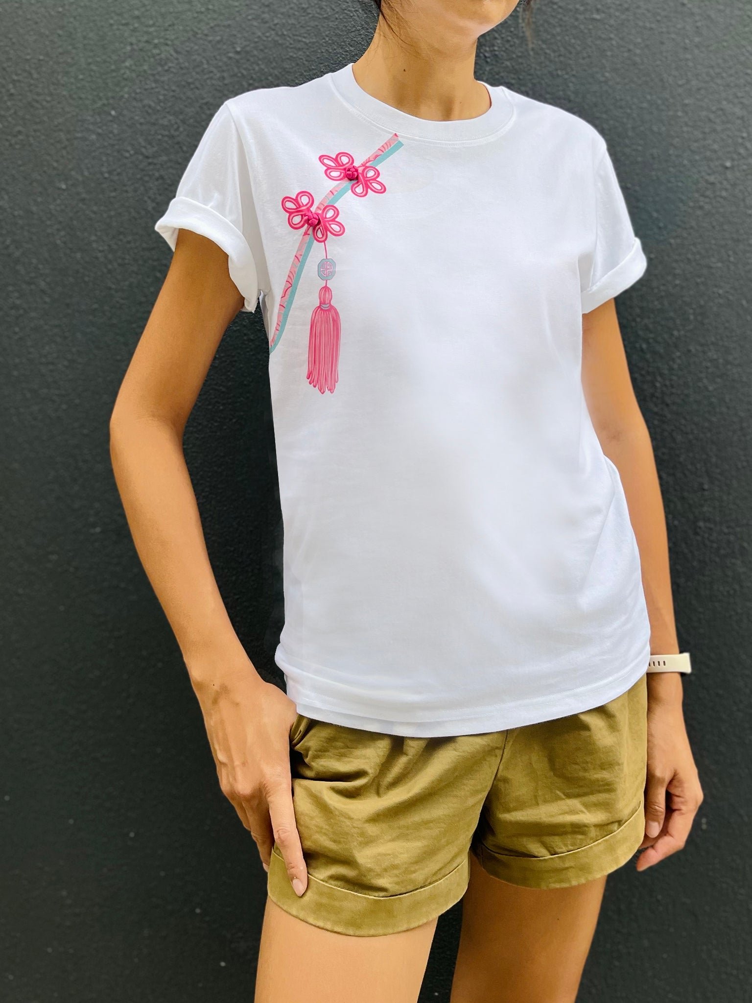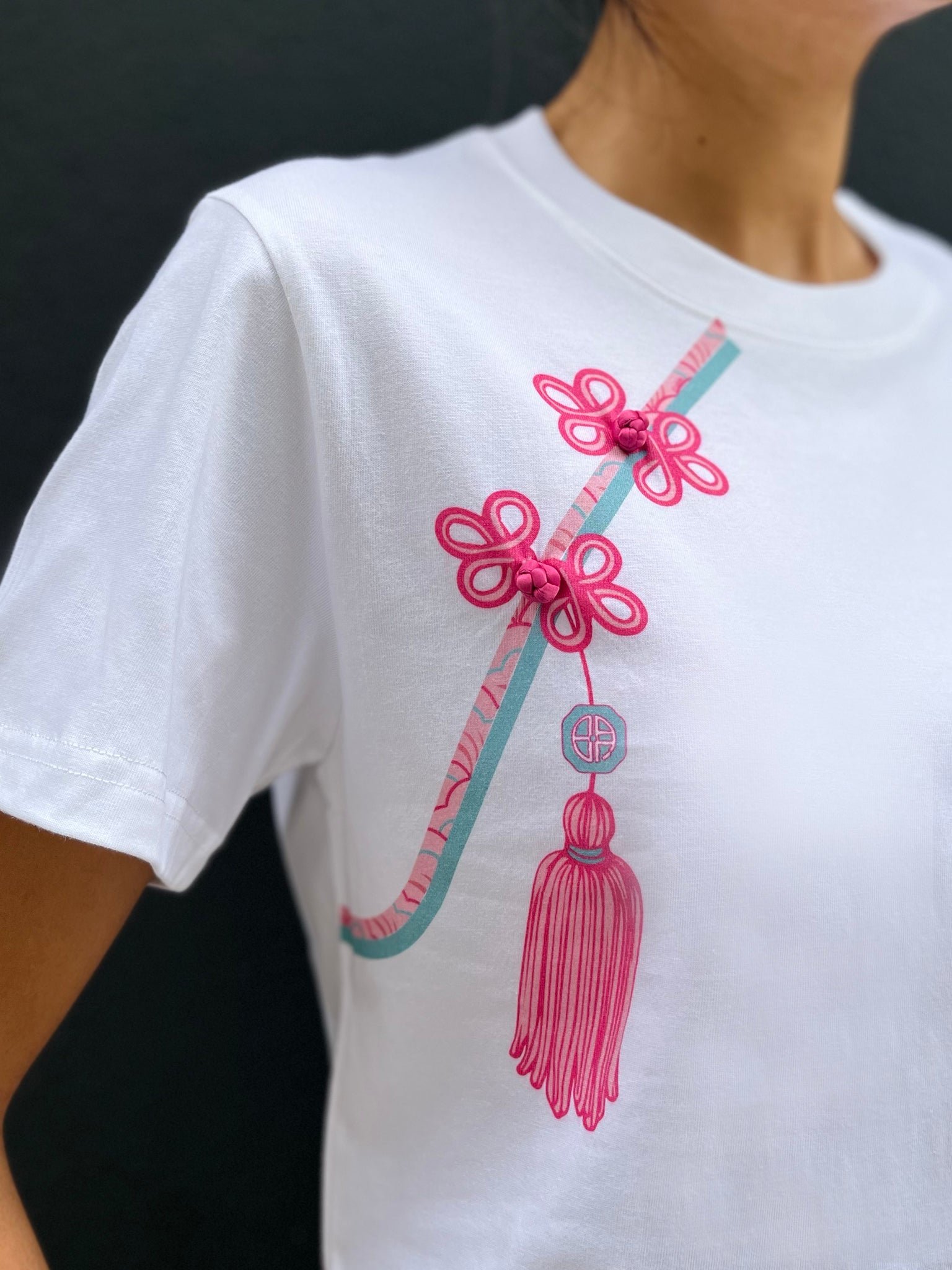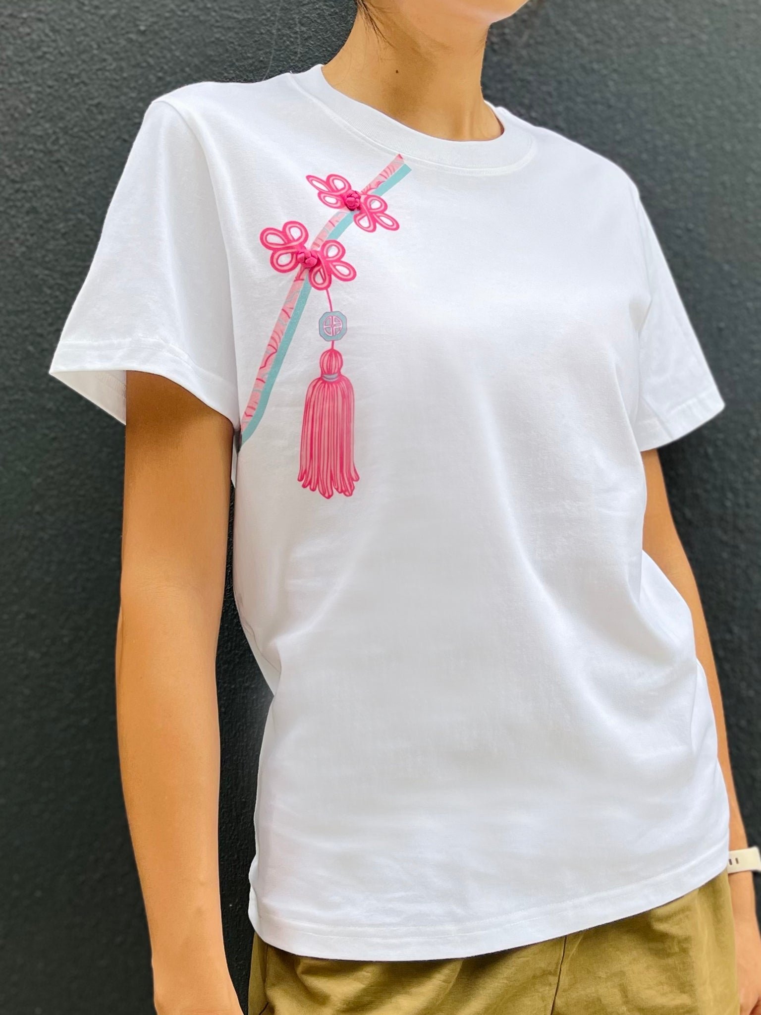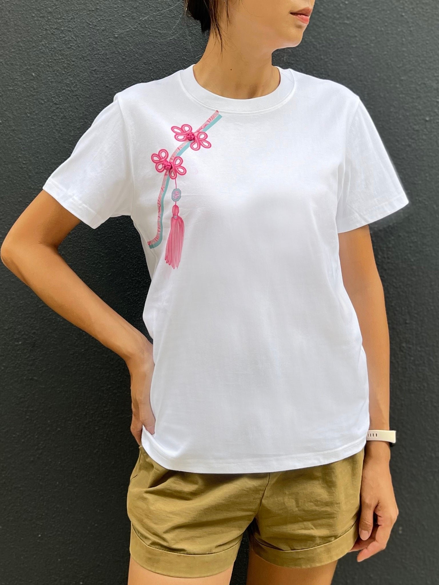 隆重介紹我們的白色棉質T卹 .經典衣櫃必備單品 .卻又別具一格。這款T卹採用棉質布料 .帶來極致舒適體驗 .並以錯視畫法呈現前翻蓋開口、中式扣環和流蘇。為了增添一絲古樸的韻味 .我們還在T恤上縫製了三顆純手工縫製的中國結扣。這款吸睛單品 .定能為您的休閒裝扮錦上添花。
